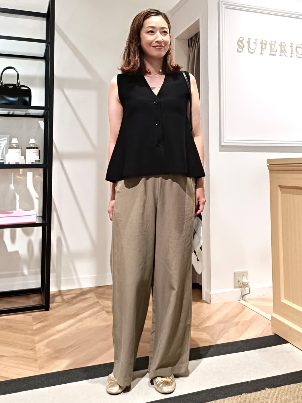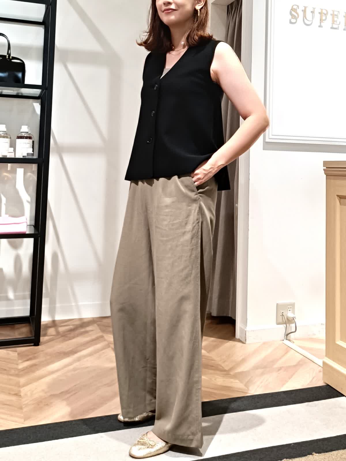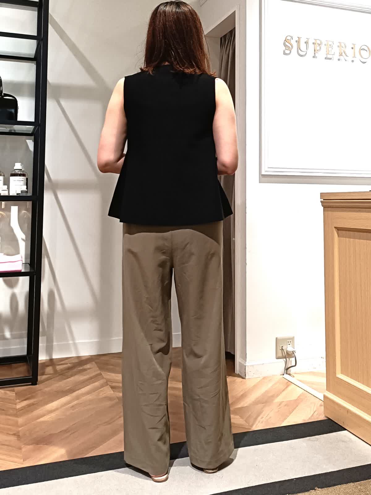 【着用サイズ:カラー】ニット:9号:ブラック パンツ:11号:カーキ ニットジレは1枚着からインナーを変えることでジャスト?冬直前まで着られる優秀アイテム。程よい裾の広がりがスタイルアップ効果に。 パンツもイチオシのイージーパンツで、セミワイドシルエットが脚長効果を演出してくれて、ウエストゴムのドロスト付きで履き着心地も抜群です。リラックスしながらスッキリ見える大人カジュアルコーディネートにしてみました。