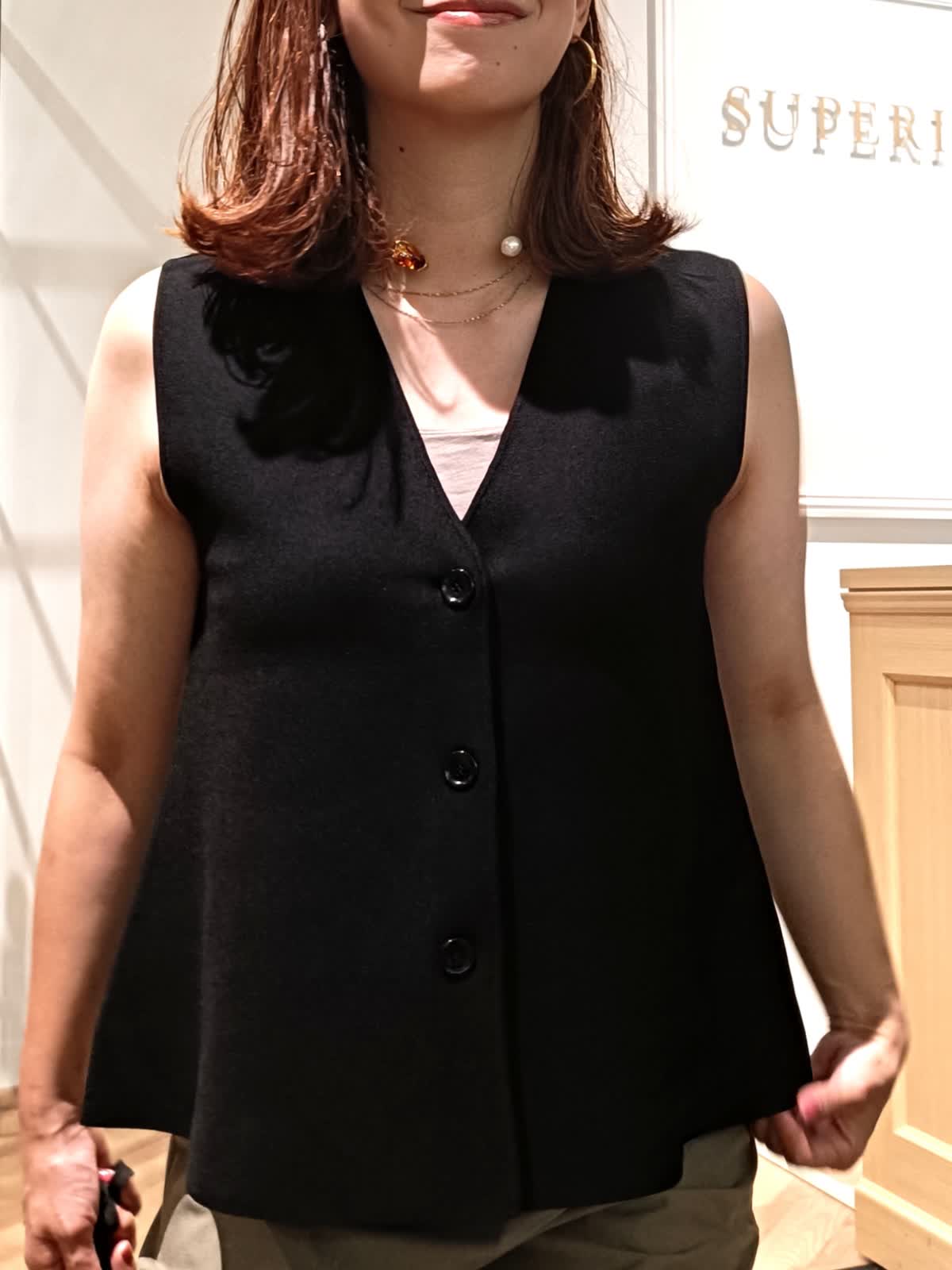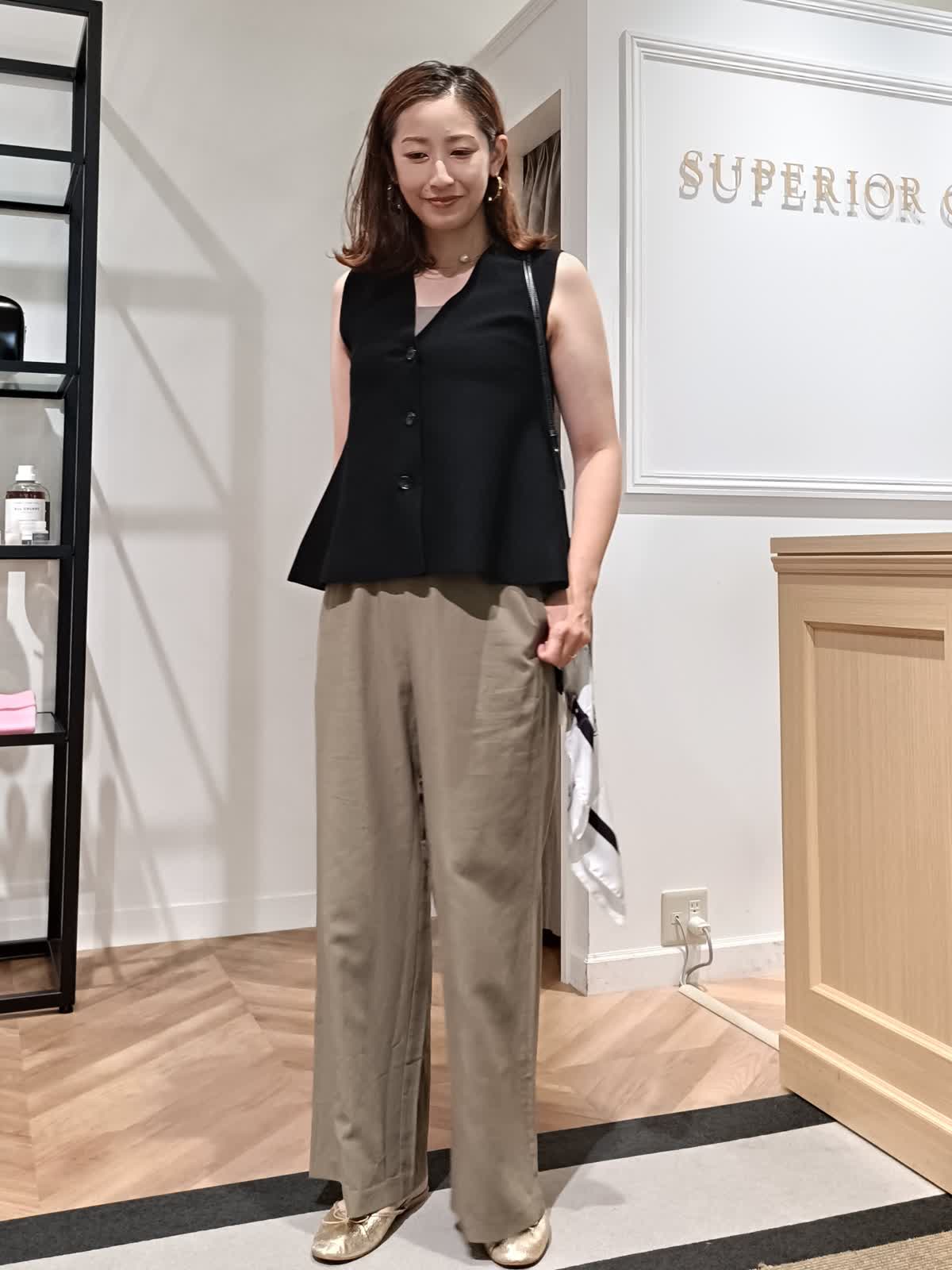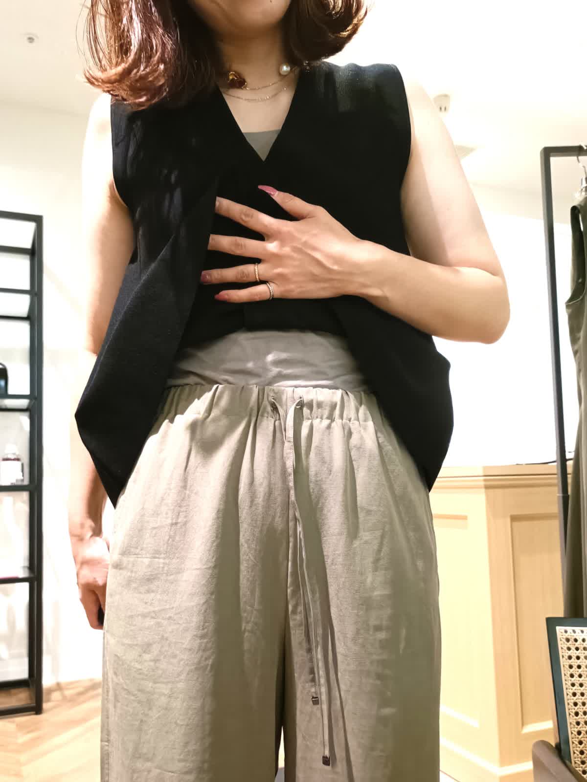 【着用サイズ:カラー】ニット:9号:ブラック パンツ:11号:カーキ ニットジレは1枚着からインナーを変えることでジャスト?冬直前まで着られる優秀アイテム。程よい裾の広がりがスタイルアップ効果に。 パンツもイチオシのイージーパンツで、セミワイドシルエットが脚長効果を演出してくれて、ウエストゴムのドロスト付きで履き着心地も抜群です。リラックスしながらスッキリ見える大人カジュアルコーディネートにしてみました。