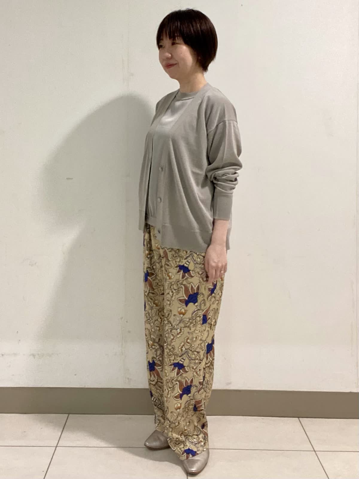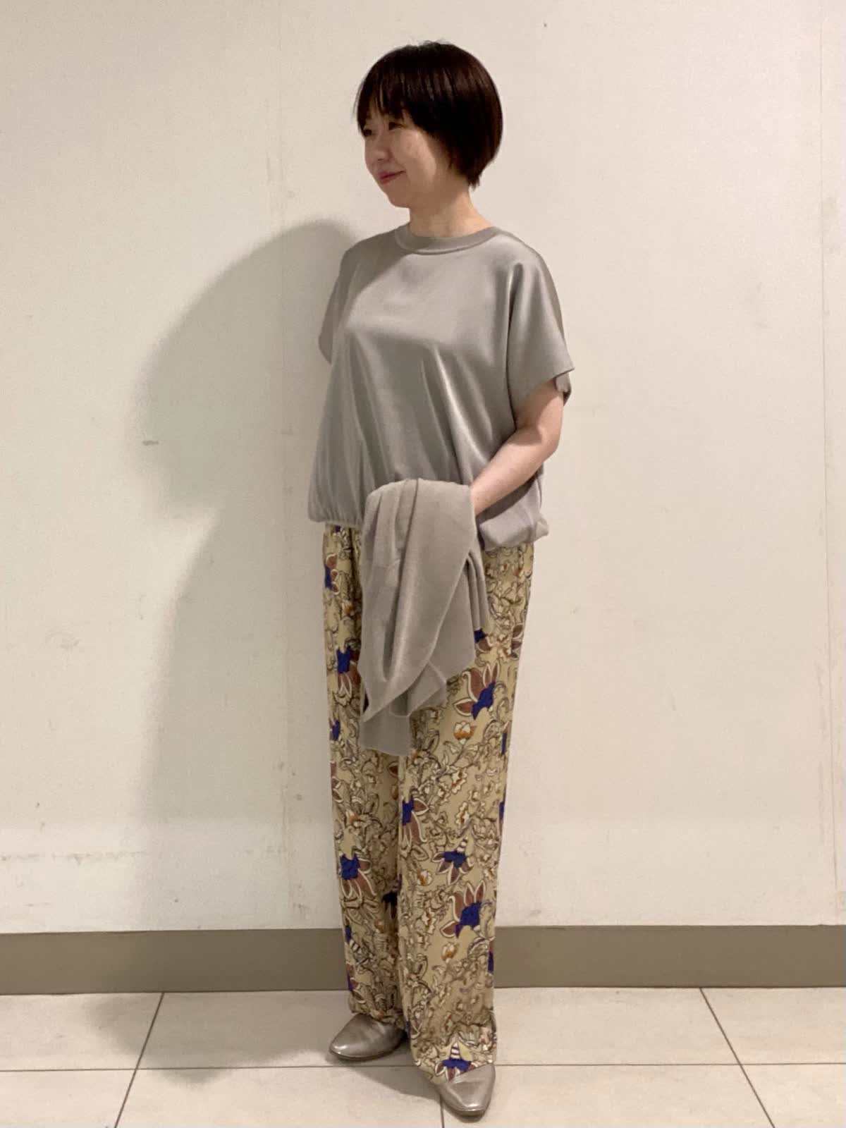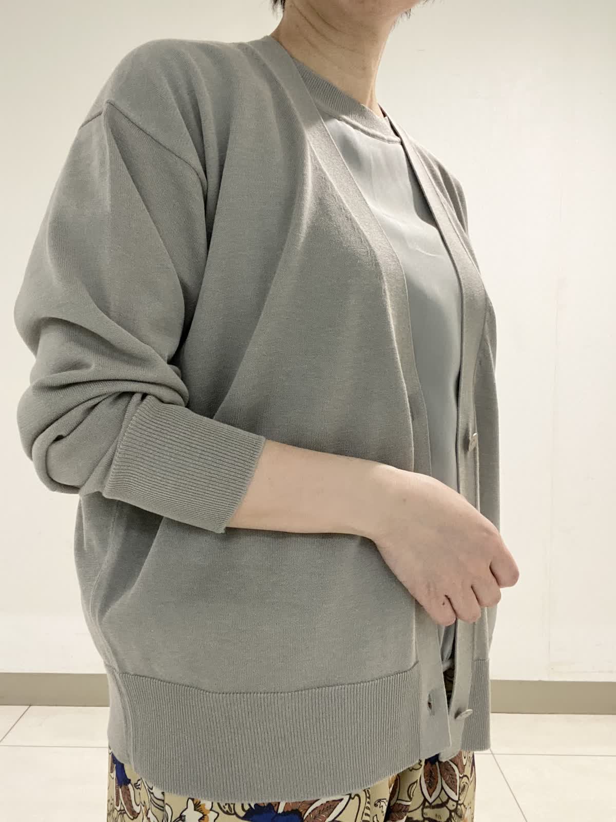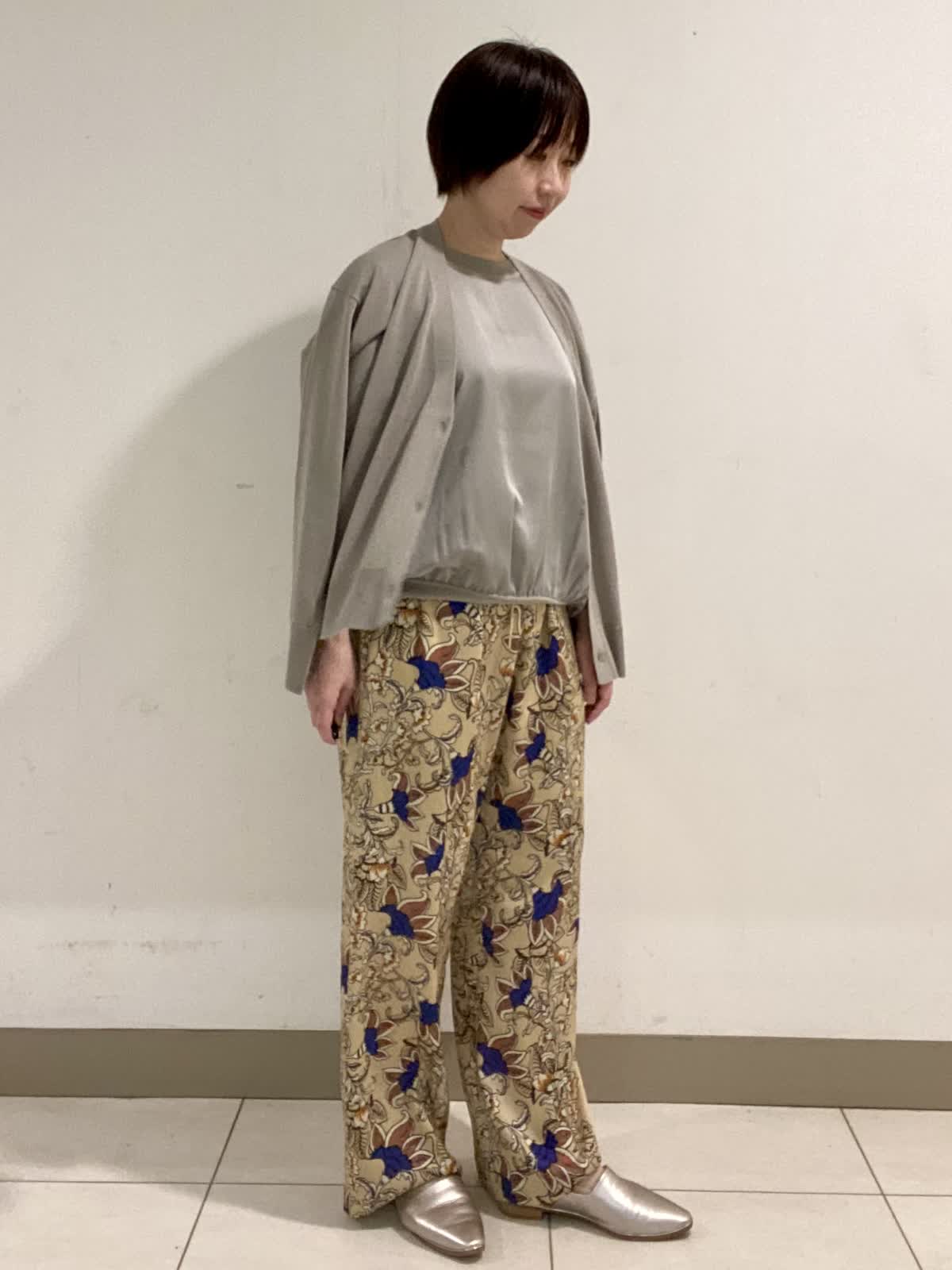 【着用サイズ】 ニット・カーディガン:フリー パンツ:9号 前身頃に光沢感のある素材を使ったニットは暑さの残る初秋にピッタリ。二の腕をカバーできる袖丈も嬉しいポイント。ニット素材のカーディガンと合わせるときちんと感がアップでお出かけにも◎。軽い素材でサラッとした着心地です。 フラワープリントが目を引くイージーパンツは履くだけでオシャレ感抜群。ウエストがゴム仕様なので履き心地も◎。ドロストでウエストのサイズ調整も出来ます。シワにもなりにくいので秋のご旅行にも最適です。