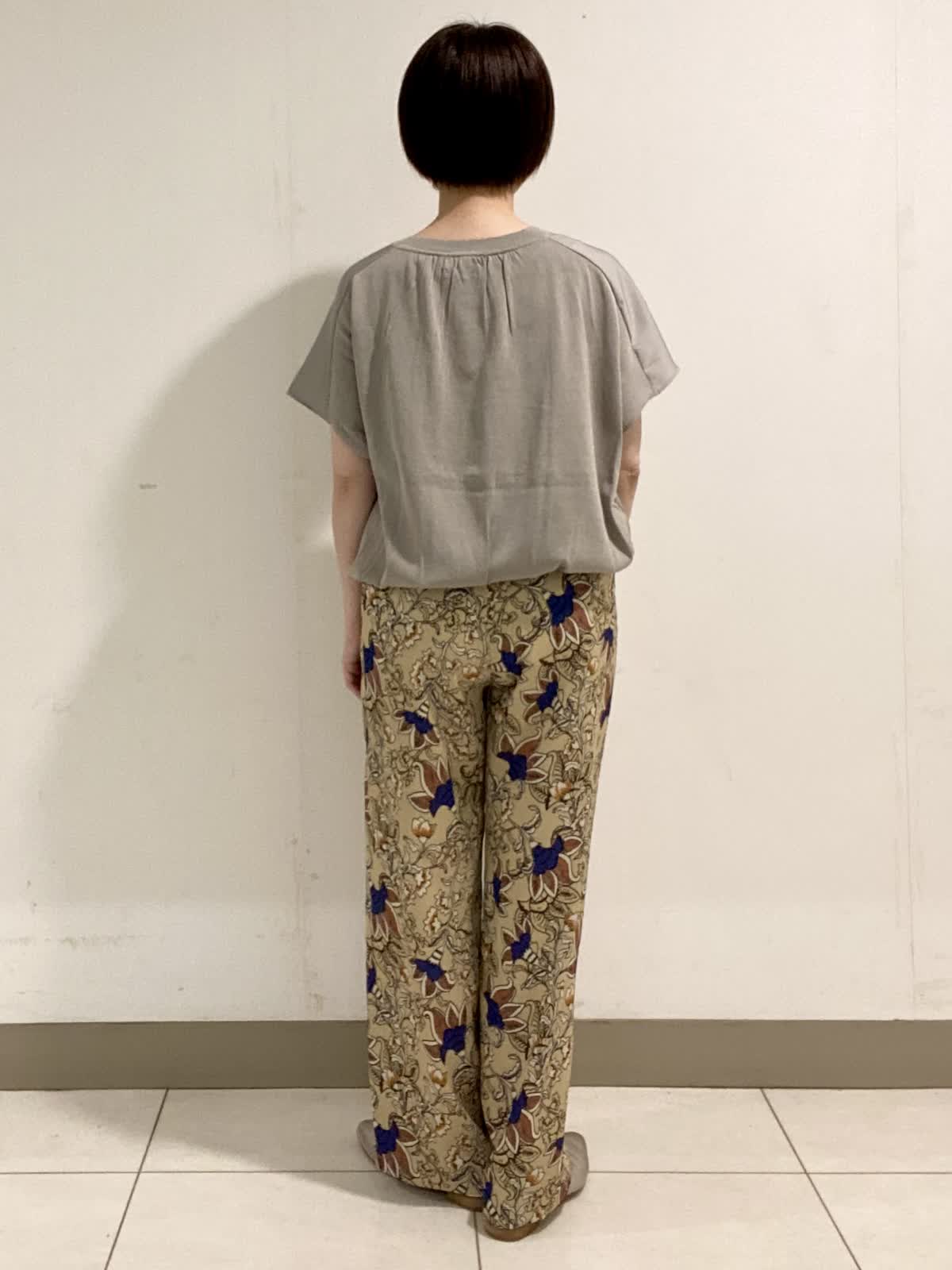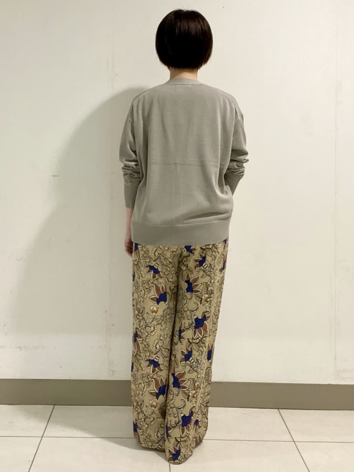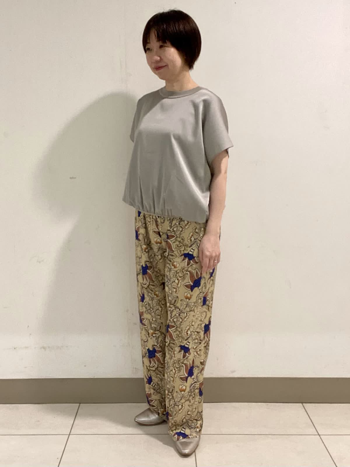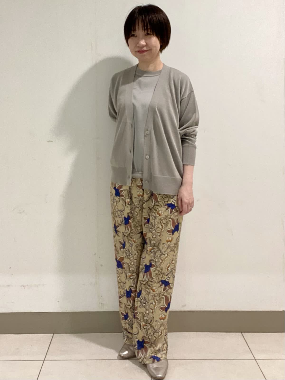 【着用サイズ】 ニット・カーディガン:フリー パンツ:9号 前身頃に光沢感のある素材を使ったニットは暑さの残る初秋にピッタリ。二の腕をカバーできる袖丈も嬉しいポイント。ニット素材のカーディガンと合わせるときちんと感がアップでお出かけにも◎。軽い素材でサラッとした着心地です。 フラワープリントが目を引くイージーパンツは履くだけでオシャレ感抜群。ウエストがゴム仕様なので履き心地も◎。ドロストでウエストのサイズ調整も出来ます。シワにもなりにくいので秋のご旅行にも最適です。