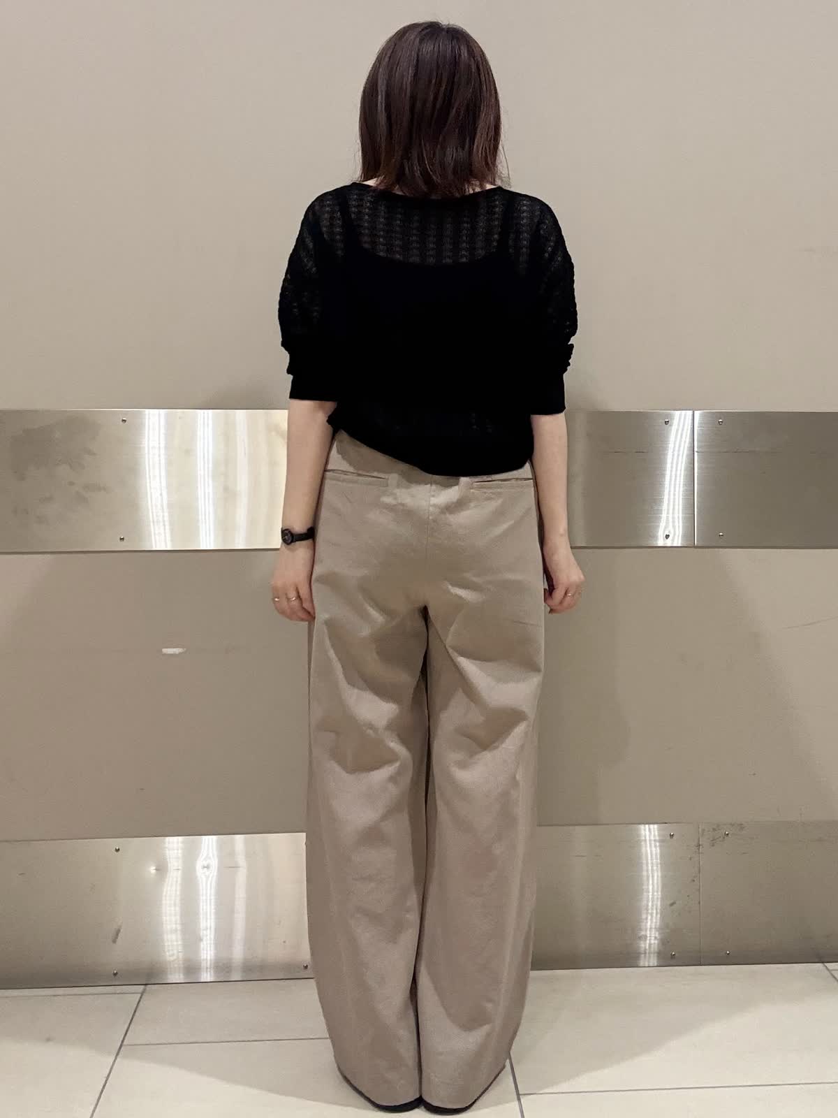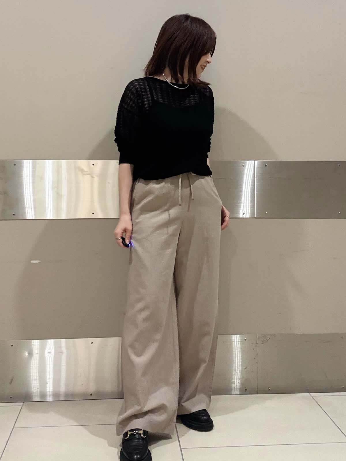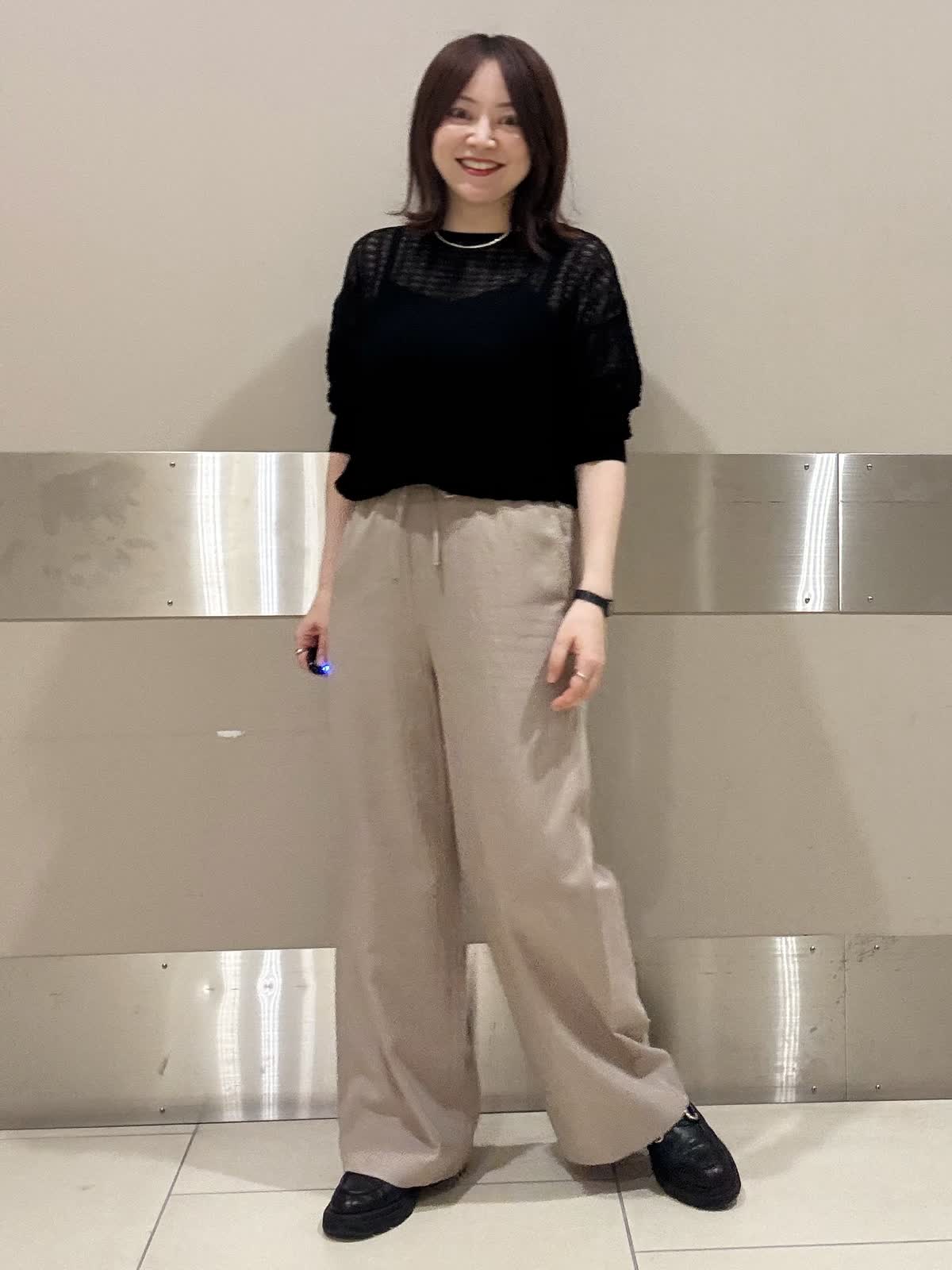 【着用カラー】 ニット:ブラック キャミソール:スミクロ パンツ:ベージュ 【着用サイズ】 全て9号 シアーな透け感が楽しめるブラックのニットに、落ち感のあるワイドパンツを合わせた上品カジュアルコーデ。程よい肌見せが軽やかさを演出し、モノトーンながらも重たくならない印象に仕上げています。ワイドパンツの柔らかなベージュが、黒トップスの引き締め感をやわらげ、抜け感のある大人バランスに。シンプルな配色だからこそ、素材感のコントラストが引き立つ、洗練されたスタイリングです。