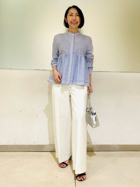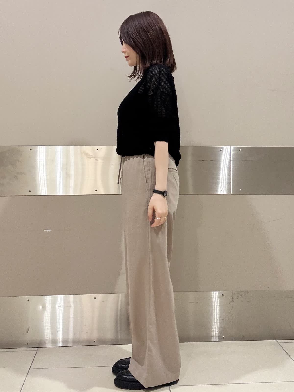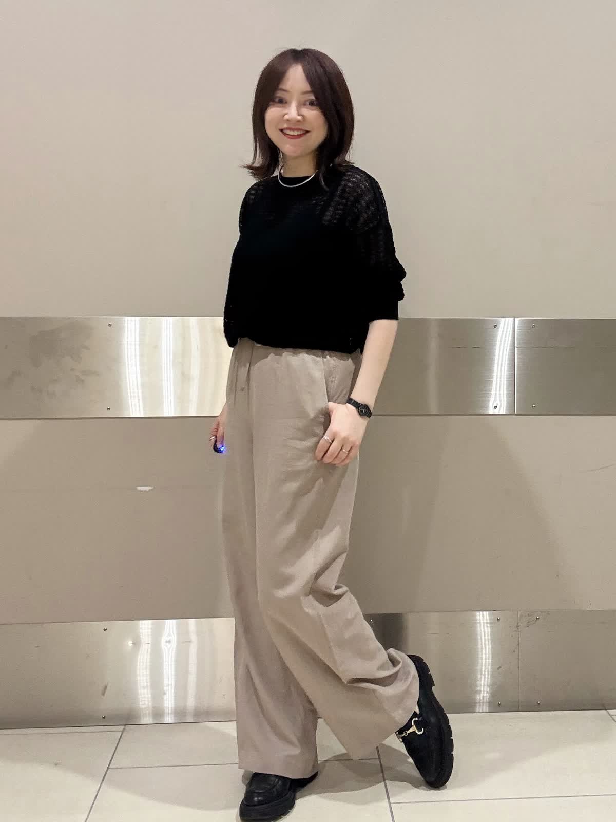 【着用カラー】 ニット:ブラック キャミソール:スミクロ パンツ:ベージュ 【着用サイズ】 全て9号 シアーな透け感が楽しめるブラックのニットに、落ち感のあるワイドパンツを合わせた上品カジュアルコーデ。程よい肌見せが軽やかさを演出し、モノトーンながらも重たくならない印象に仕上げています。ワイドパンツの柔らかなベージュが、黒トップスの引き締め感をやわらげ、抜け感のある大人バランスに。シンプルな配色だからこそ、素材感のコントラストが引き立つ、洗練されたスタイリングです。