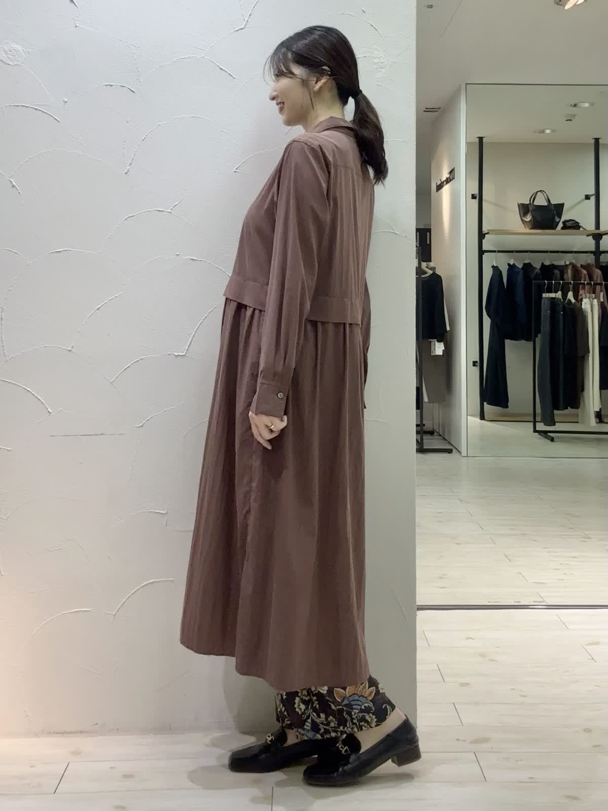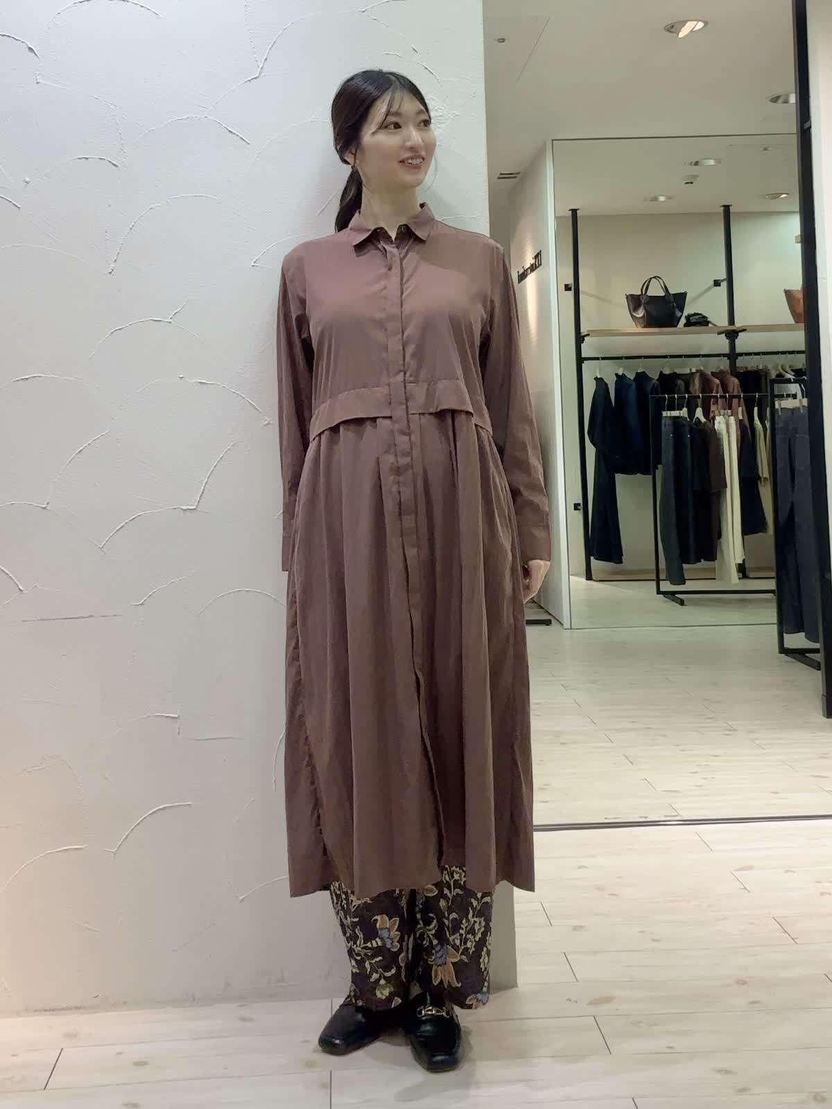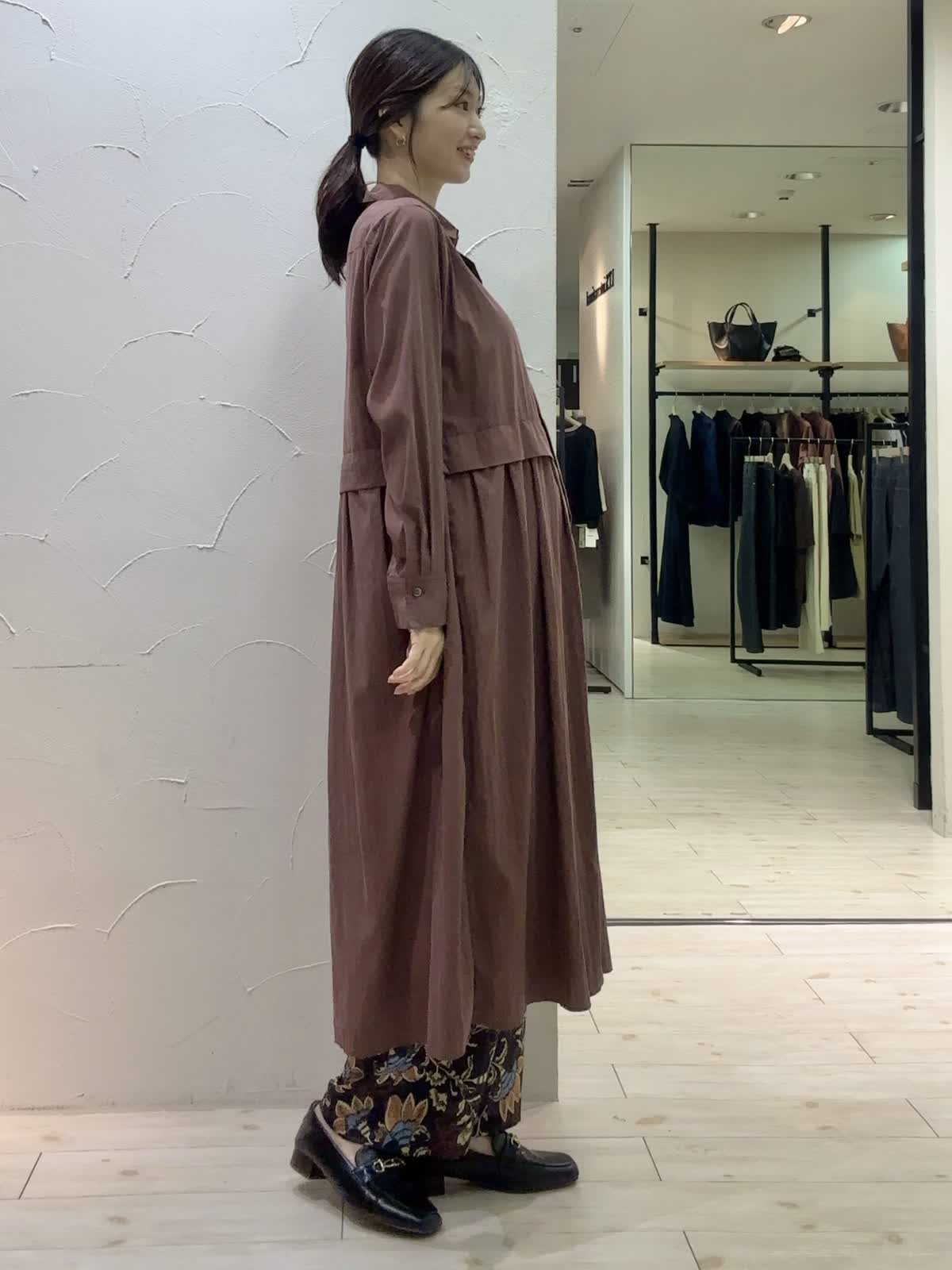 【着用サイズ】ワンピース:9号 パンツ:9号 【着用カラー】ワンピース:ボルドー パンツ:ネイビー 秋先取りのリラックスコーデ。ワンピースがウエスト位置からギャザー仕様になっており、スタイルアップして着用できます。締め付け感がなく、一枚でもおしゃれに着こなせます。プリントパンツをレイヤードしてこなれ感のある雰囲気にしてみました。