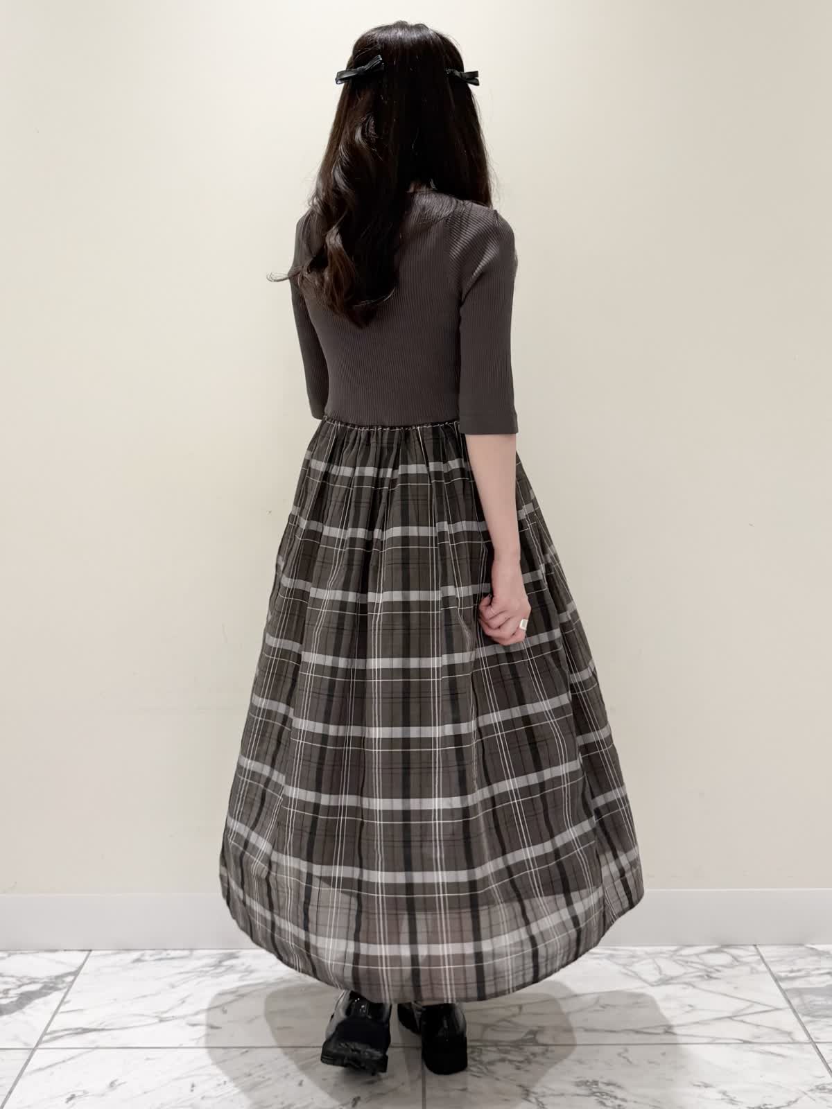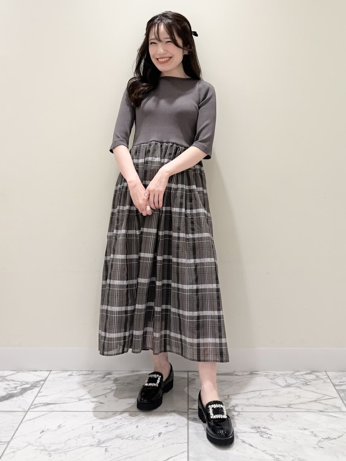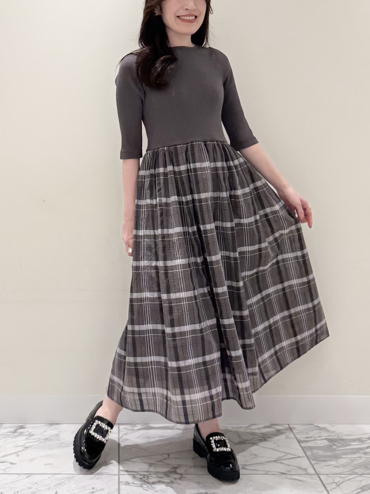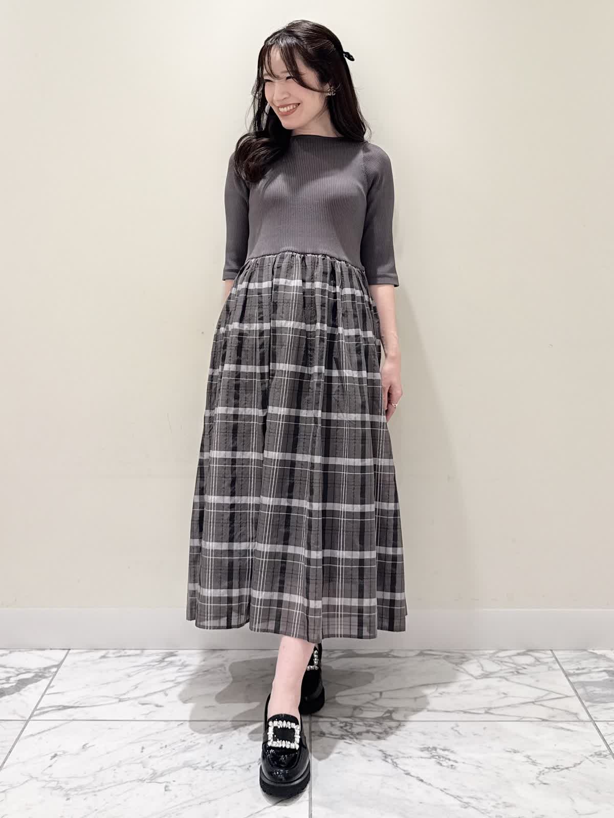 【着用サイズ/カラー】ワンピース:7号/モカチャ 気温が30℃以下になったらすぐに着られるワンピース。上半身は柔らかく、サラッとしたリブ編み。身体のラインを拾いにくく1枚で着やすい袖丈で、羽織りものもしやすいので早い時期から長く着られます。スカート部分は表地は肌あたりサラッとしたシアー生地のチェック柄に裏地は肌にあたる部分はツルっとしているので着心地◎ウエスト部分は柔らかく伸びのあるゴム仕様なので着ていてもストレスなく長時間着ていただけます。色違いでもおすすめしたいワンピースです。いつものサイズで大丈夫です。7号着用してますが、購入は5号にします。