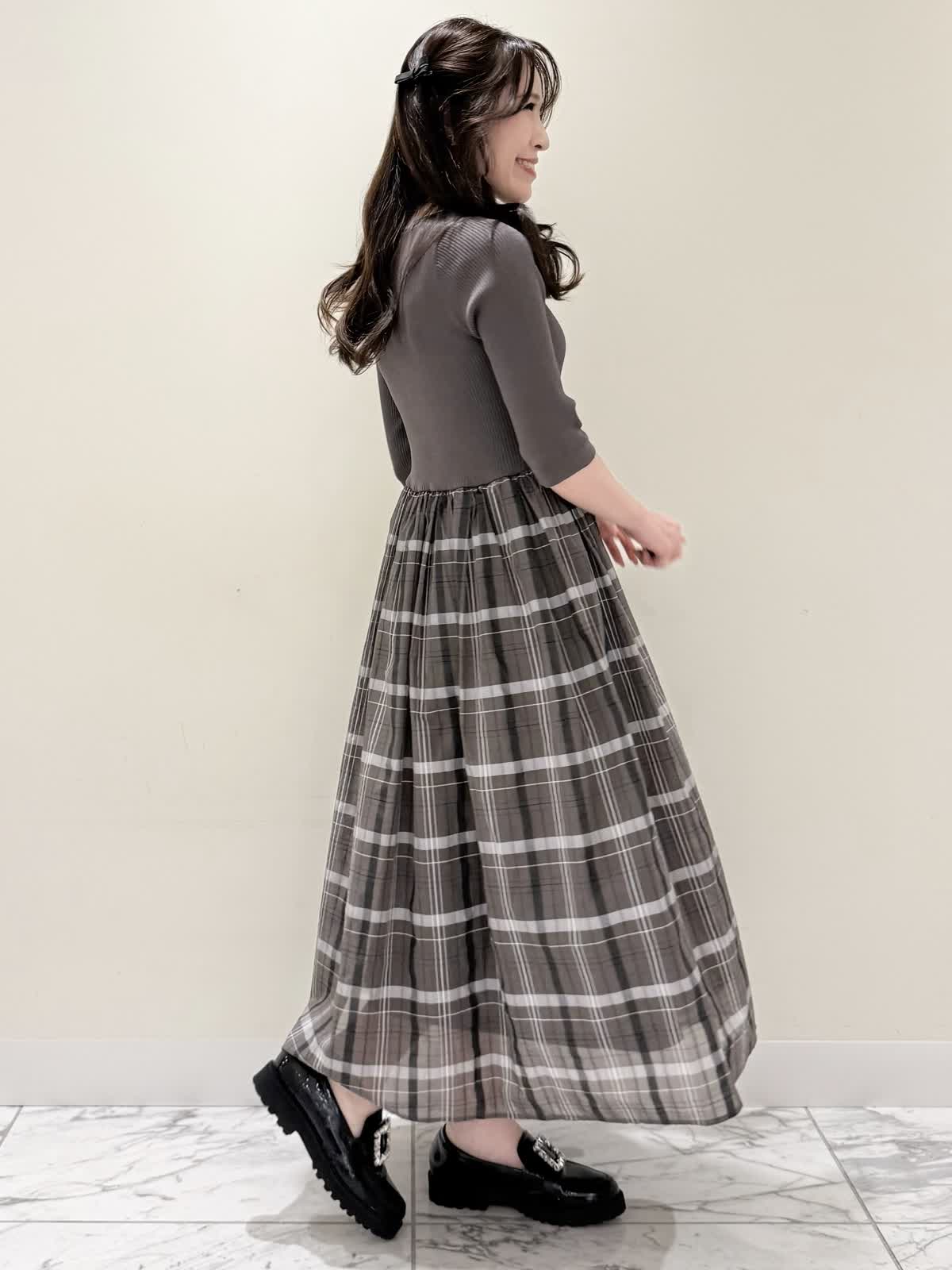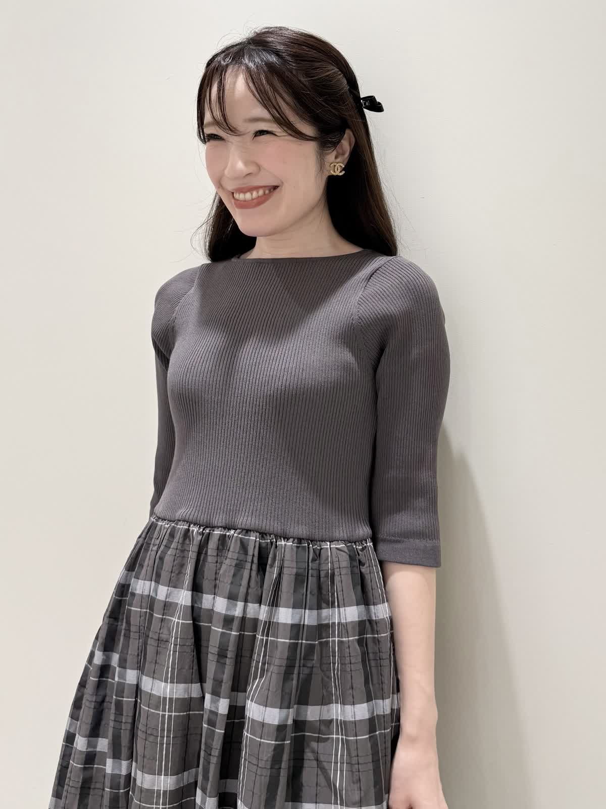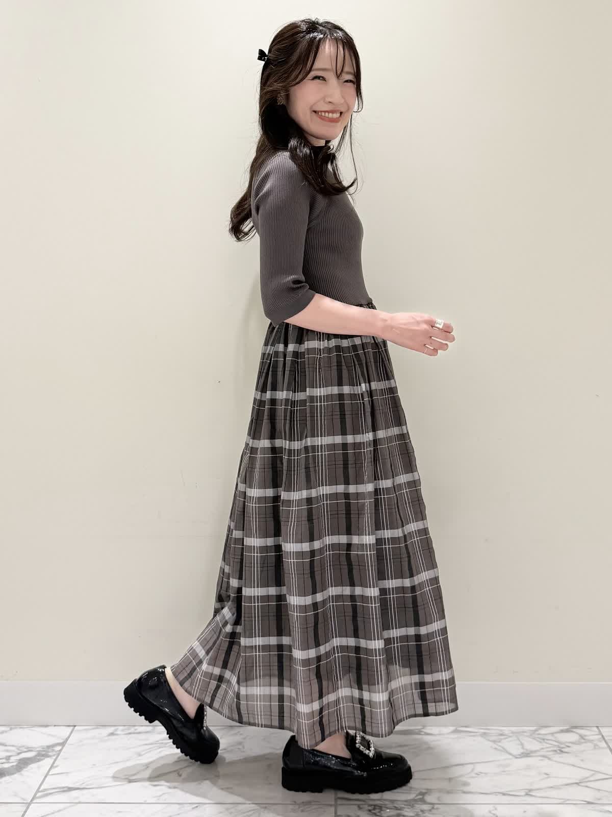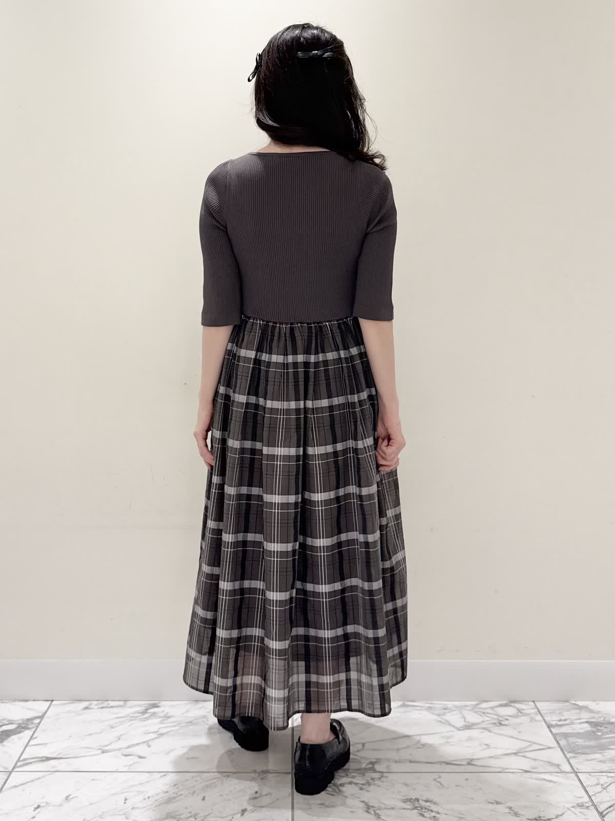 【着用サイズ/カラー】ワンピース:7号/モカチャ 気温が30℃以下になったらすぐに着られるワンピース。上半身は柔らかく、サラッとしたリブ編み。身体のラインを拾いにくく1枚で着やすい袖丈で、羽織りものもしやすいので早い時期から長く着られます。スカート部分は表地は肌あたりサラッとしたシアー生地のチェック柄に裏地は肌にあたる部分はツルっとしているので着心地◎ウエスト部分は柔らかく伸びのあるゴム仕様なので着ていてもストレスなく長時間着ていただけます。色違いでもおすすめしたいワンピースです。いつものサイズで大丈夫です。7号着用してますが、購入は5号にします。