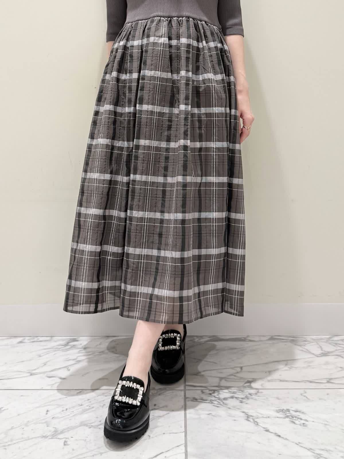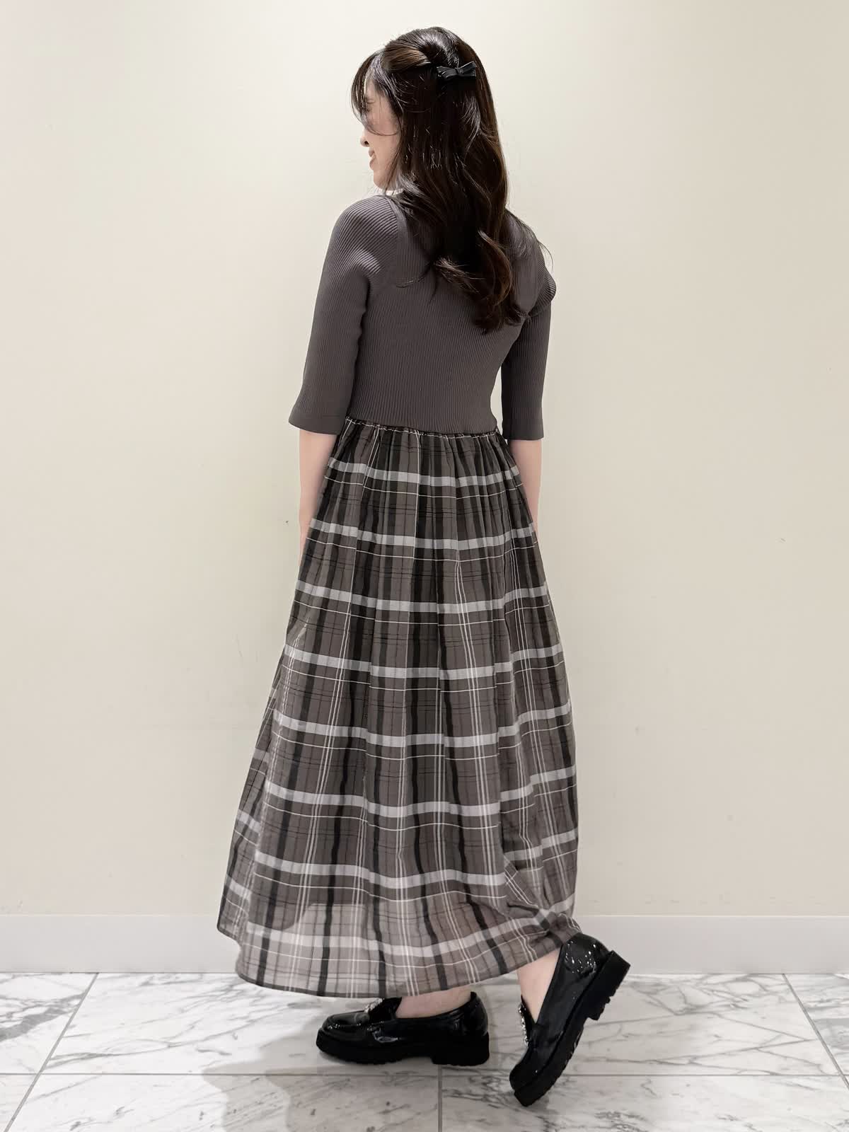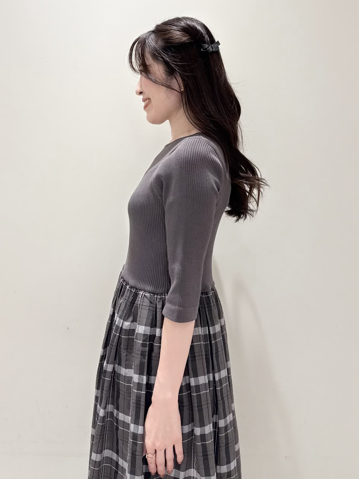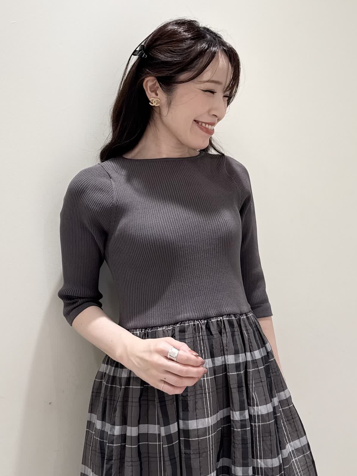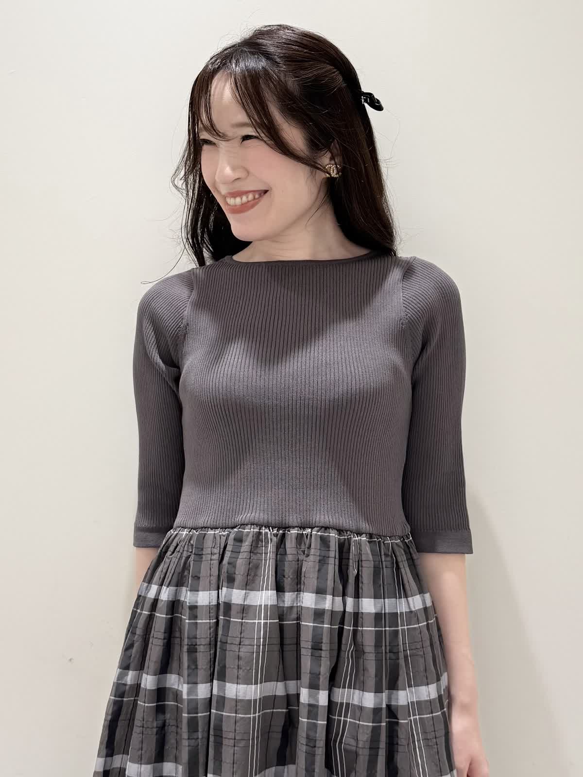 【着用サイズ/カラー】ワンピース:7号/モカチャ 気温が30℃以下になったらすぐに着られるワンピース。上半身は柔らかく、サラッとしたリブ編み。身体のラインを拾いにくく1枚で着やすい袖丈で、羽織りものもしやすいので早い時期から長く着られます。スカート部分は表地は肌あたりサラッとしたシアー生地のチェック柄に裏地は肌にあたる部分はツルっとしているので着心地◎ウエスト部分は柔らかく伸びのあるゴム仕様なので着ていてもストレスなく長時間着ていただけます。色違いでもおすすめしたいワンピースです。いつものサイズで大丈夫です。7号着用してますが、購入は5号にします。