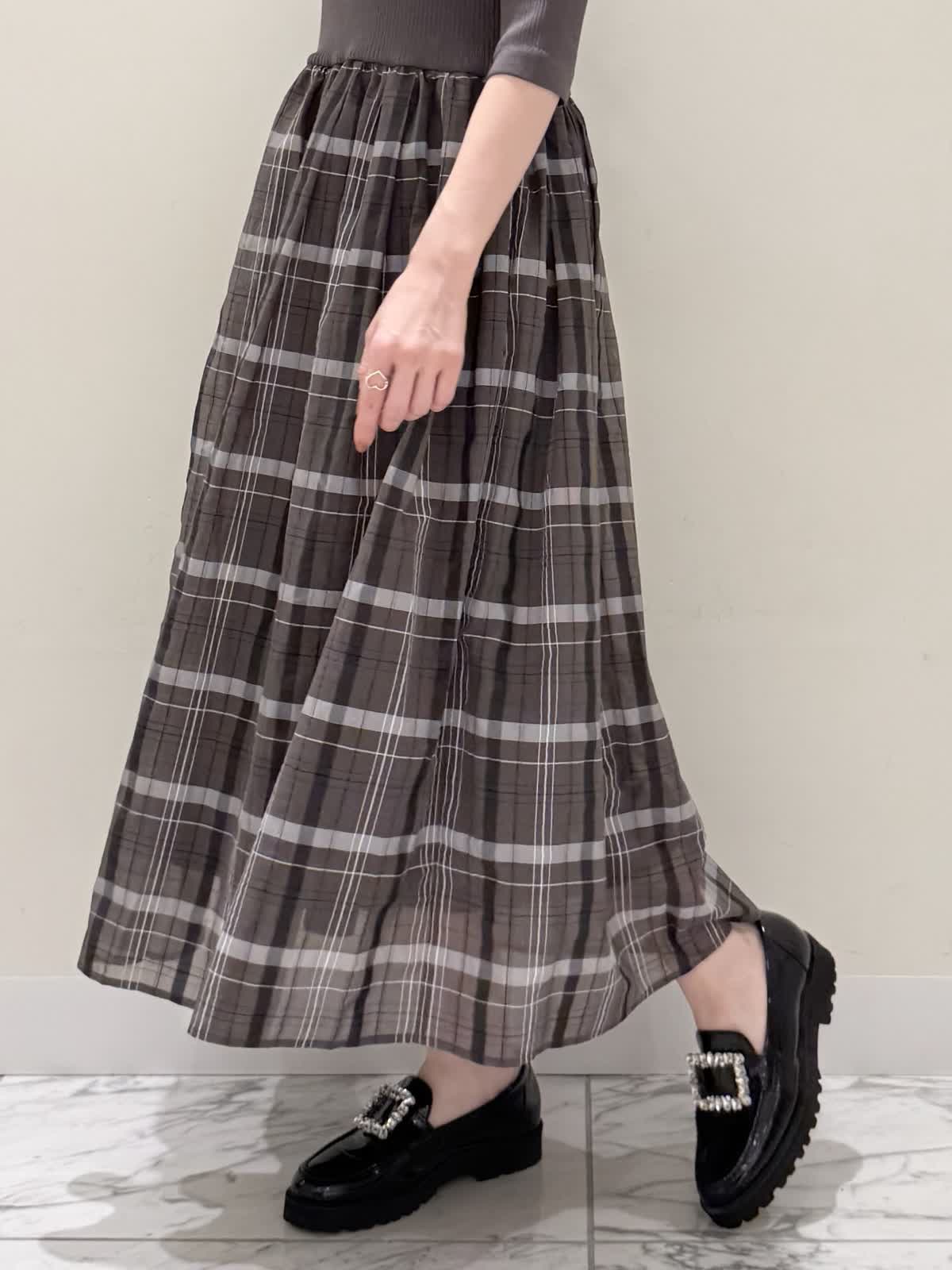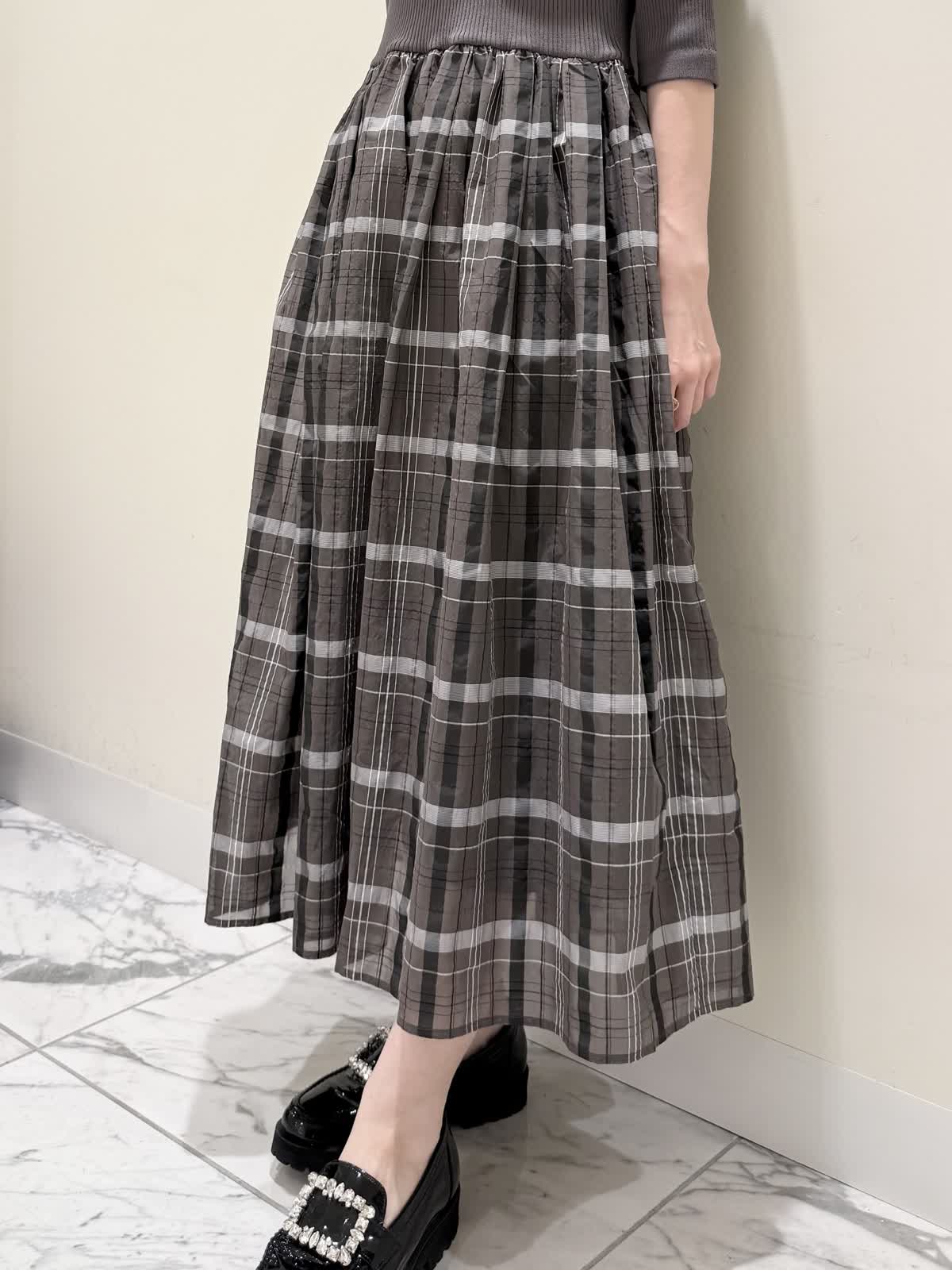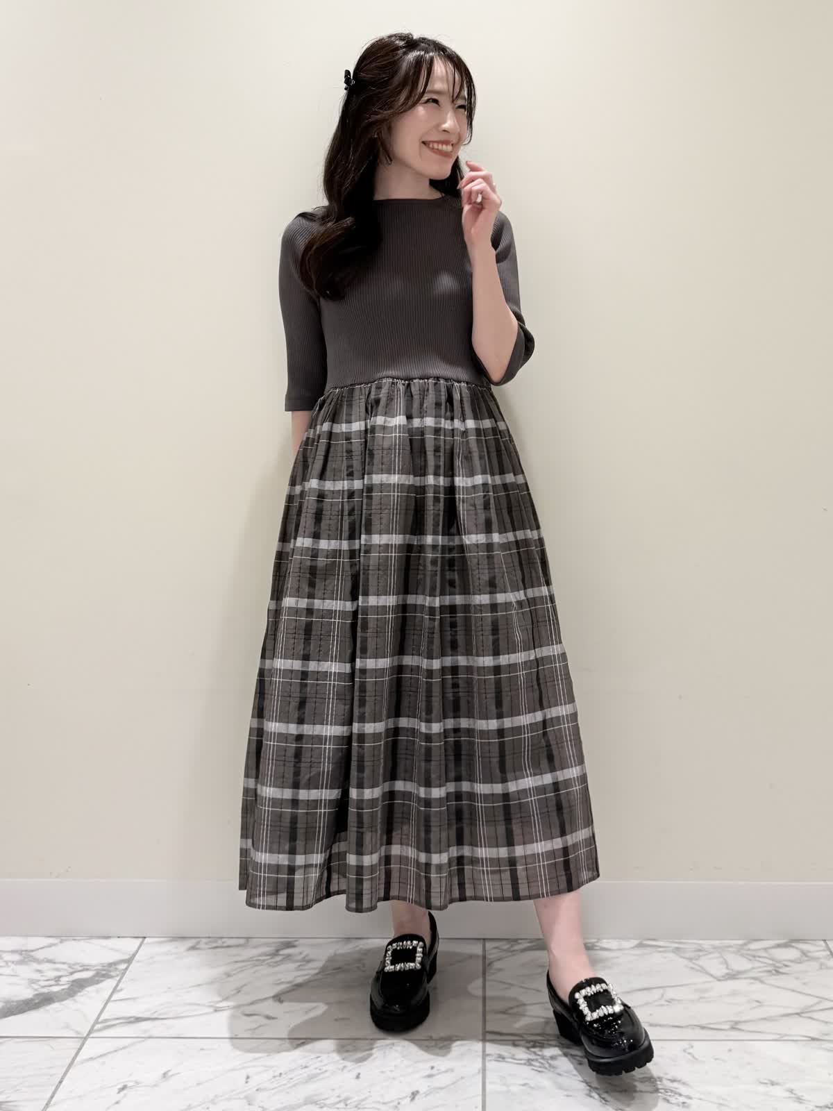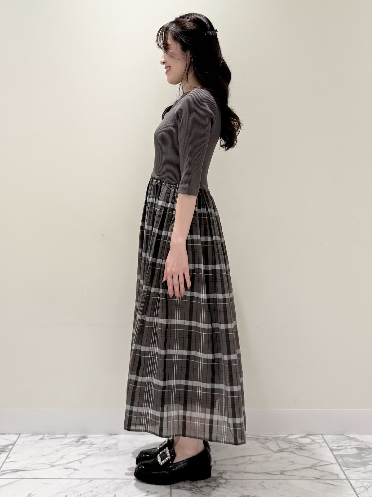 【着用サイズ/カラー】ワンピース:7号/モカチャ 気温が30℃以下になったらすぐに着られるワンピース。上半身は柔らかく、サラッとしたリブ編み。身体のラインを拾いにくく1枚で着やすい袖丈で、羽織りものもしやすいので早い時期から長く着られます。スカート部分は表地は肌あたりサラッとしたシアー生地のチェック柄に裏地は肌にあたる部分はツルっとしているので着心地◎ウエスト部分は柔らかく伸びのあるゴム仕様なので着ていてもストレスなく長時間着ていただけます。色違いでもおすすめしたいワンピースです。いつものサイズで大丈夫です。7号着用してますが、購入は5号にします。