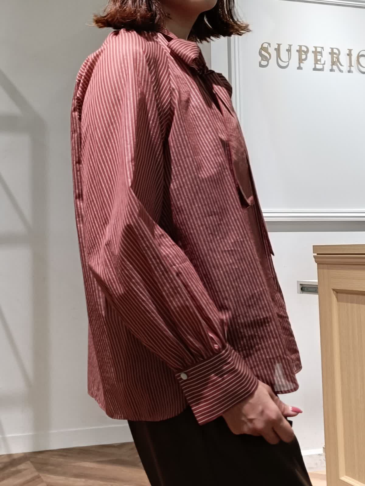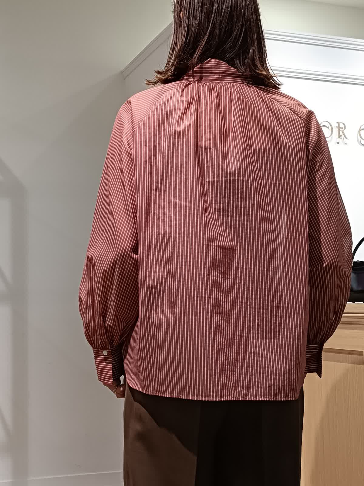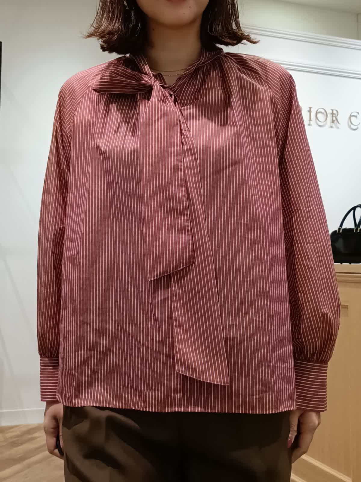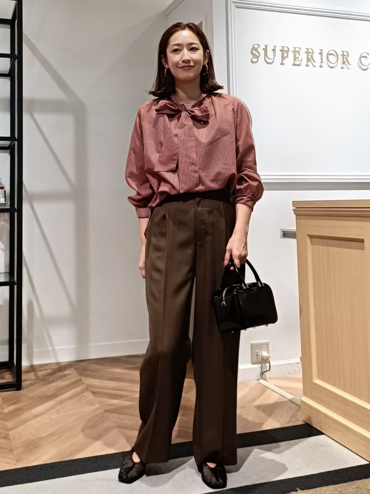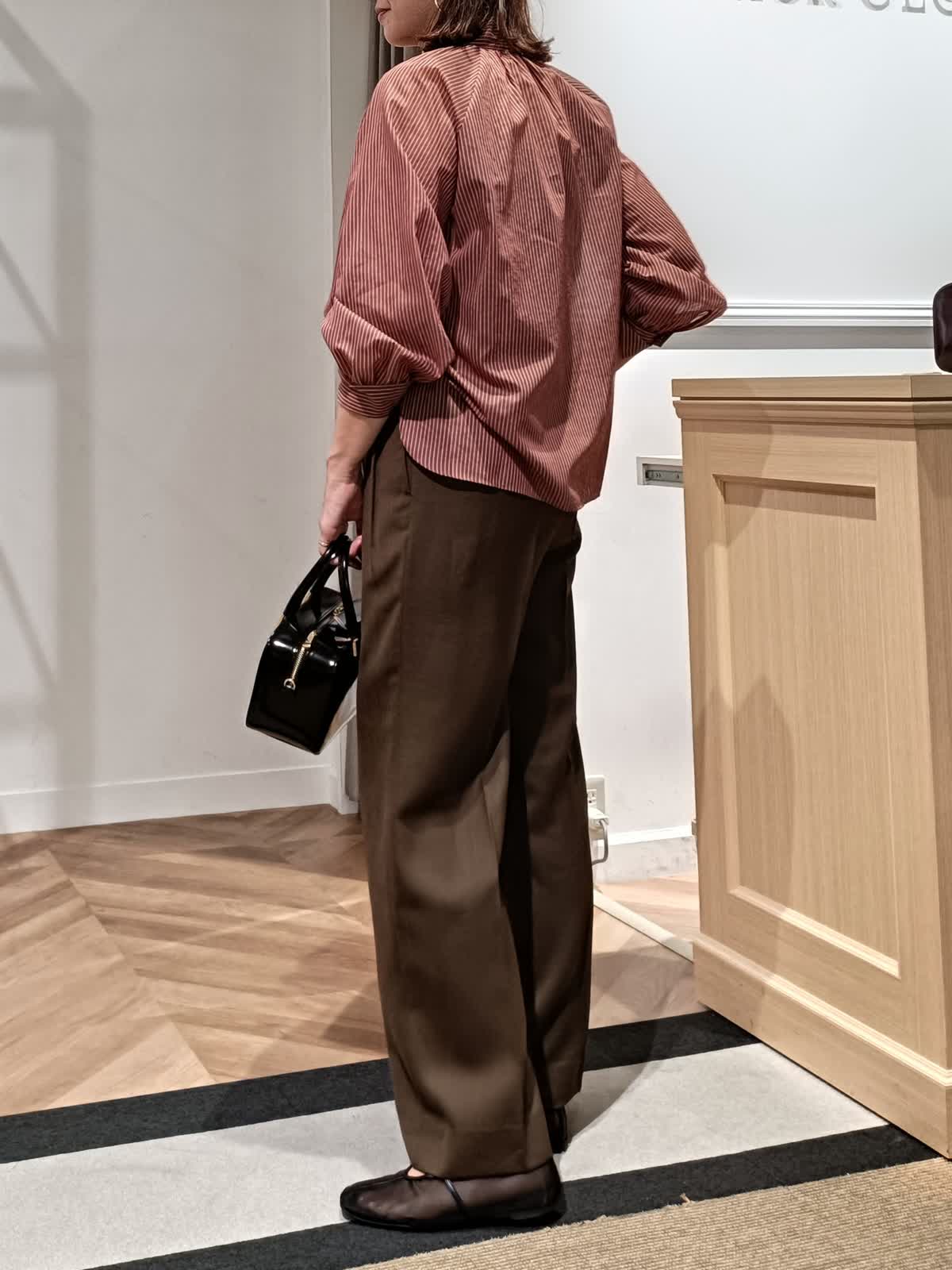 【着用サイズ:カラー】ブラウス:9号:レンガ パンツ:11号:ブラウン 季節の変わり目はブラウスがマスト。シャドーストライプのボウタイブラウスは甘くなりすぎない印象に。ツータックのパンツはスッキリとしたラインがポイントで軽やかな素材もラインをキレイにみせてくれます。オンオフどちらでも着られる万能パンツで色違いで揃えたくなります。