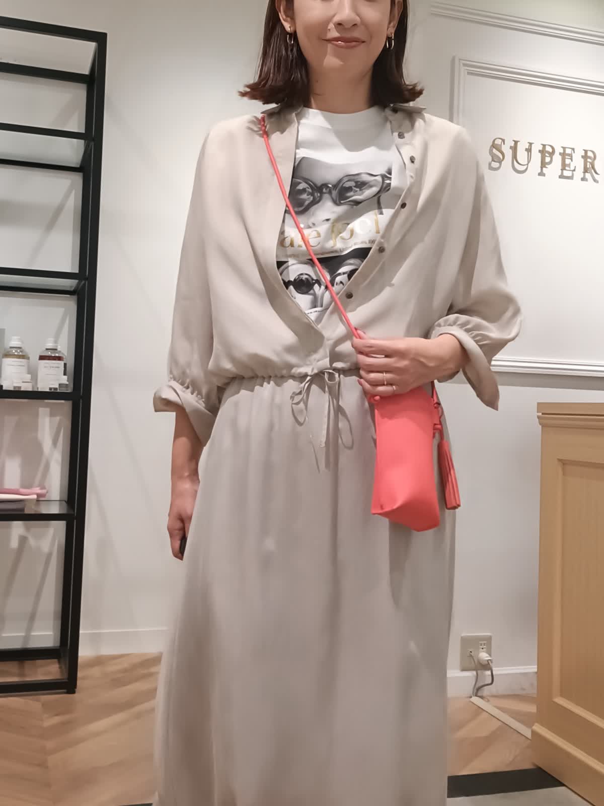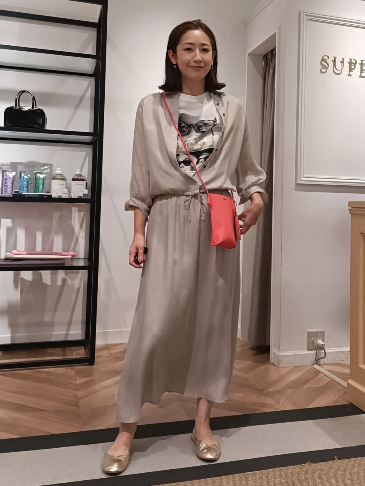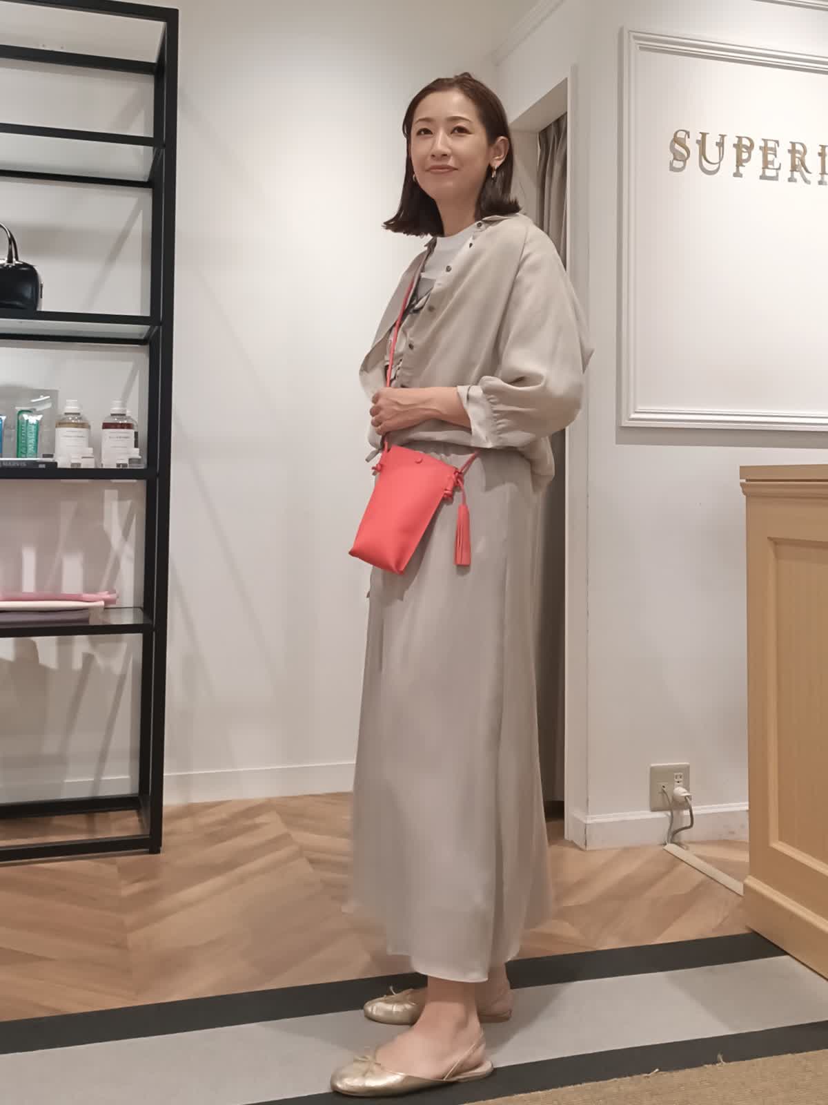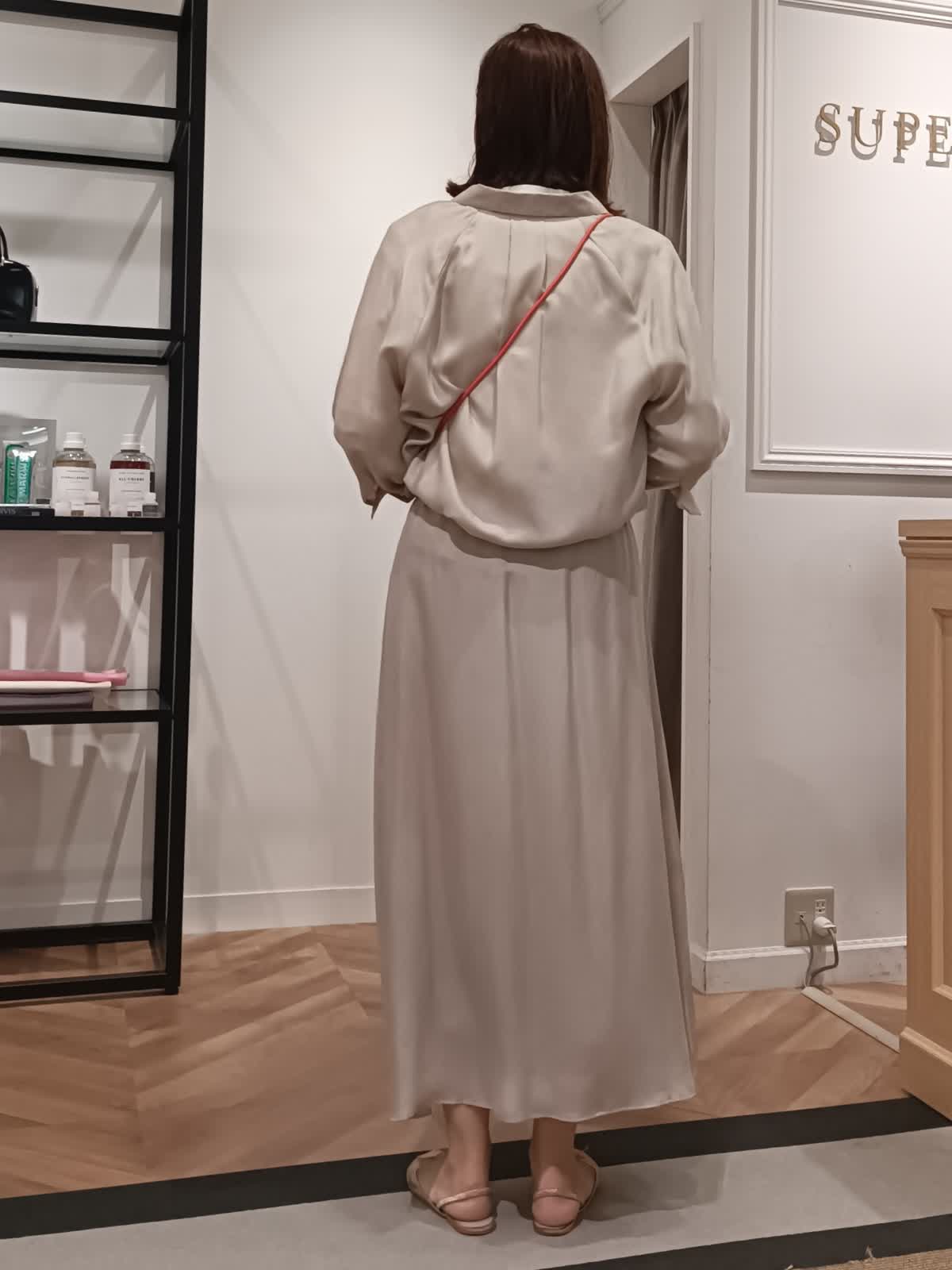 【着用サイズ:カラー】ブラウス:9号:グレーべージュ スカート:9号:グレーベージュ カットソー:9号:オフホワイト キュプラ素材のブラウスとスカートは上品な光沢感かポイントです。 ブラウスは羽織っても1枚で着ても◎ スカートは広がりすぎないデザインでスッキリと着られます。ウエストはゴムとドロストで調節できるので履き心地もとても良いです。それぞれ単品での着回しも楽しんでください。