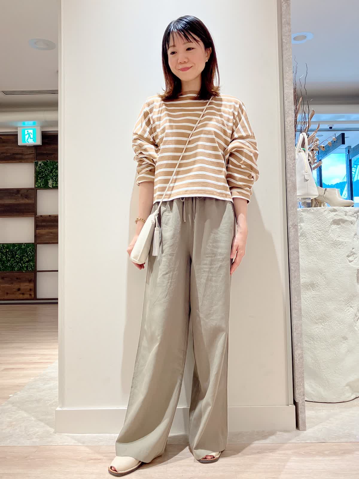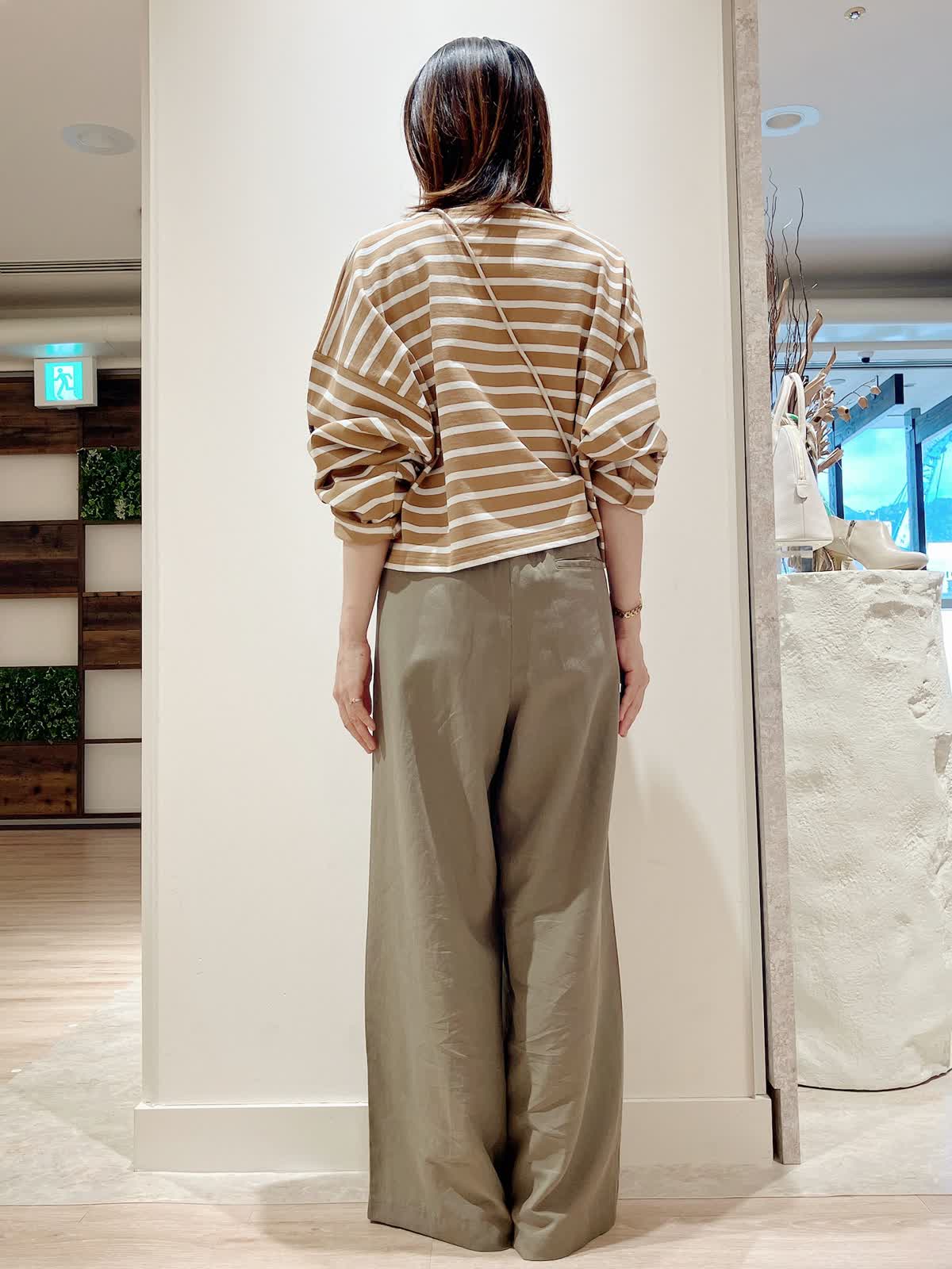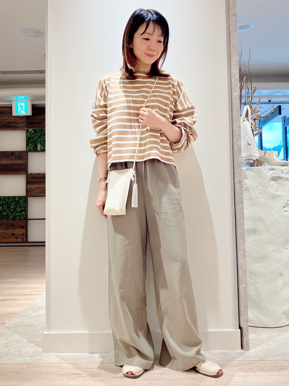 【着用サイズ】カットソー:9号 パンツ:7号 【着用カラー】カットソー:キャメル パンツ:カーキ コーディネートのテーマはカジュアルなお出かけスタイリングです。 ルミノアのボーダーカットソーは、ゆったりした袖付けだけど、ショート丈で低身長さんもバランス良くおしゃれに着こなせます。リネン混のサラッとしたワイドパンツと合わせてカジュアルなお出かけ着にぴったりのコーディネートです。