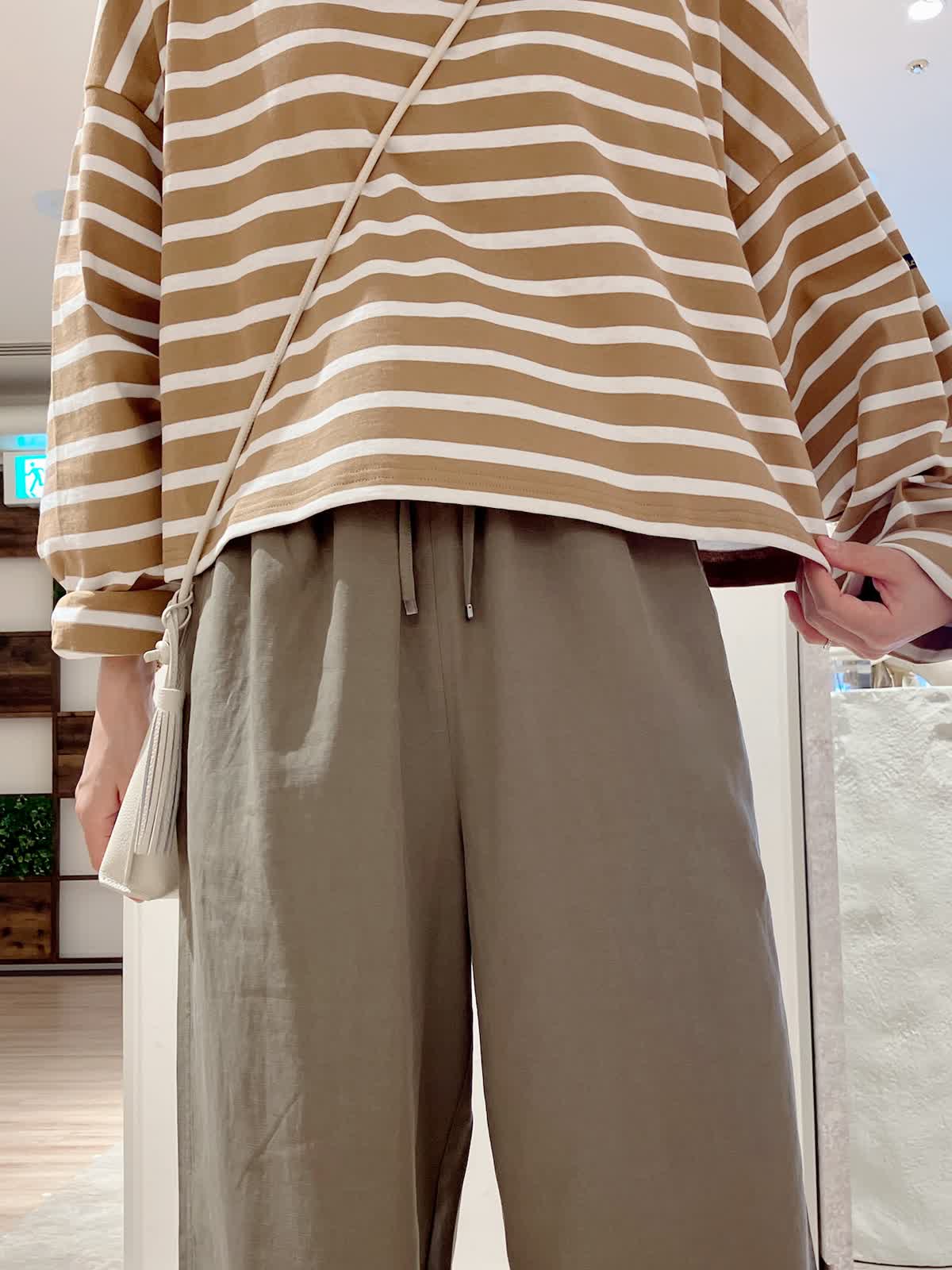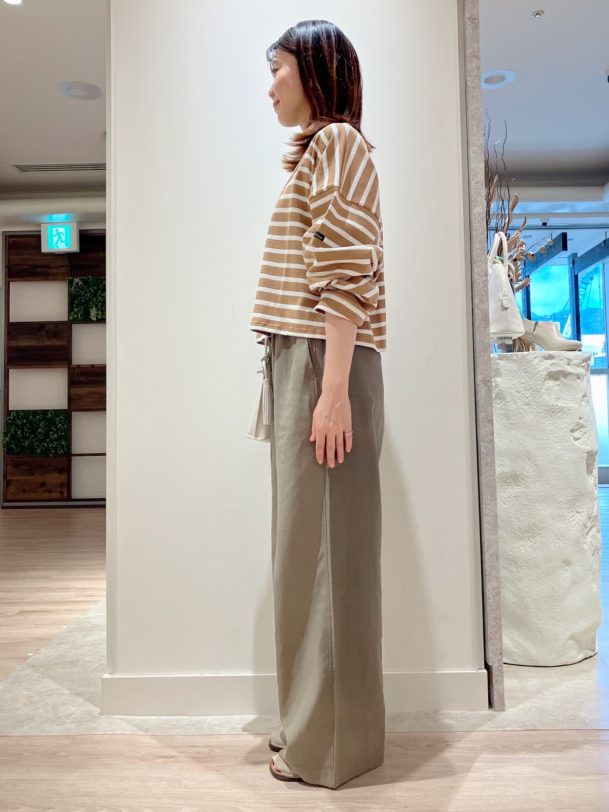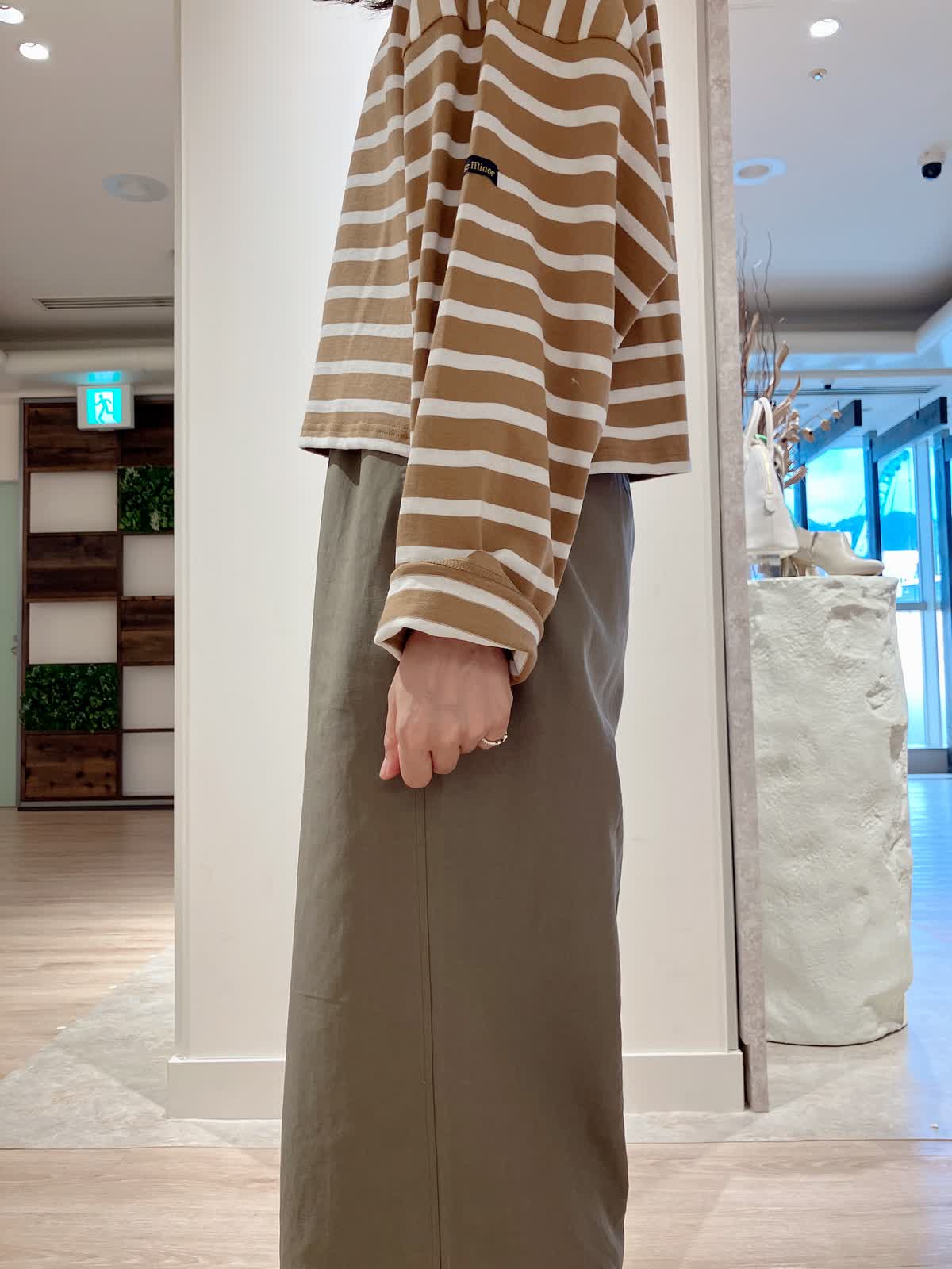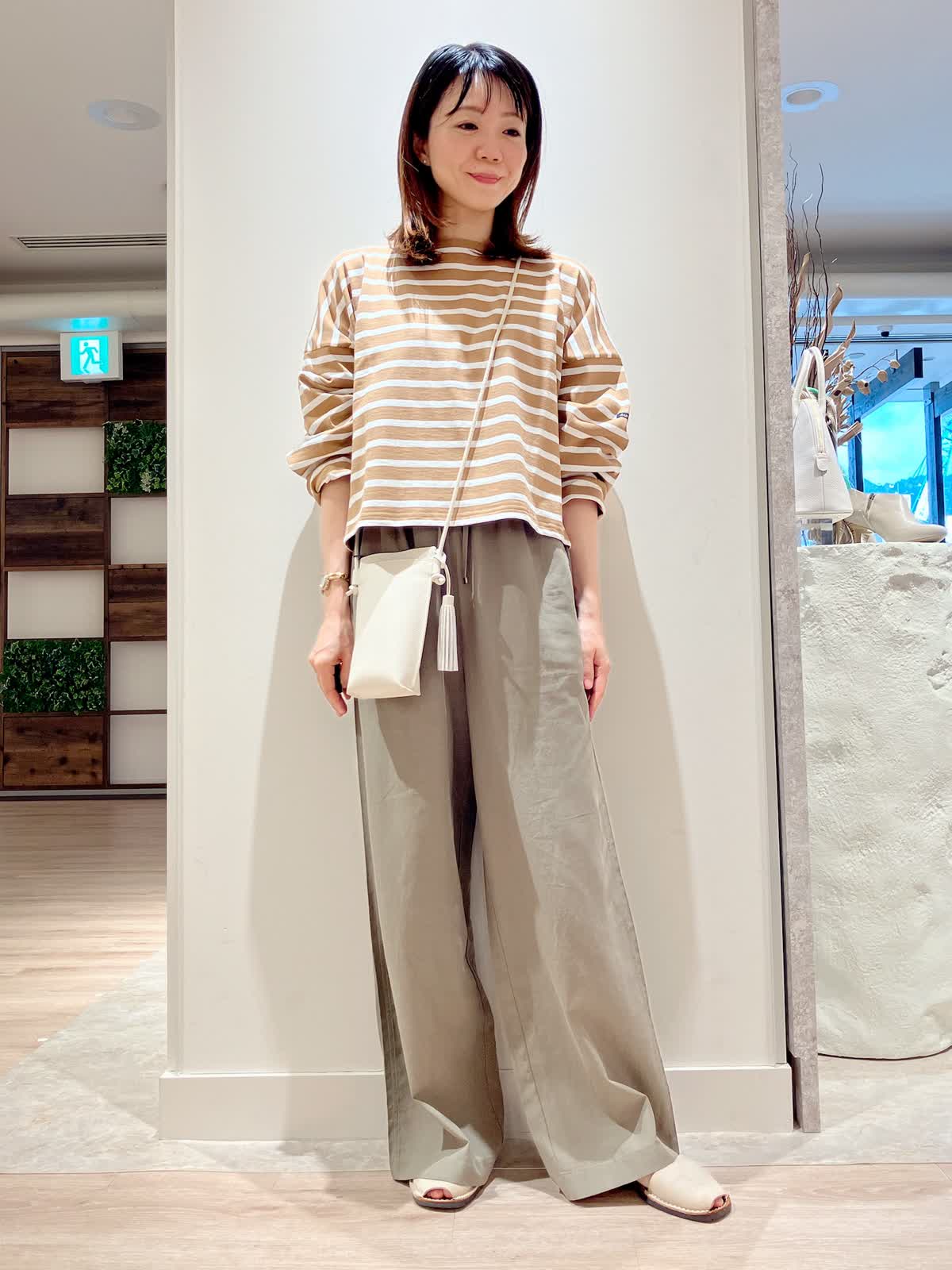【着用サイズ】カットソー:9号 パンツ:7号 【着用カラー】カットソー:キャメル パンツ:カーキ コーディネートのテーマはカジュアルなお出かけスタイリングです。 ルミノアのボーダーカットソーは、ゆったりした袖付けだけど、ショート丈で低身長さんもバランス良くおしゃれに着こなせます。リネン混のサラッとしたワイドパンツと合わせてカジュアルなお出かけ着にぴったりのコーディネートです。