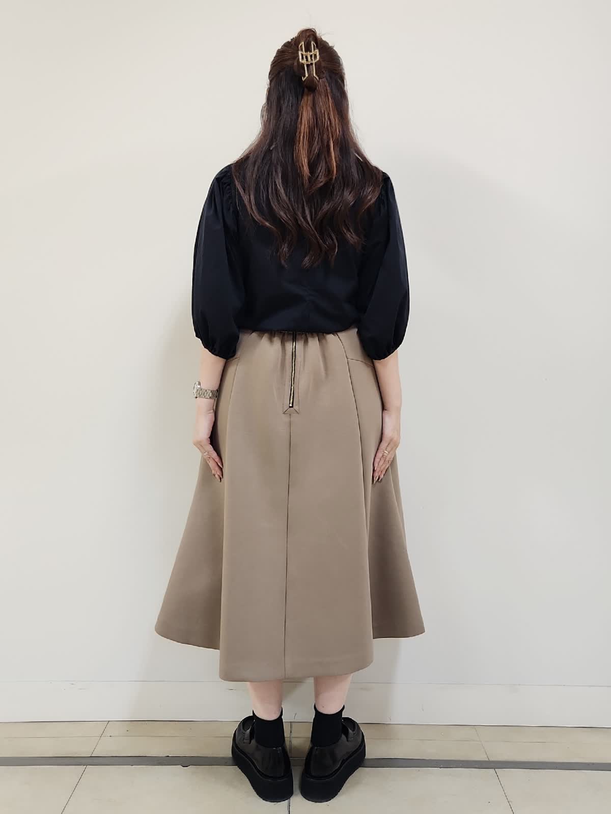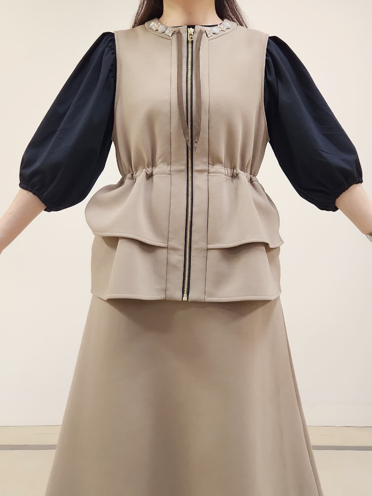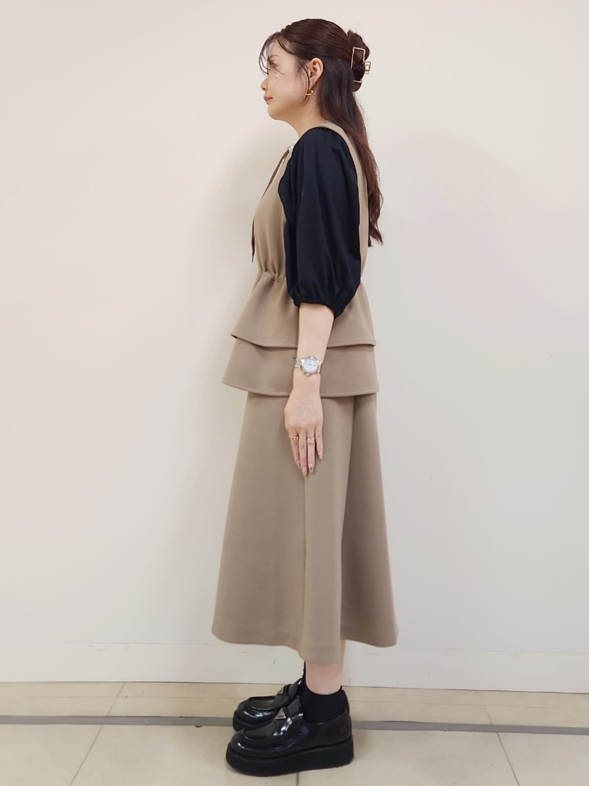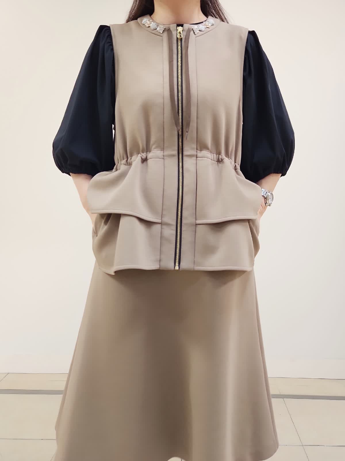 【着用サイズ】ジレ:9号/モカチャ スカート:9号/モカチャ カットソー:9号/ブラック 雑誌「美人百花」掲載のジレ&スカートのセットアップコーデ。ジレはストレッチ性のある生地で着やすく、ウエストが調整できるので楽ちんです。スカートはウエストゴム仕様、そこまで伸びるゴムではないですが、通常サイズで履けました。デイリーに着たい時はインナーをカットソー合わせにするのもおすすめです。
