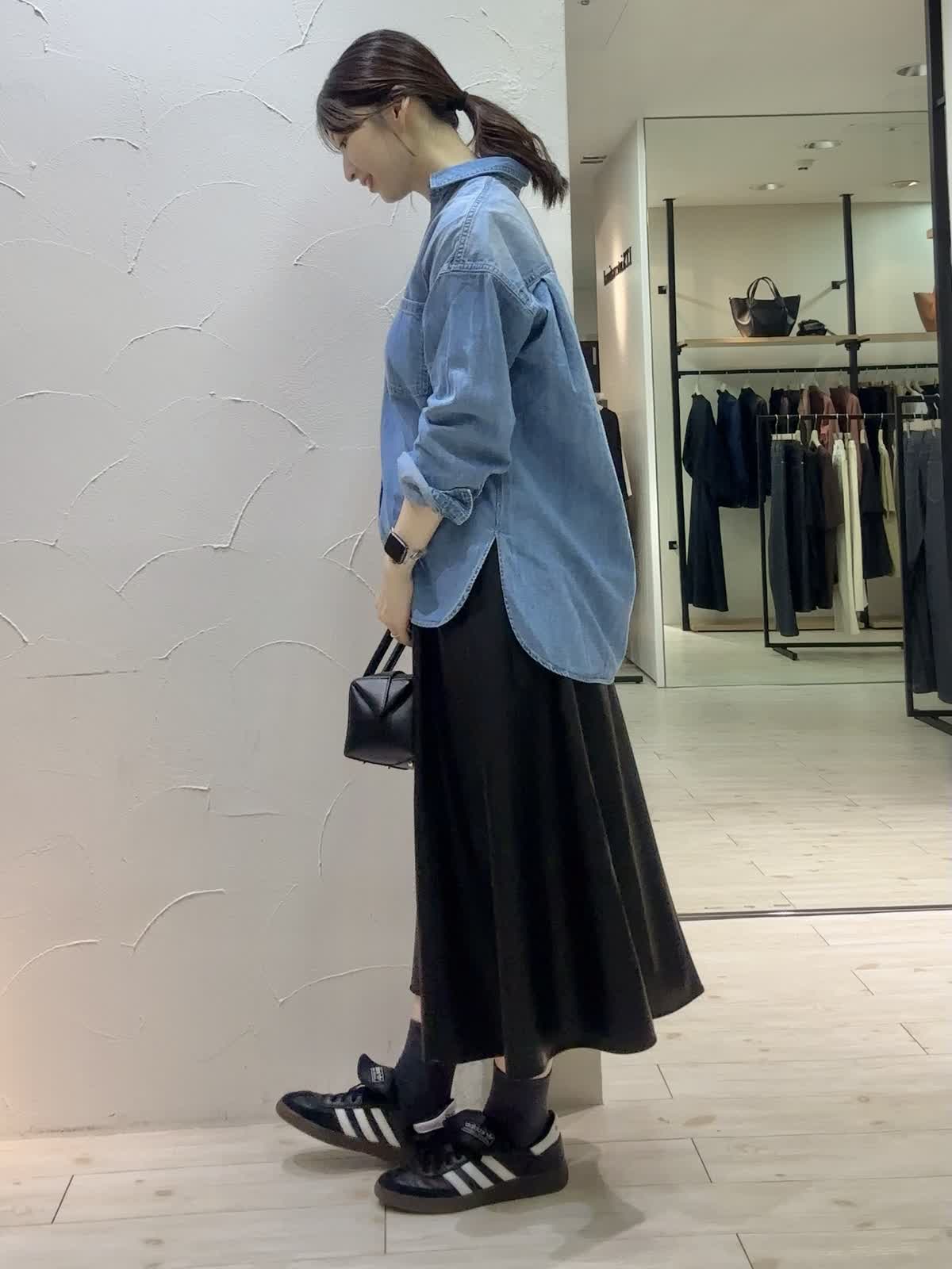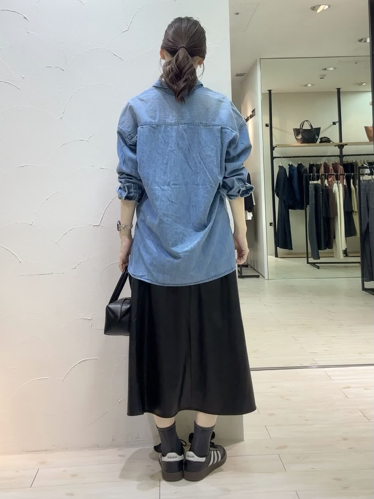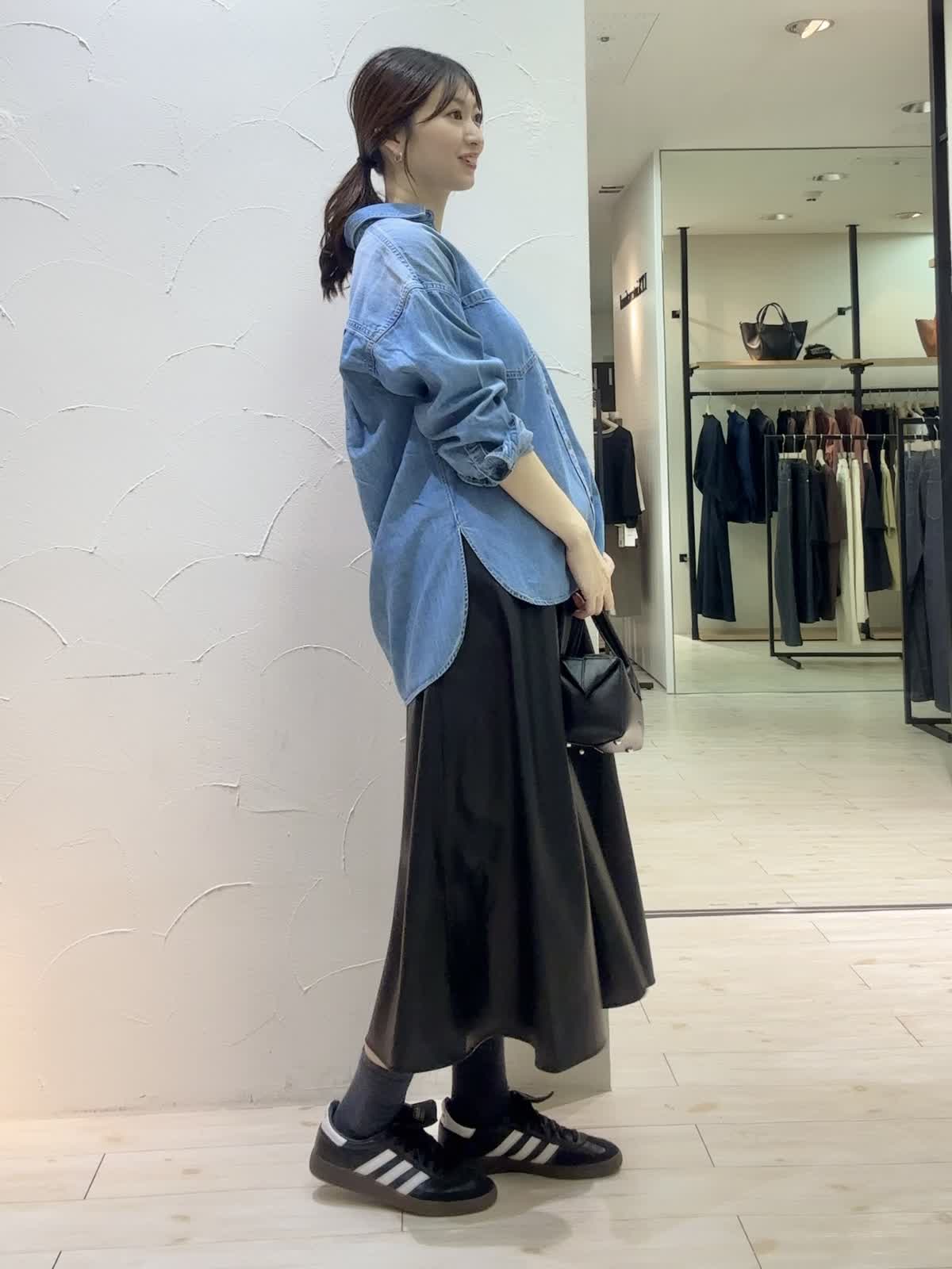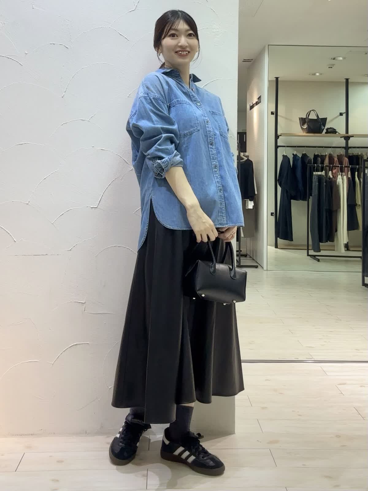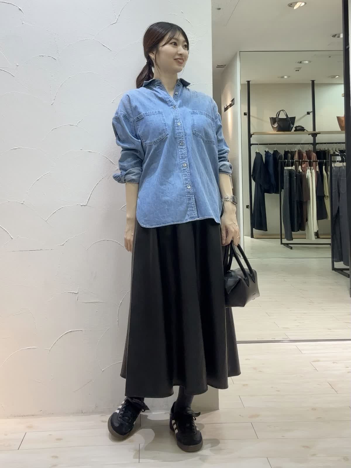 秋先取りなカジュアルコーデ。デニムシャツは、オーバーサイズなのでリラックスして着用できます。サイドスリットでダボっとならないシルエット、羽織としてもおすすめです。フェイクレザーのスカートは、柔らかくAラインのシルエットがとても綺麗です。後ろウエストゴム仕様で履き心地もいいです。