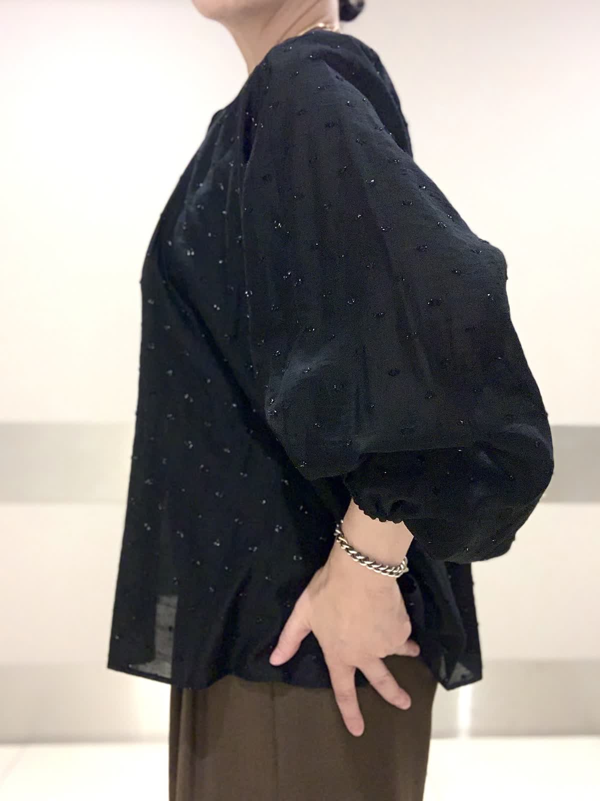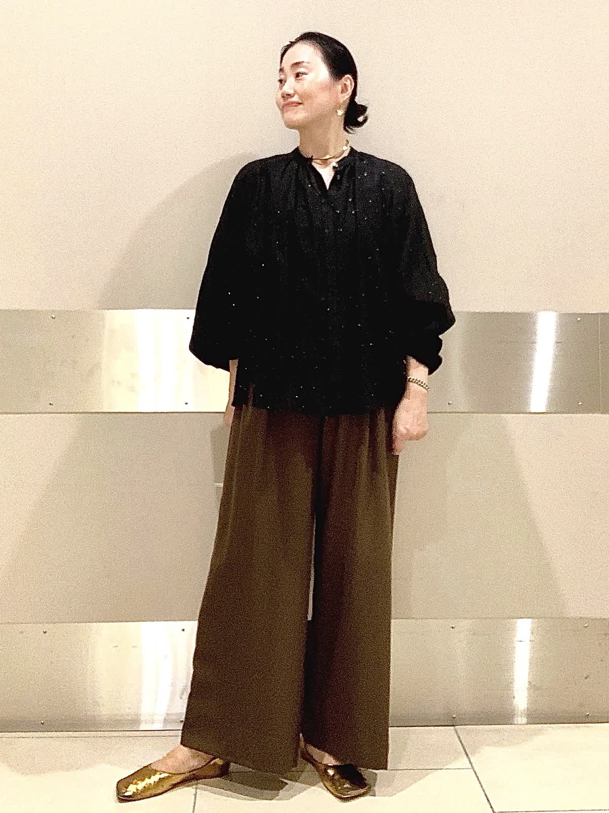 【着用カラー/サイズ】 ブラウスブラック/9号 パンツブラウン/11号 今すぐ楽しめる初秋のマニッシュコーディネート。ラメジャガードのブラウスはブラックでも華やぎ感たっぷり。今期おすすめのウール混ワイドパンツはライトな着心地で生地の落ち感が美しくツータックデザインでもウエストやヒップラインが張ってみえないのが嬉しいポイント。