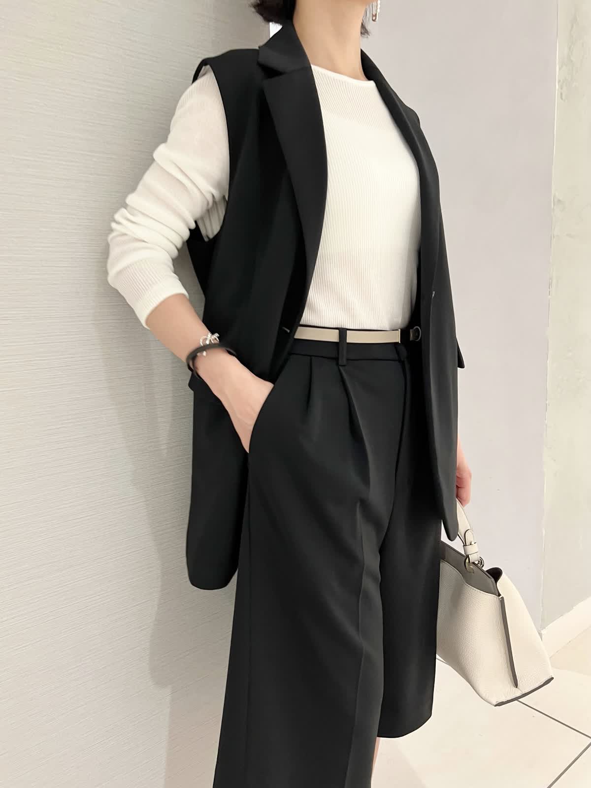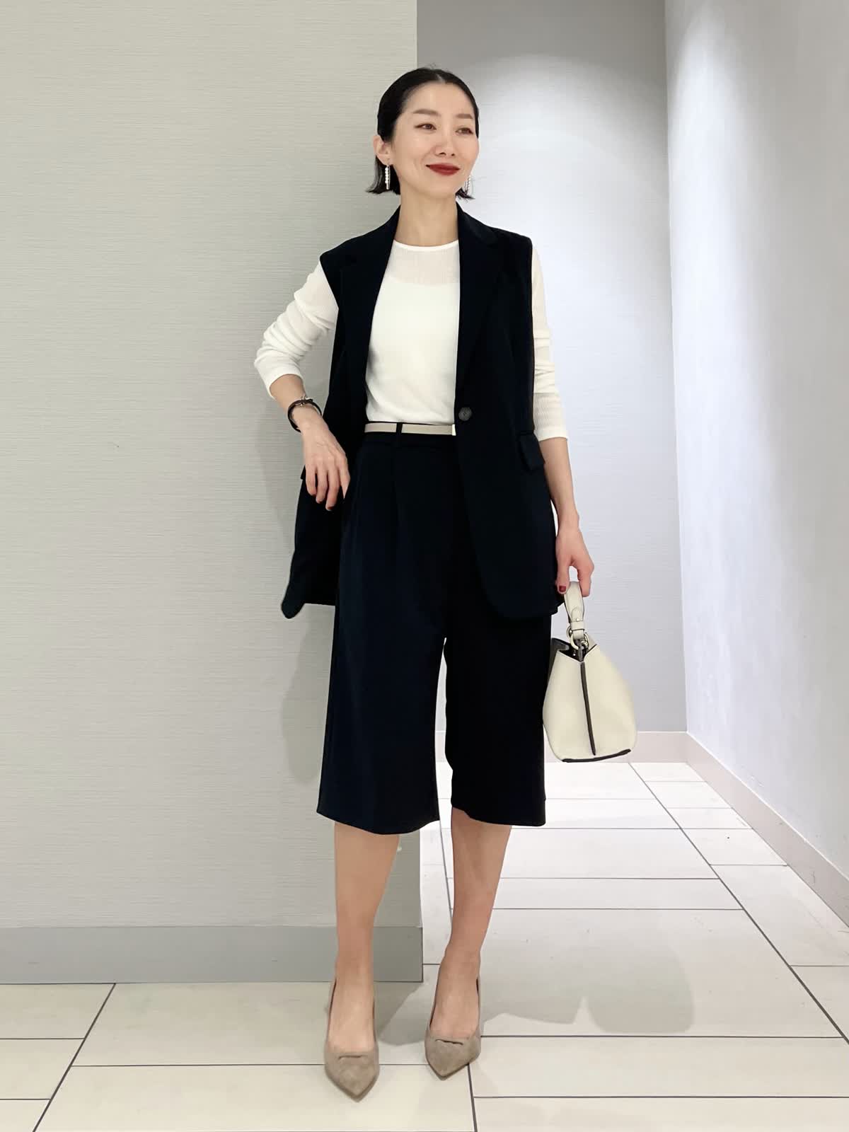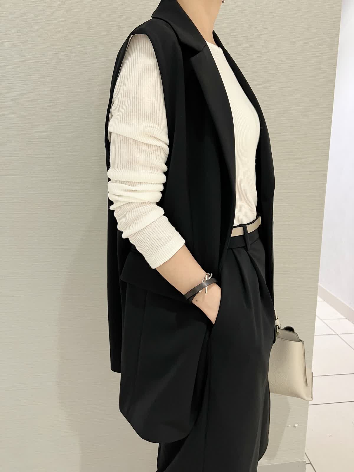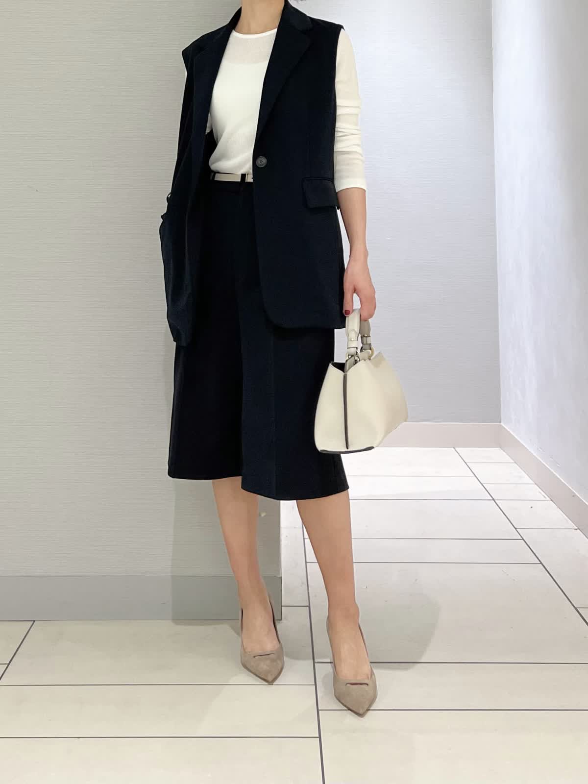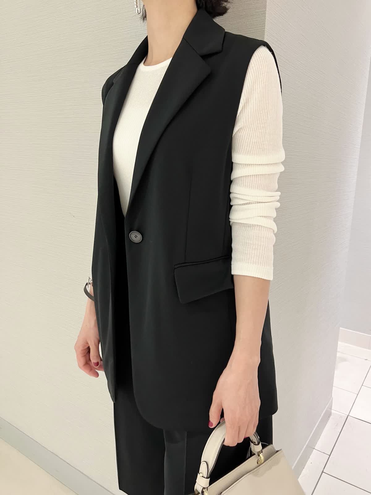 【カラー・サイズ】ジレ:ブラック・9号 パンツ:ブラック・7号 ニット:オフホワイト・9号 モノトーンでまとめた大人っぽいコーディネート。オフィスカジュアルからちょっとしたお出かけまで活躍するスタイルです。