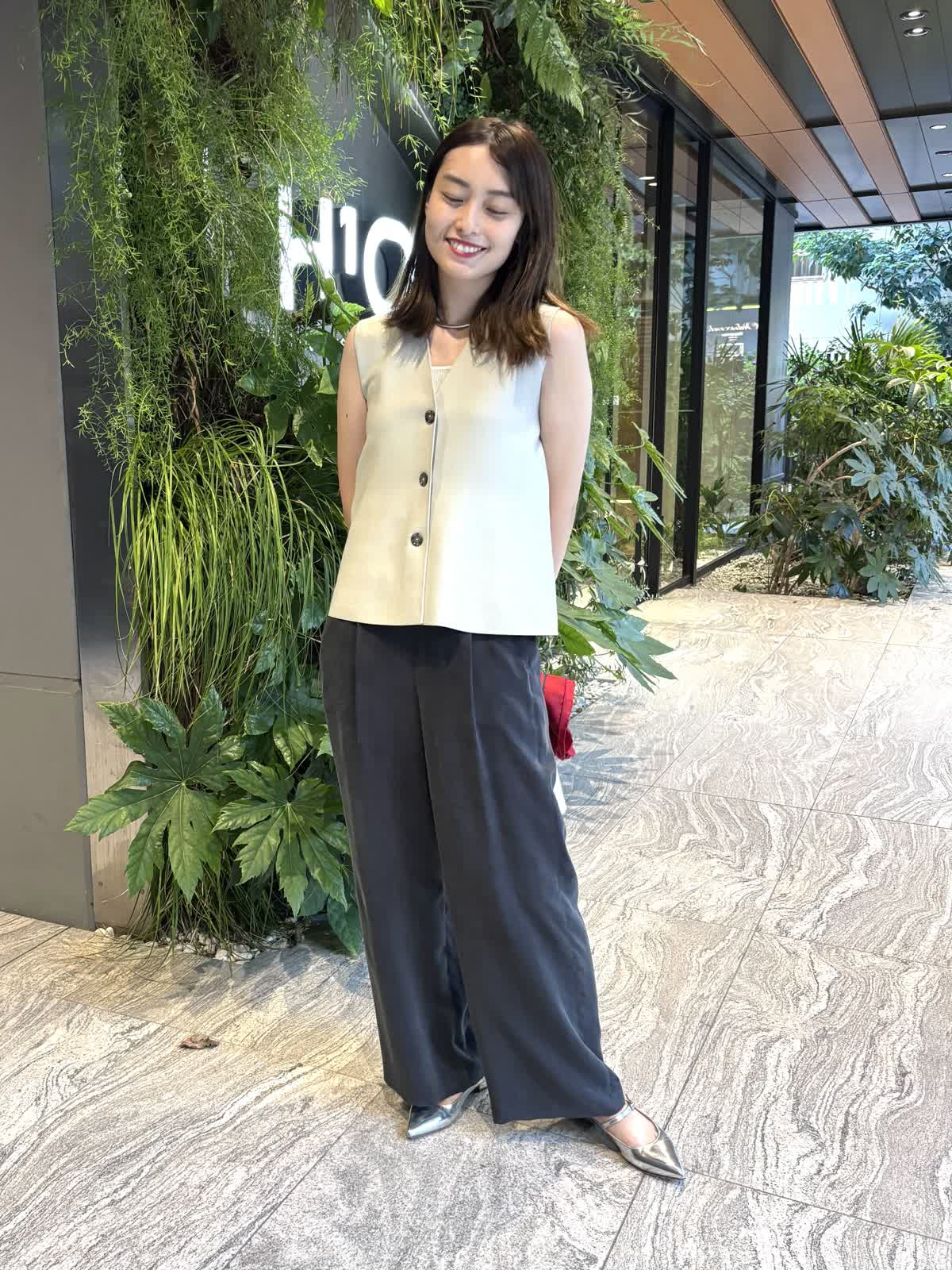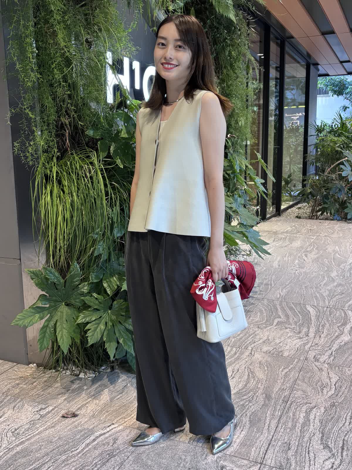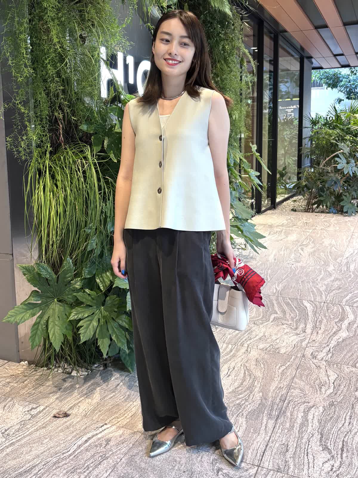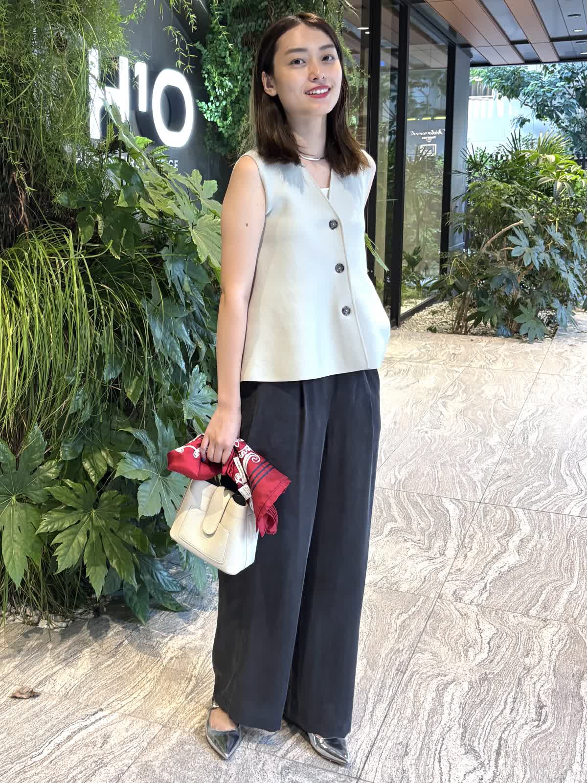 【着用カラー】ジレ:グレー、パンツ:スミクロ、バッグ:オフホワイト、スカーフ:レッド 【着用サイズ】ジレ:9号、パンツ:9号 コーディネートのテーマは残暑のオフィスコーデです。ニットジレはペプラムシルエットでおなか回りを隠してくれるのが嬉しいトップス。しっかりとした質感ながら、厚すぎない生地で、暑さの残る9月も快適に過ごすことができます。中に薄手のニットやカットソーを合わせれば、秋冬まで大活躍すること間違いなし。キュプラ100%のパンツはゆったりとしたシルエットで一日着ていても楽ちんなアイテム。絶妙なシルエットで、オフィスカジュアルにもお休みの日のコーデにも合わせることができます。程よいサイズ感のバッグは身軽な日にはぴったり。スカーフで色を足して、残暑でもオシャレを楽しめるコーデにしてみました。