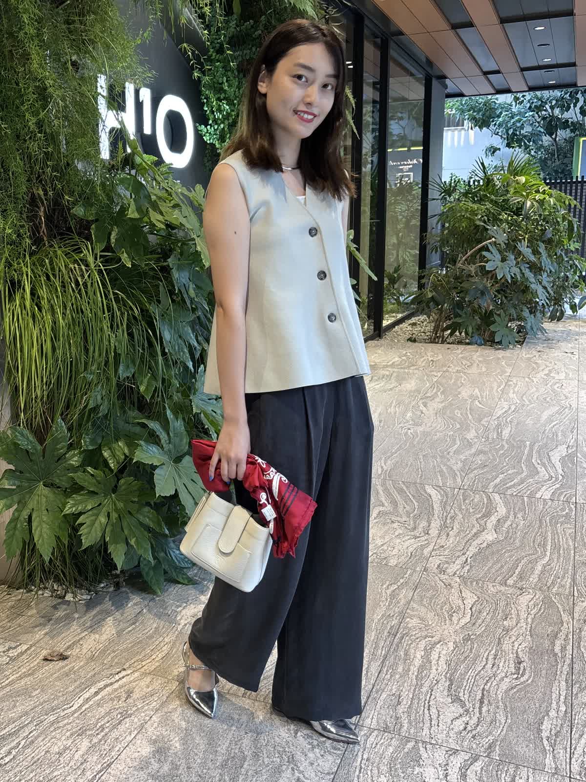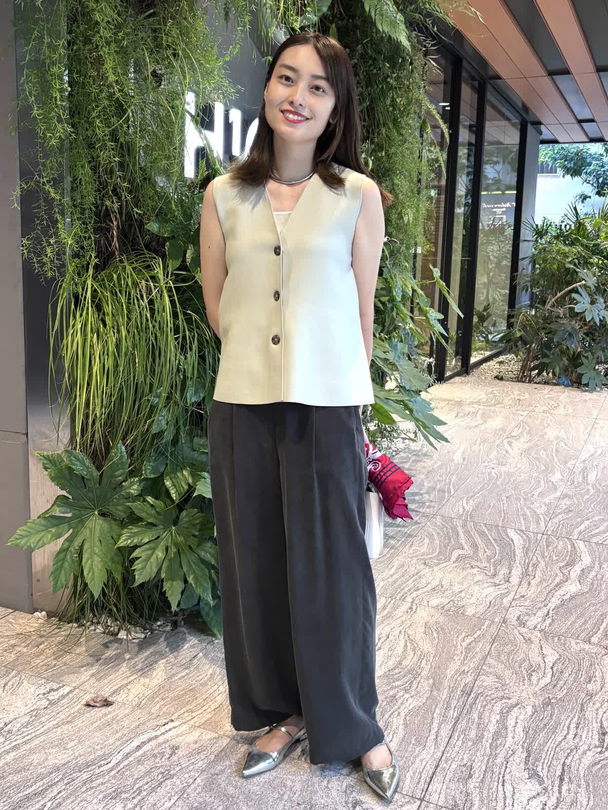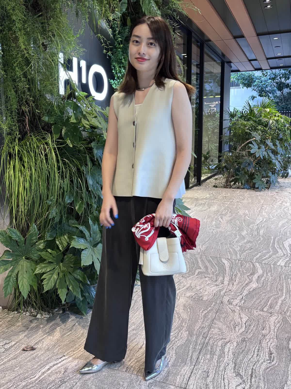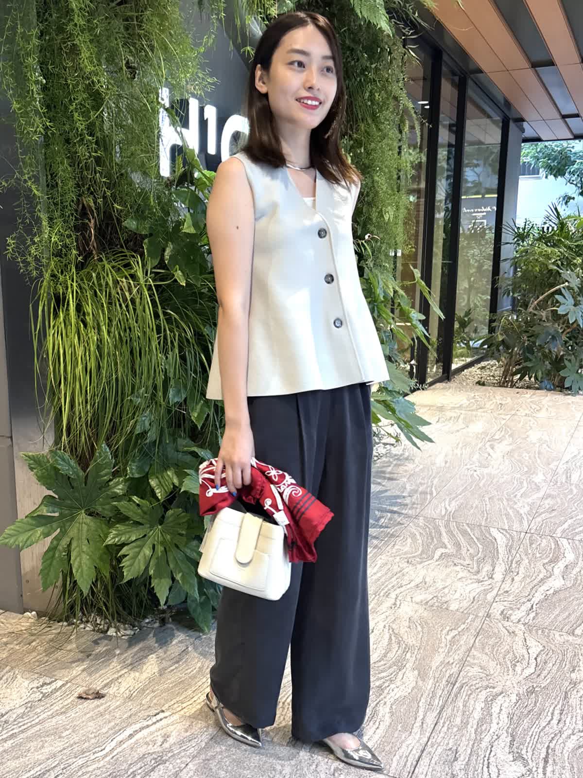 【着用カラー】ジレ:グレー、パンツ:スミクロ、バッグ:オフホワイト、スカーフ:レッド 【着用サイズ】ジレ:9号、パンツ:9号 コーディネートのテーマは残暑のオフィスコーデです。ニットジレはペプラムシルエットでおなか回りを隠してくれるのが嬉しいトップス。しっかりとした質感ながら、厚すぎない生地で、暑さの残る9月も快適に過ごすことができます。中に薄手のニットやカットソーを合わせれば、秋冬まで大活躍すること間違いなし。キュプラ100%のパンツはゆったりとしたシルエットで一日着ていても楽ちんなアイテム。絶妙なシルエットで、オフィスカジュアルにもお休みの日のコーデにも合わせることができます。程よいサイズ感のバッグは身軽な日にはぴったり。スカーフで色を足して、残暑でもオシャレを楽しめるコーデにしてみました。