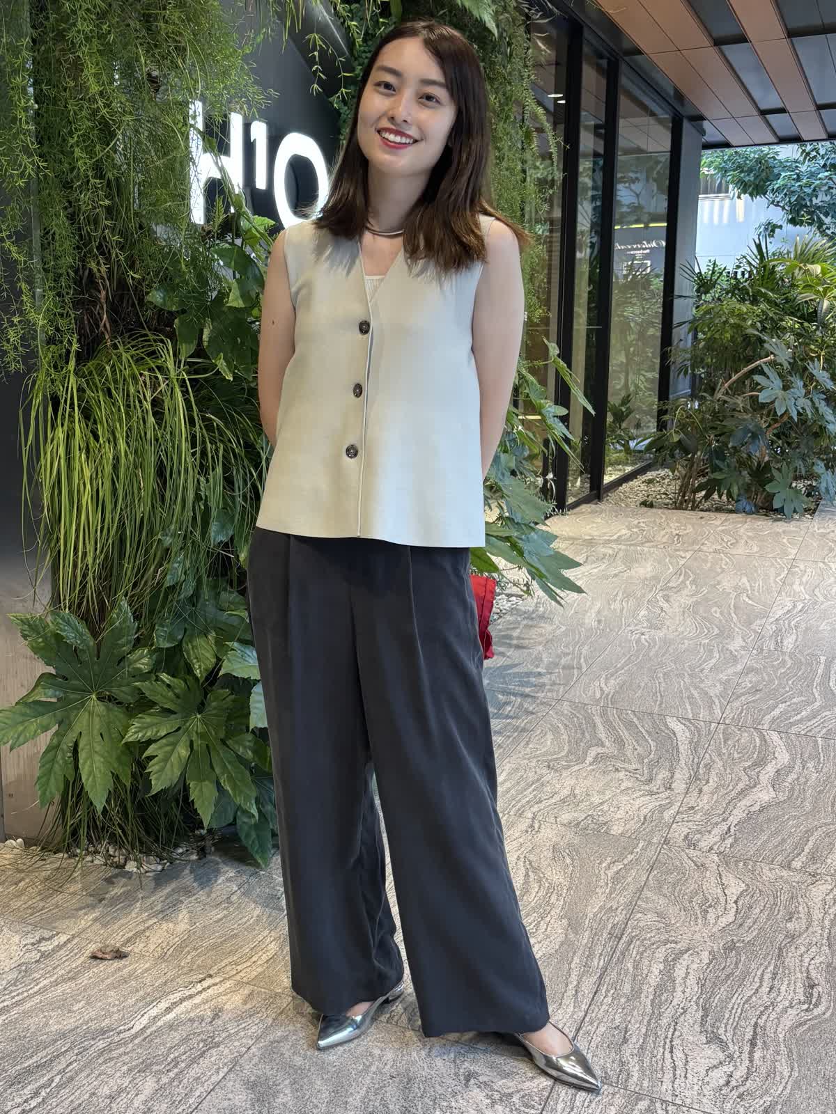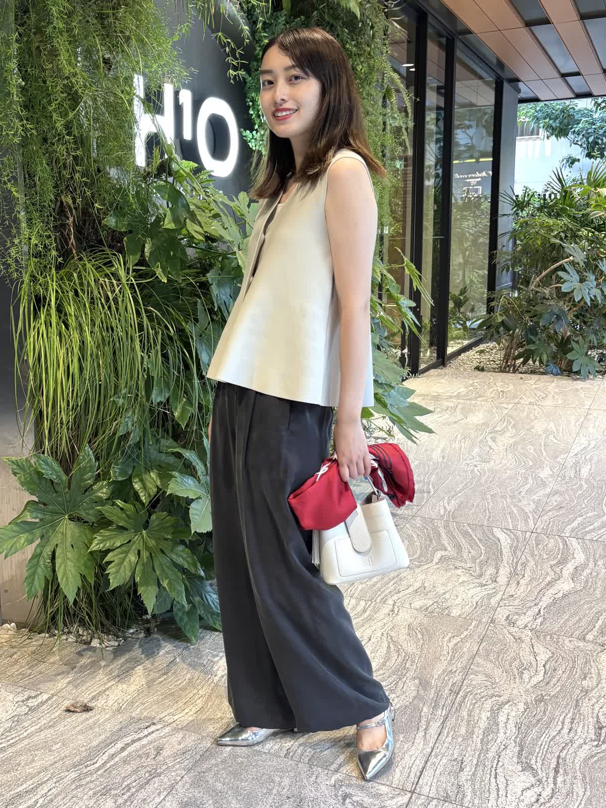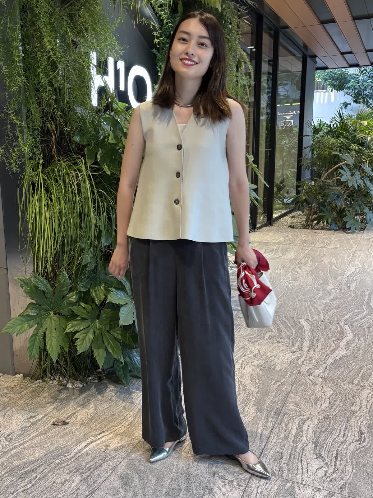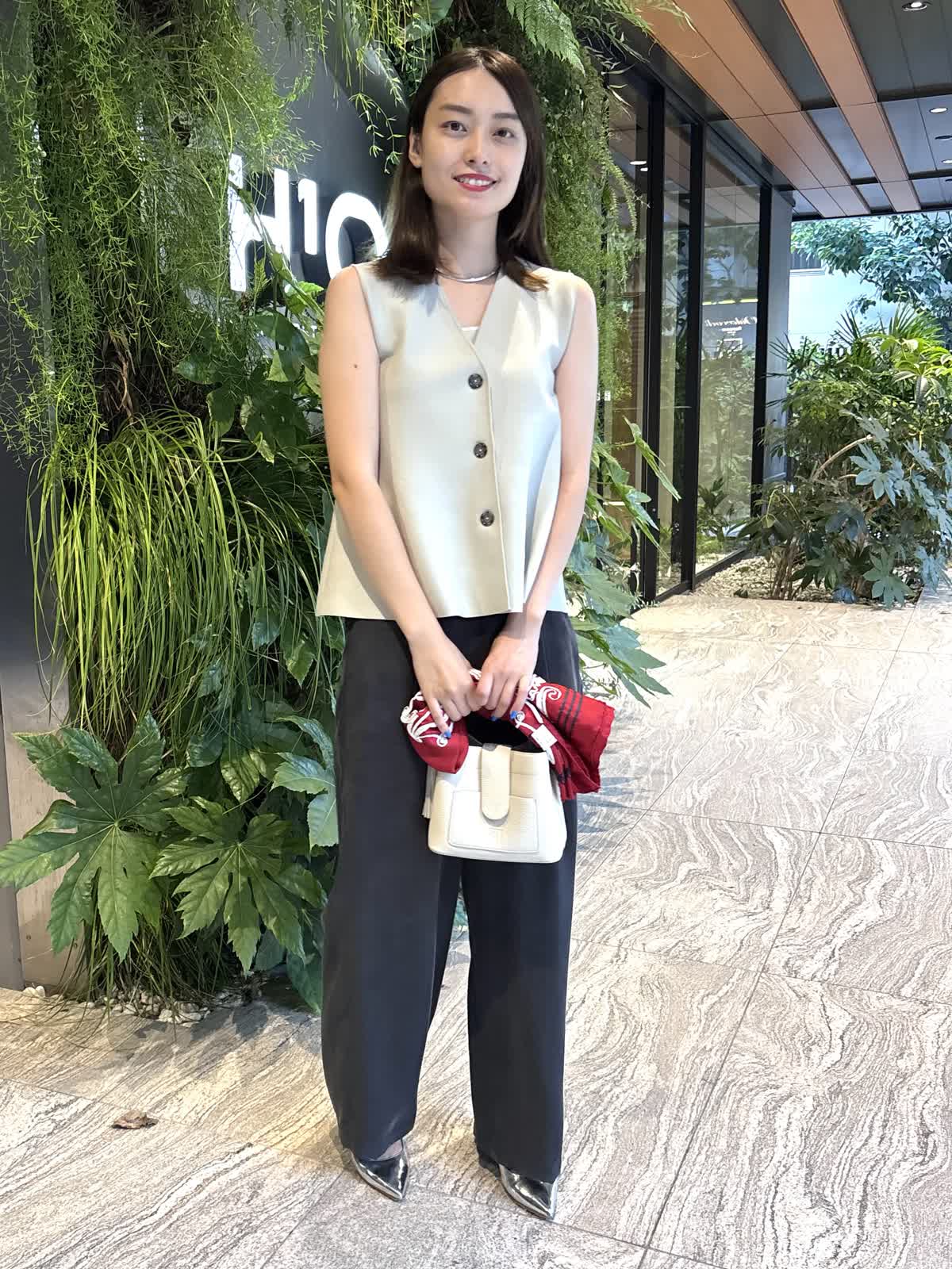 【着用カラー】ジレ:グレー、パンツ:スミクロ、バッグ:オフホワイト、スカーフ:レッド 【着用サイズ】ジレ:9号、パンツ:9号 コーディネートのテーマは残暑のオフィスコーデです。ニットジレはペプラムシルエットでおなか回りを隠してくれるのが嬉しいトップス。しっかりとした質感ながら、厚すぎない生地で、暑さの残る9月も快適に過ごすことができます。中に薄手のニットやカットソーを合わせれば、秋冬まで大活躍すること間違いなし。キュプラ100%のパンツはゆったりとしたシルエットで一日着ていても楽ちんなアイテム。絶妙なシルエットで、オフィスカジュアルにもお休みの日のコーデにも合わせることができます。程よいサイズ感のバッグは身軽な日にはぴったり。スカーフで色を足して、残暑でもオシャレを楽しめるコーデにしてみました。