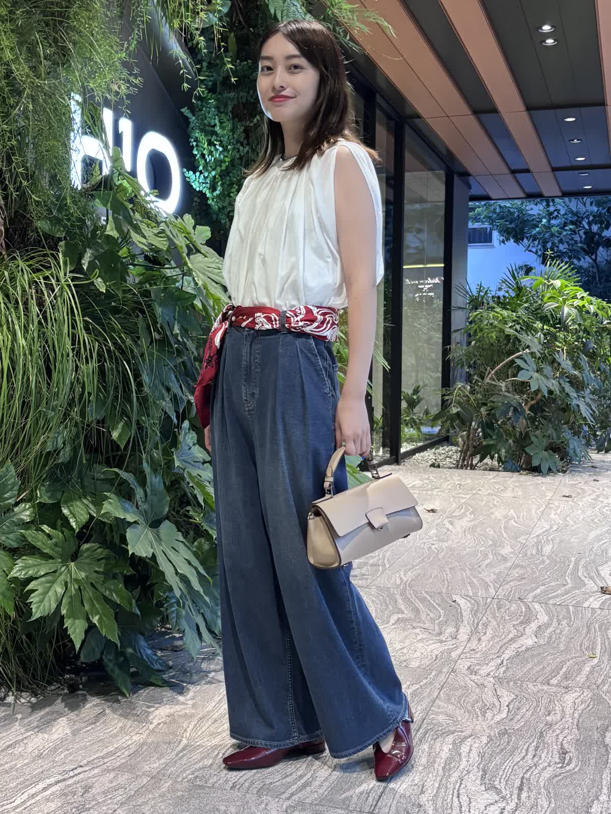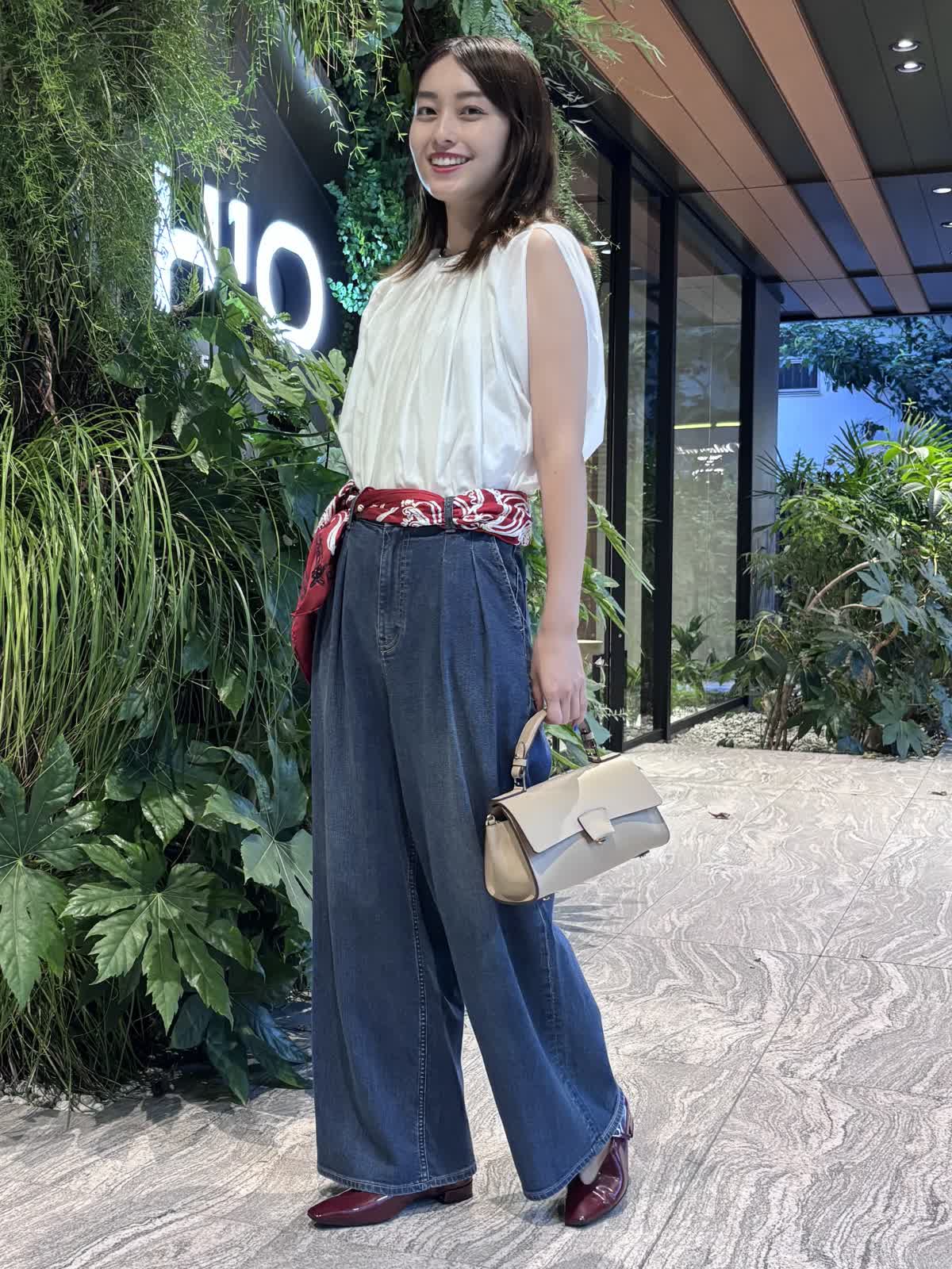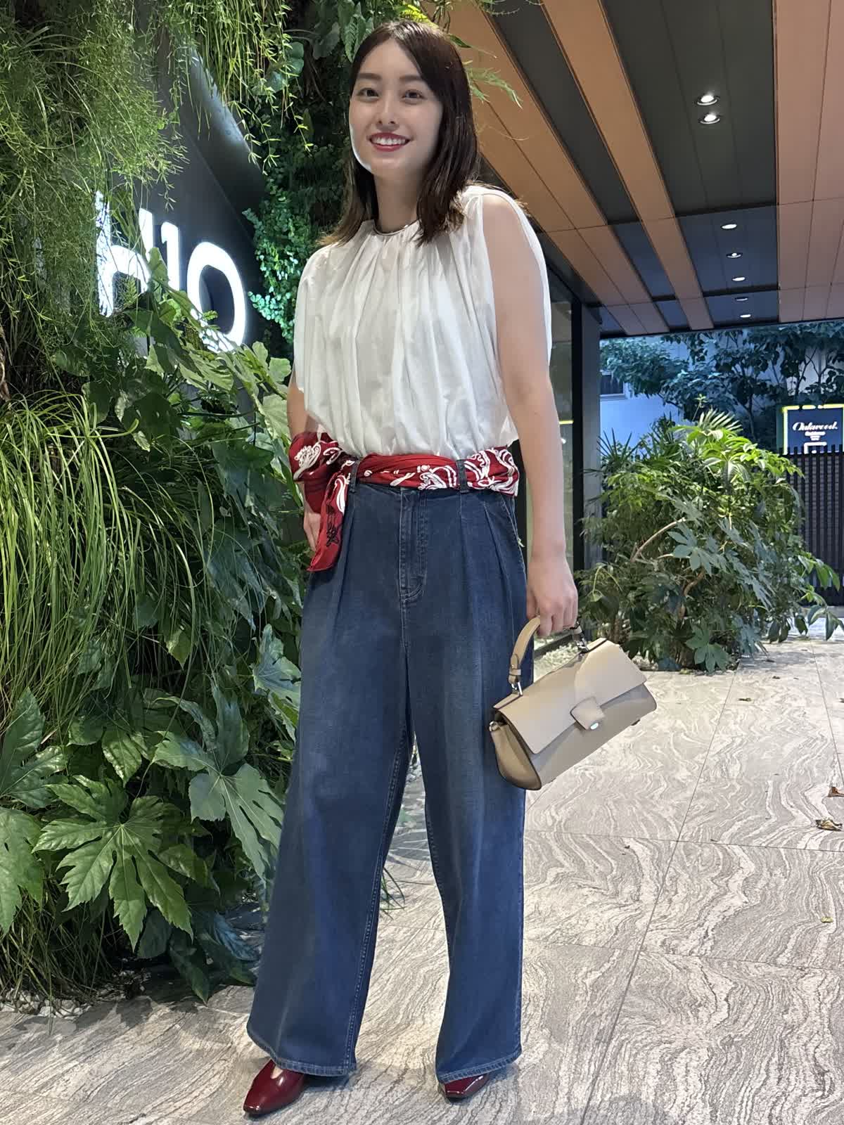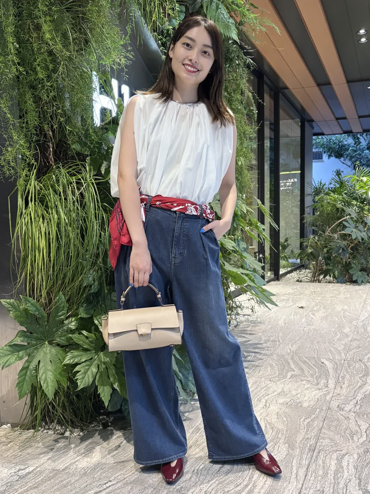 【着用カラー】ブラウス:オフホワイト、パンツ:インディゴ、スカーフ:レッド、バッグ:ベージュ 【着用サイズ】ブラウス:9号、パンツ:9号 コーディネートのテーマは残暑のお出かけコーデです。トップスのシアーブラウスは袖や首元のデザインが個性的で、シンプルながら他と差別化できるアイテム。軽やかな質感で、じめじめとした暑い夏にもぴったり。Healthy DenimのINED別注デニムは、程よくワイドなシルエットで使い勝手が抜群。やわらかい生地で、一日中快適に過ごすことができます。落ち着いたインディゴで、秋冬まで大活躍するアイテムです。バッグはペットボトルも入るちょうどいい大きさ。腰のスカーフで色味を足して、遊び心のある休日コーデに仕上げました。