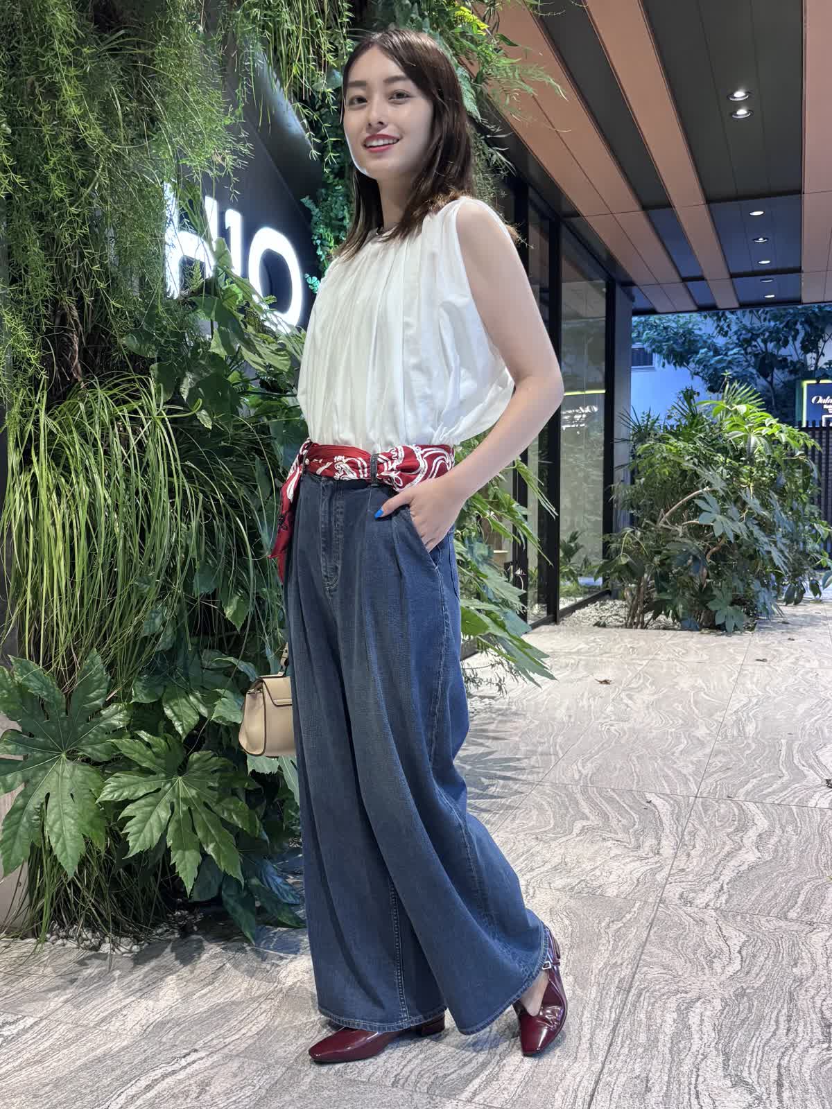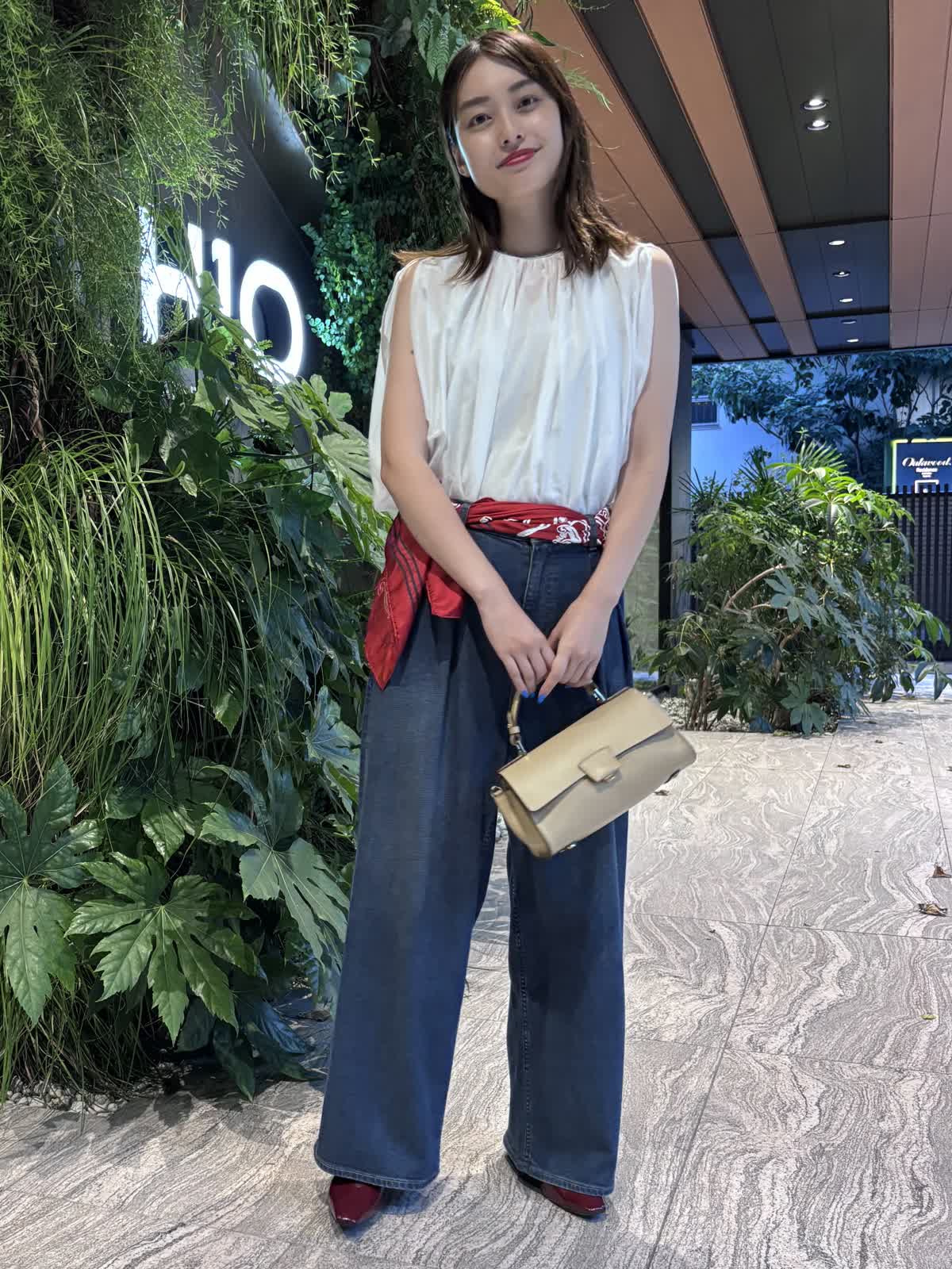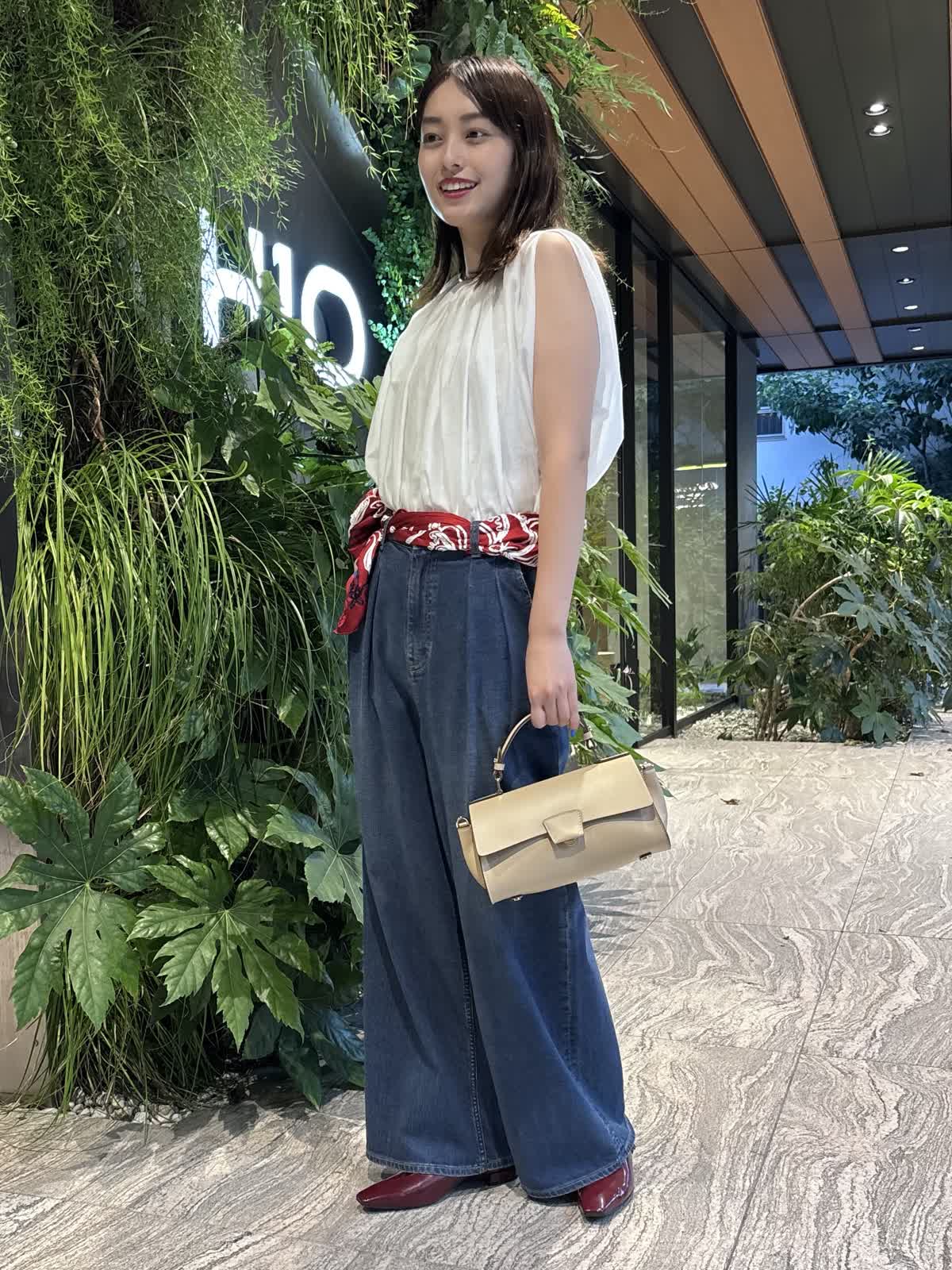 【着用カラー】ブラウス:オフホワイト、パンツ:インディゴ、スカーフ:レッド、バッグ:ベージュ 【着用サイズ】ブラウス:9号、パンツ:9号 コーディネートのテーマは残暑のお出かけコーデです。トップスのシアーブラウスは袖や首元のデザインが個性的で、シンプルながら他と差別化できるアイテム。軽やかな質感で、じめじめとした暑い夏にもぴったり。Healthy DenimのINED別注デニムは、程よくワイドなシルエットで使い勝手が抜群。やわらかい生地で、一日中快適に過ごすことができます。落ち着いたインディゴで、秋冬まで大活躍するアイテムです。バッグはペットボトルも入るちょうどいい大きさ。腰のスカーフで色味を足して、遊び心のある休日コーデに仕上げました。