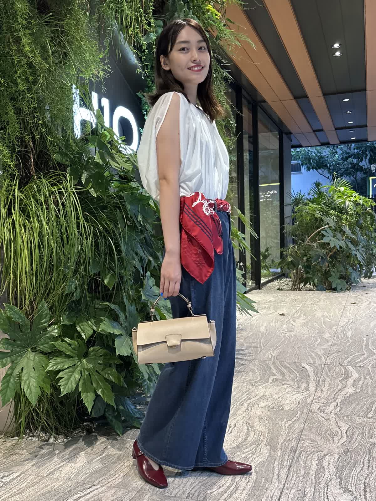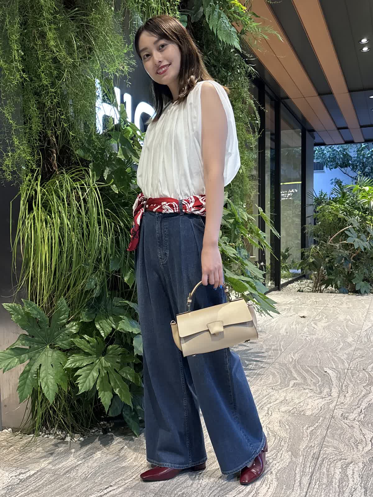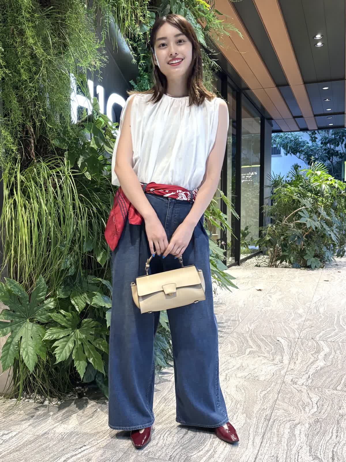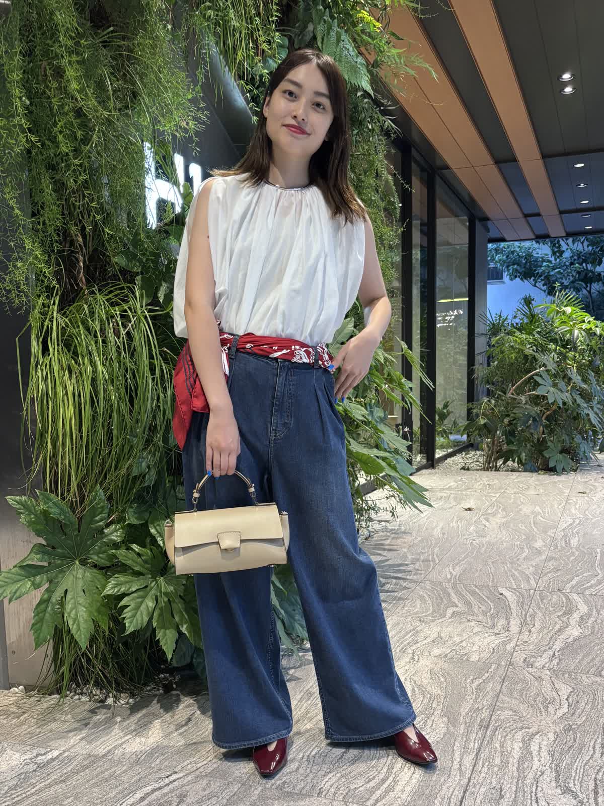 【着用カラー】ブラウス:オフホワイト、パンツ:インディゴ、スカーフ:レッド、バッグ:ベージュ 【着用サイズ】ブラウス:9号、パンツ:9号 コーディネートのテーマは残暑のお出かけコーデです。トップスのシアーブラウスは袖や首元のデザインが個性的で、シンプルながら他と差別化できるアイテム。軽やかな質感で、じめじめとした暑い夏にもぴったり。Healthy DenimのINED別注デニムは、程よくワイドなシルエットで使い勝手が抜群。やわらかい生地で、一日中快適に過ごすことができます。落ち着いたインディゴで、秋冬まで大活躍するアイテムです。バッグはペットボトルも入るちょうどいい大きさ。腰のスカーフで色味を足して、遊び心のある休日コーデに仕上げました。