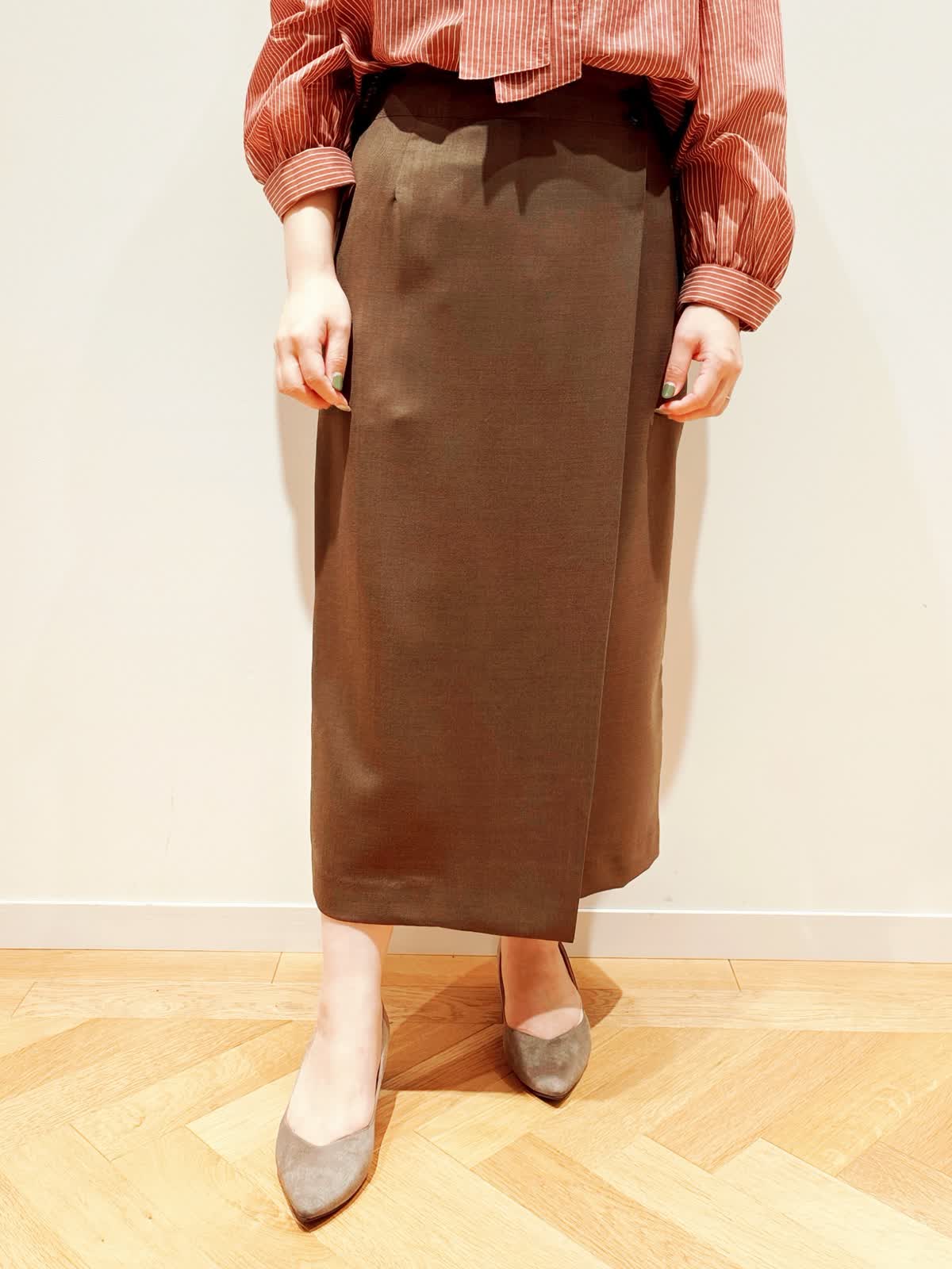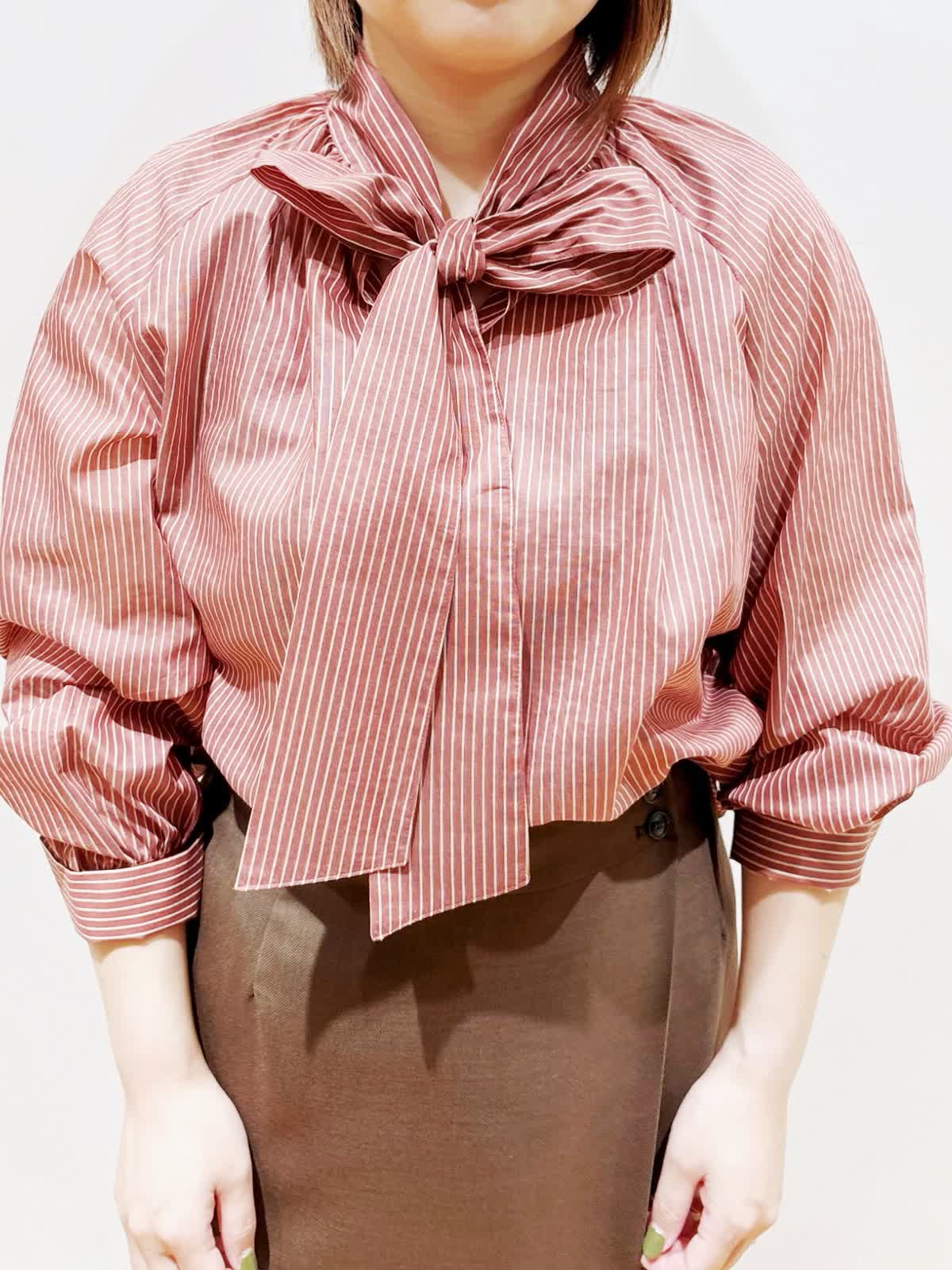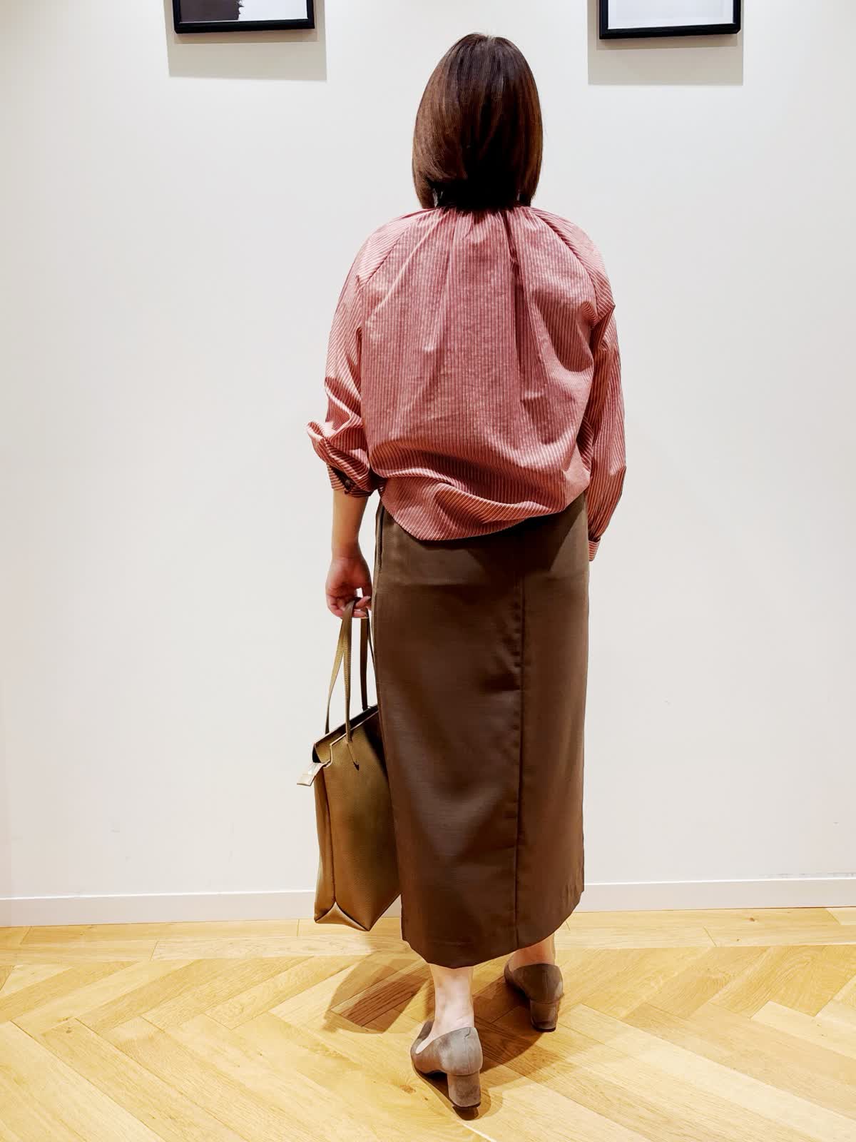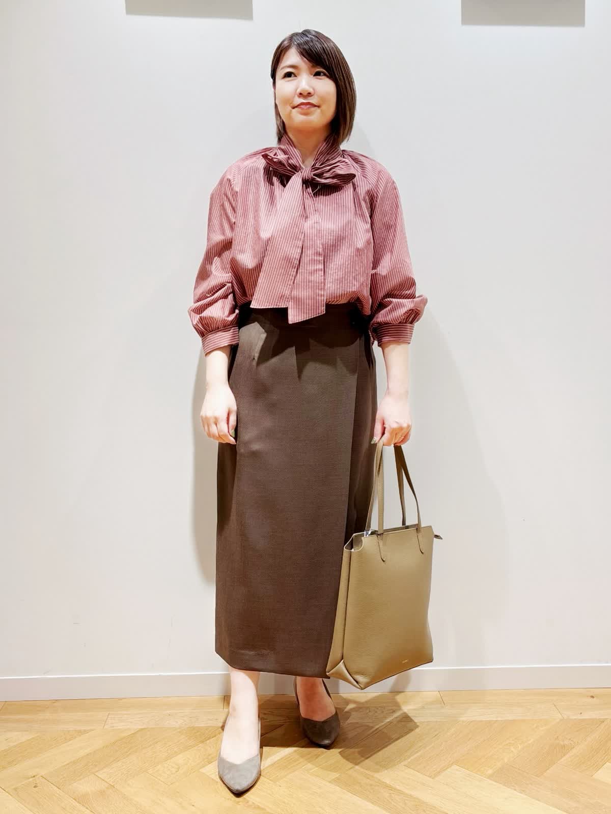 【着用サイズ】ブラウス:9号 スカート:9号 【着用カラー】ブラウス:レンガ スカート:ブラウン バック:キャメル ブラウスは光沢のあるシャドーボーダーが特徴です。上品で軽く、顔周りにボウタイがあることで華やかに見せてくれます。後ろ裾が長めなのでパンツスタイルにも合わせやすいです。スカートはブラウスもインしやすいゆとりがあり、フロントには深めのスリットを施し、抜け感と軽やかさを演出します。