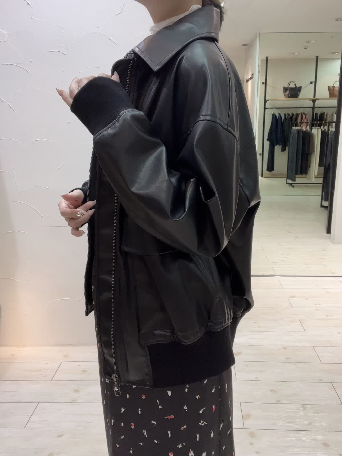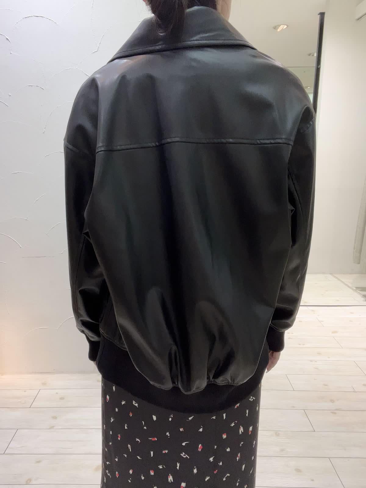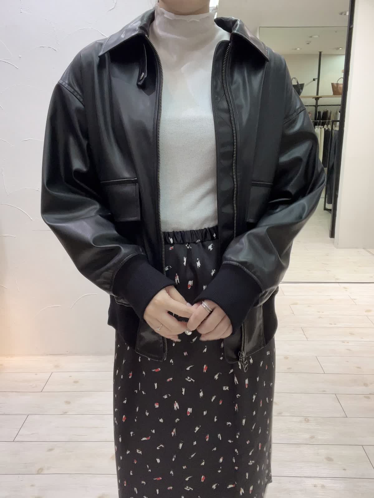 【着用サイズ】全て9号orフリーサイズ 【着用カラー】ブルゾン:ブラック カットソー:オフホワイト スカート:ブラック 秋冬のライトアウターコーデ。早めにチェックしておきたい今年のライトアウターはフェイクレザーがおすすめ。ゆったりとしたサイジングで楽にお召しいただけます。女性らしいスタイリングにゆるく羽織った甘辛コーデが楽しめるデザイン。