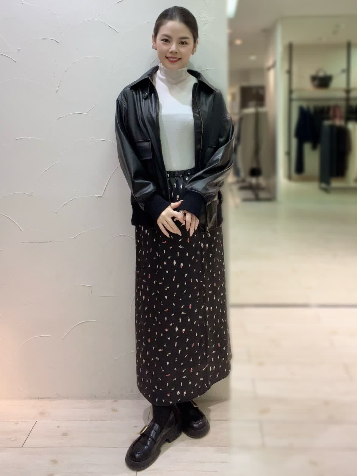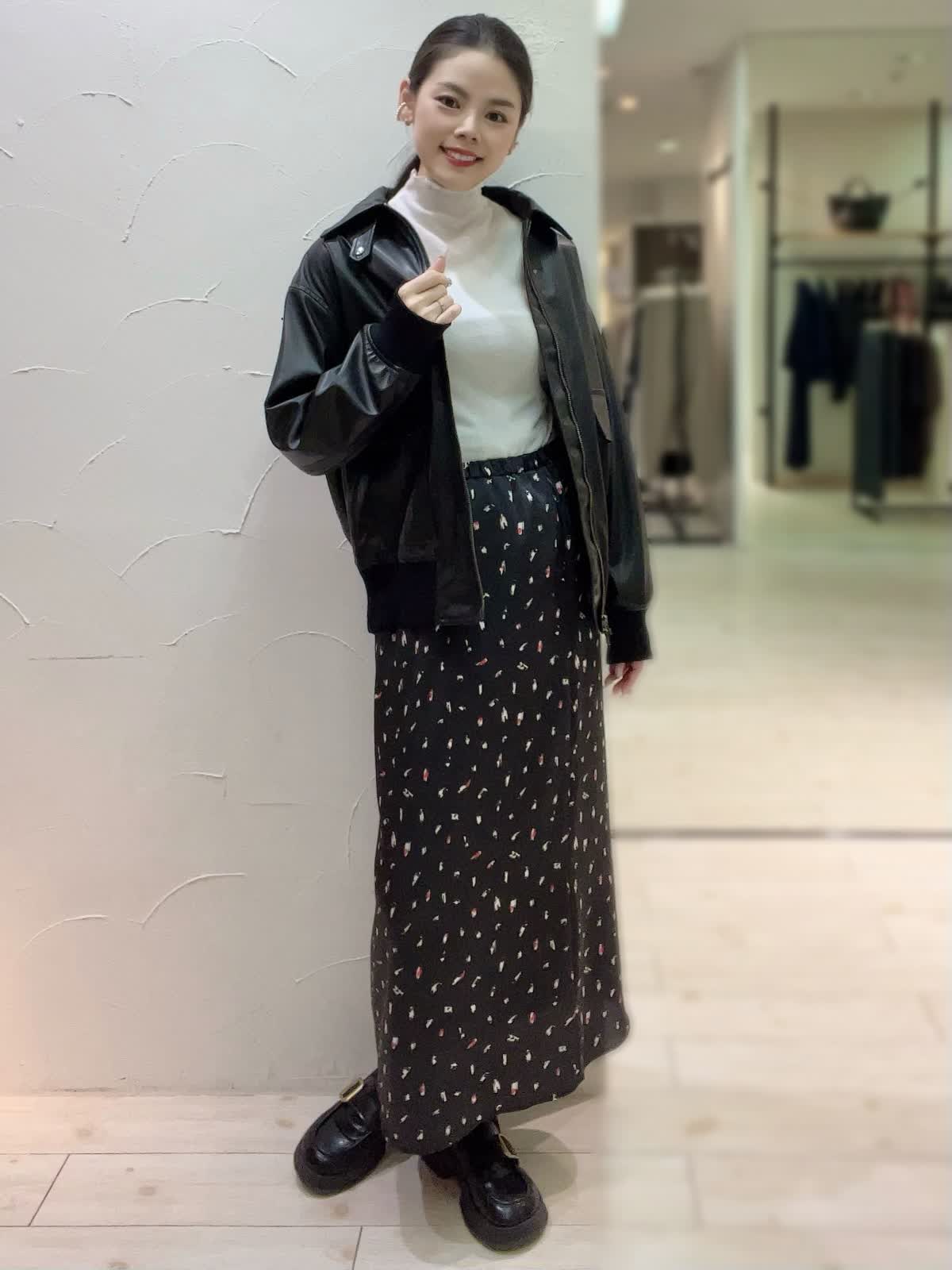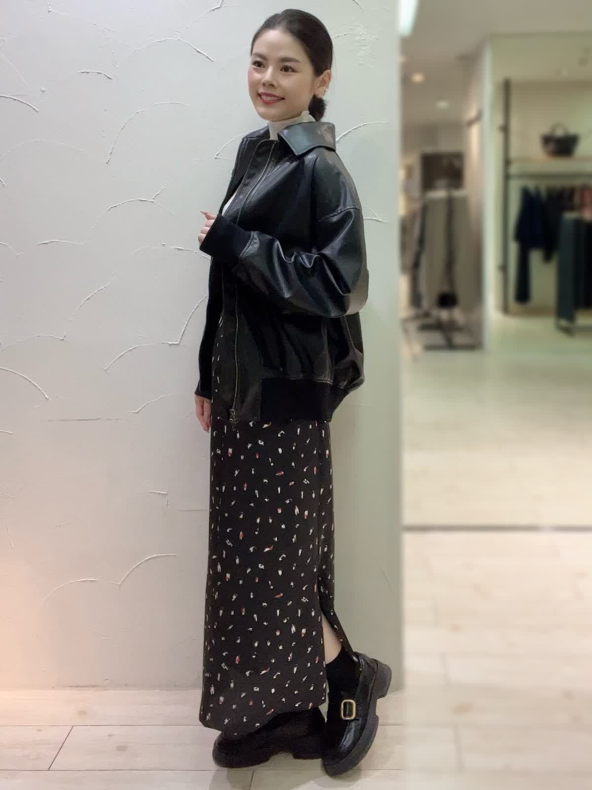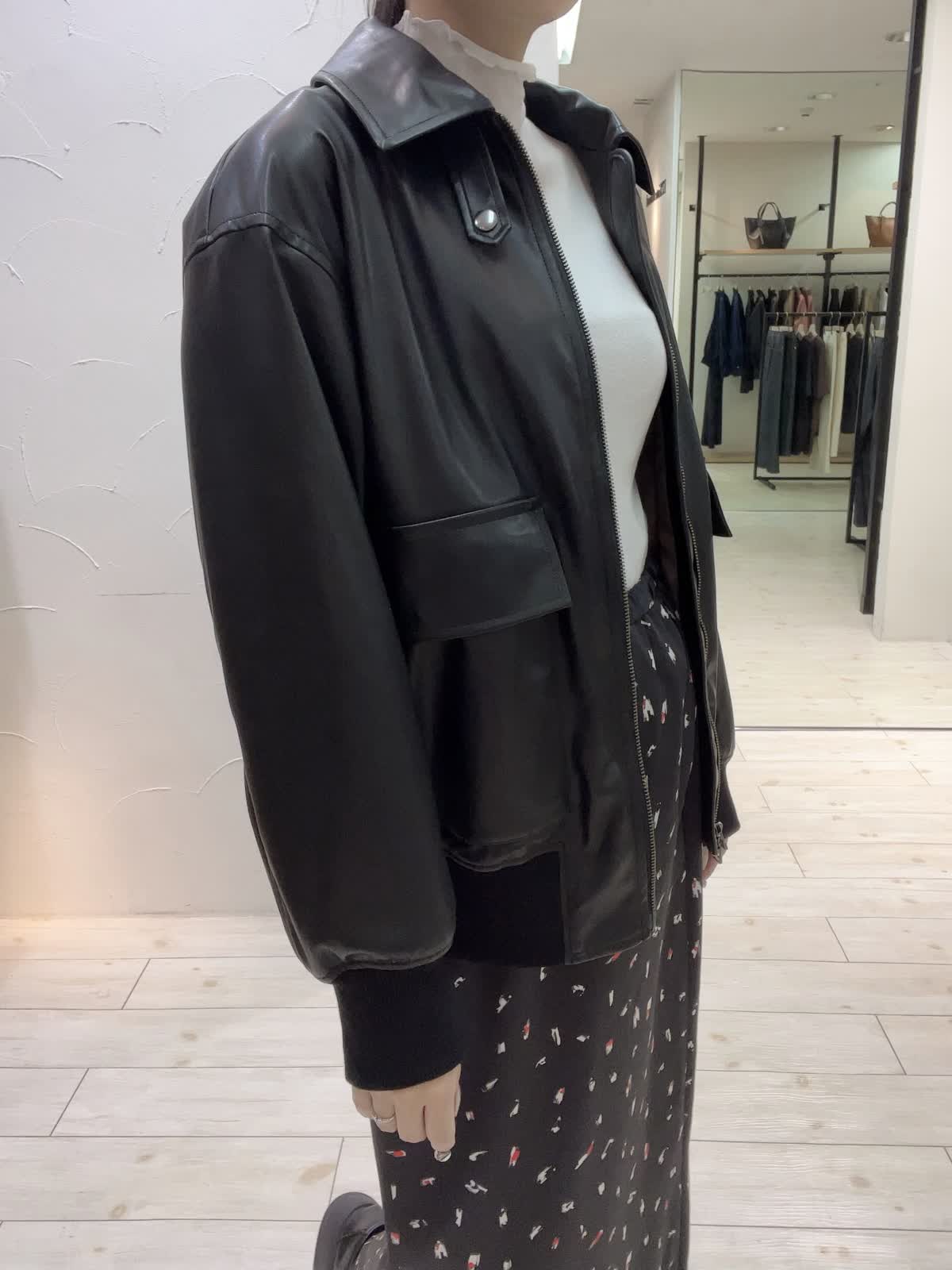 【着用サイズ】全て9号orフリーサイズ 【着用カラー】ブルゾン:ブラック カットソー:オフホワイト スカート:ブラック 秋冬のライトアウターコーデ。早めにチェックしておきたい今年のライトアウターはフェイクレザーがおすすめ。ゆったりとしたサイジングで楽にお召しいただけます。女性らしいスタイリングにゆるく羽織った甘辛コーデが楽しめるデザイン。