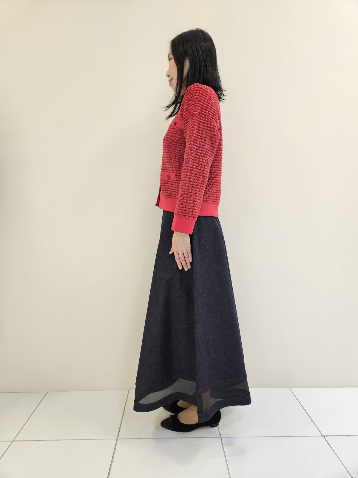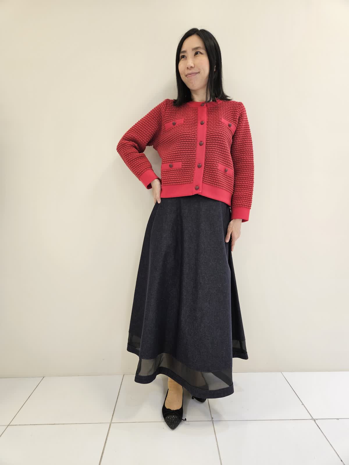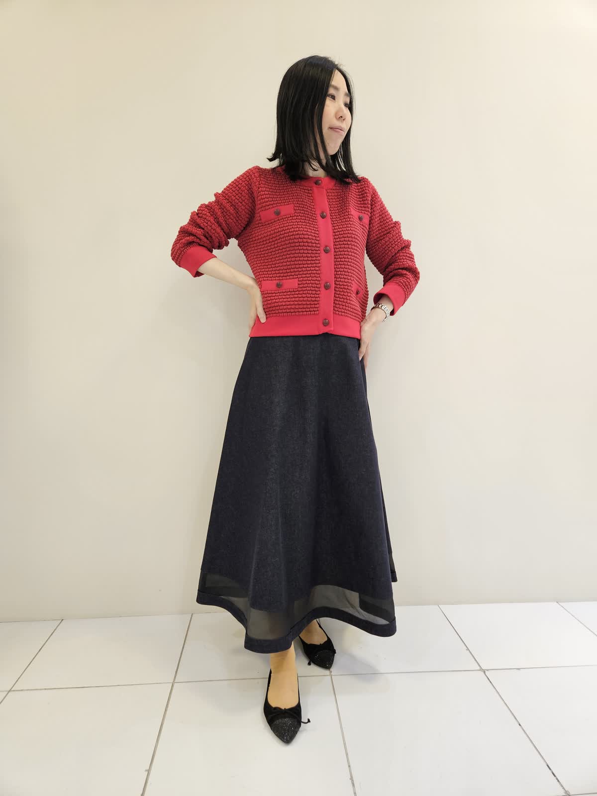 【着用サイズ・カラー】カーディガン:レッド9号・スカート:インディゴ9号 カーディガンはボタンがポイントで前を開けてワンピース合わせも◎ スカートは形が綺麗で裾がポイントになっています。左側にあるボタンがポイントで後ろがゴムで履いていて楽です。
