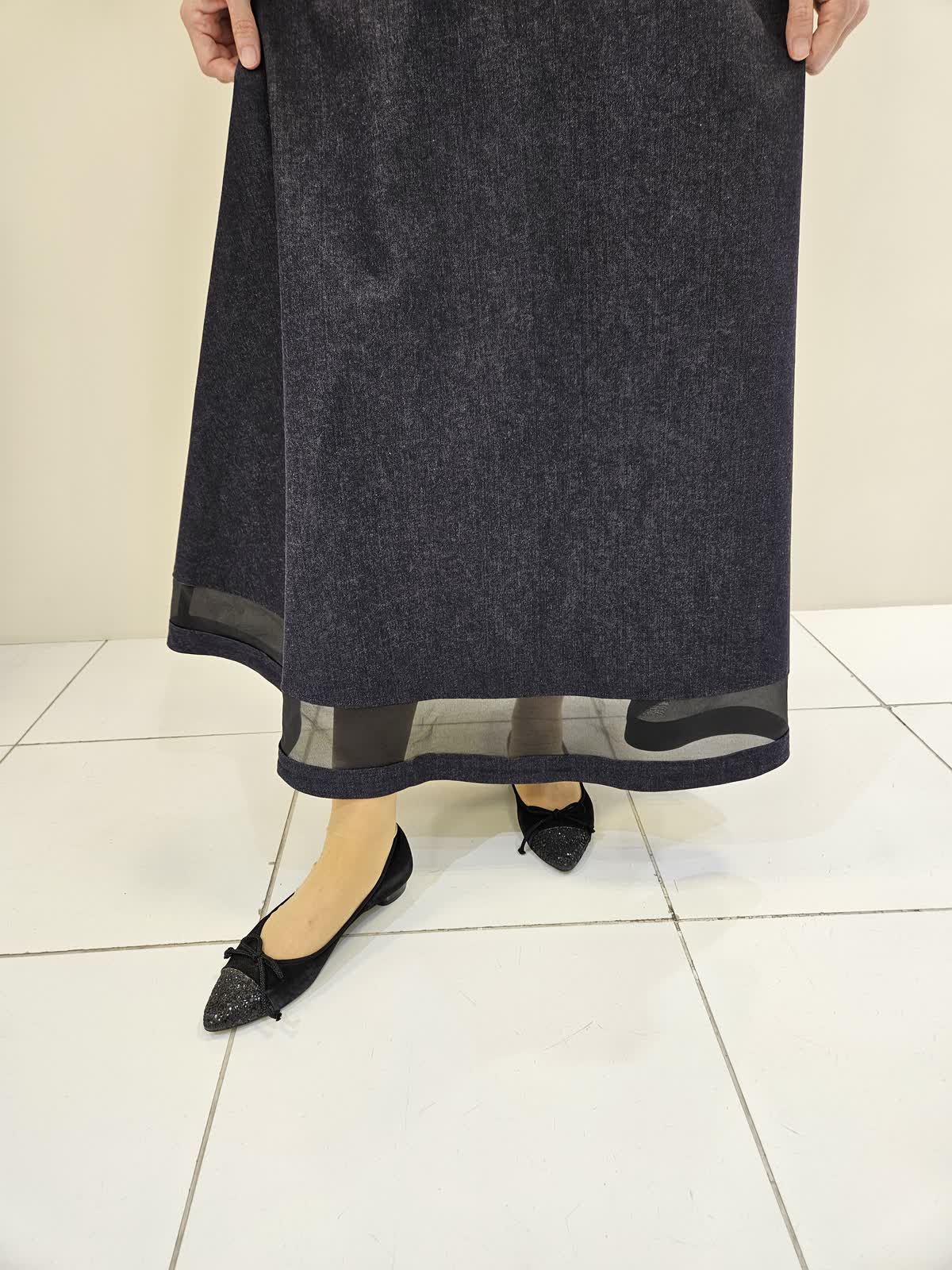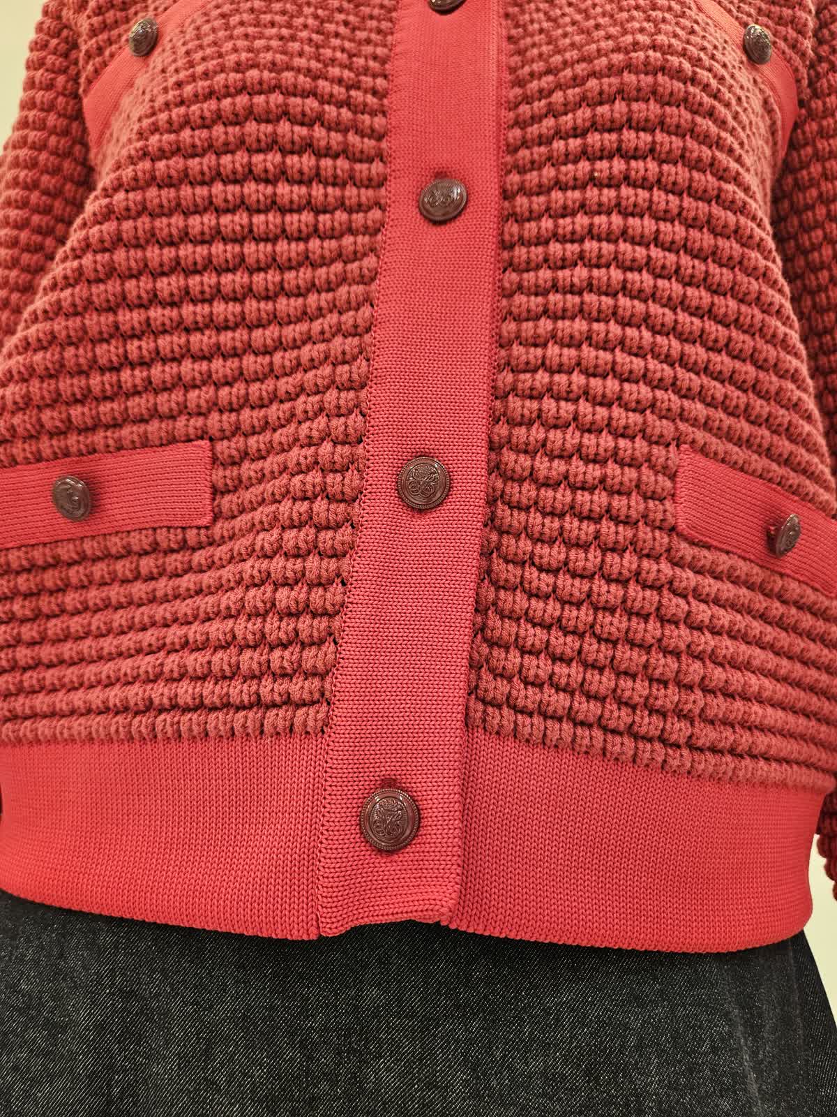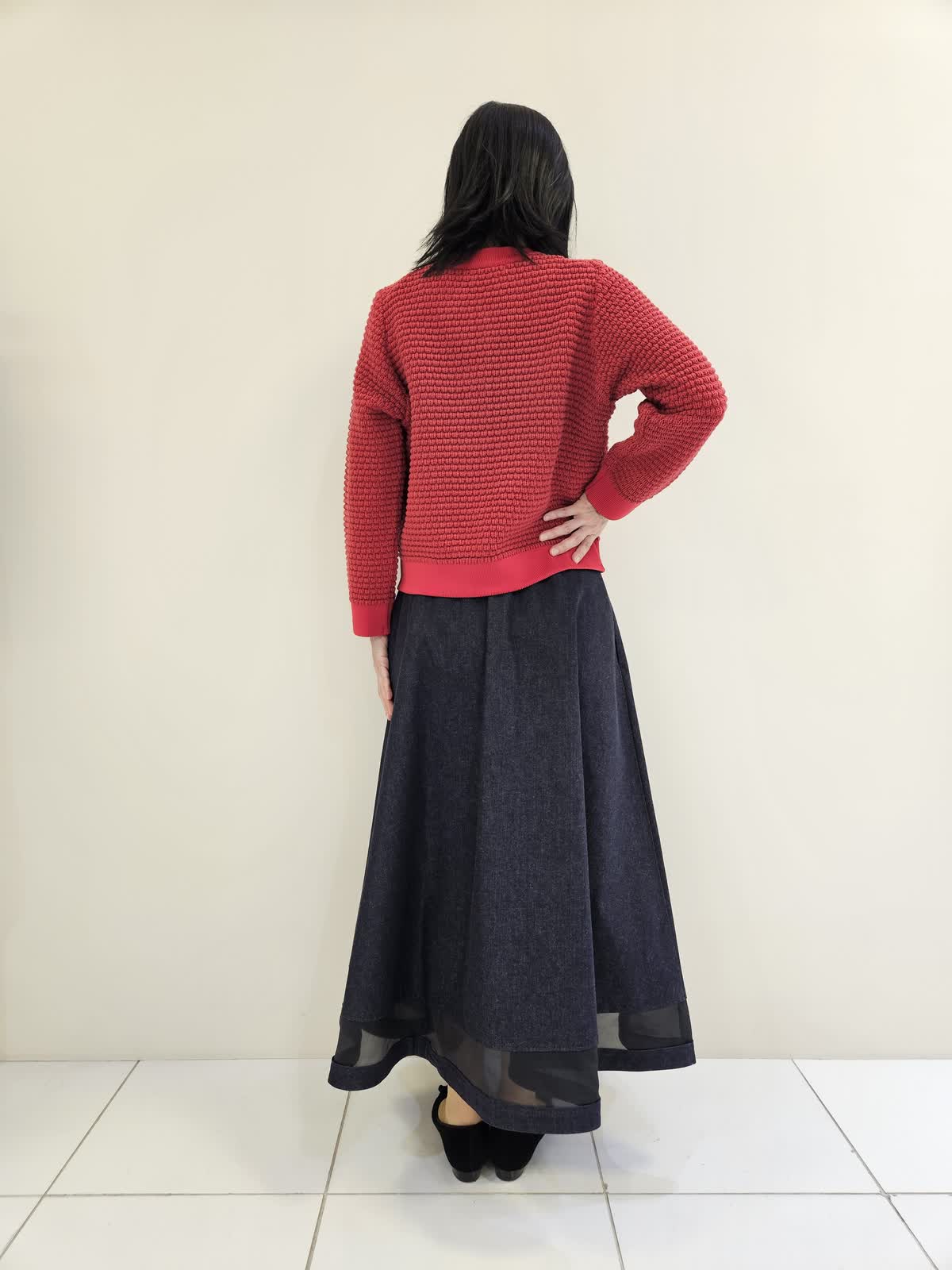 【着用サイズ・カラー】カーディガン:レッド9号・スカート:インディゴ9号 カーディガンはボタンがポイントで前を開けてワンピース合わせも◎ スカートは形が綺麗で裾がポイントになっています。左側にあるボタンがポイントで後ろがゴムで履いていて楽です。