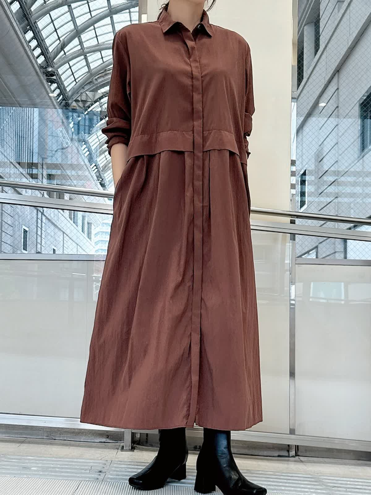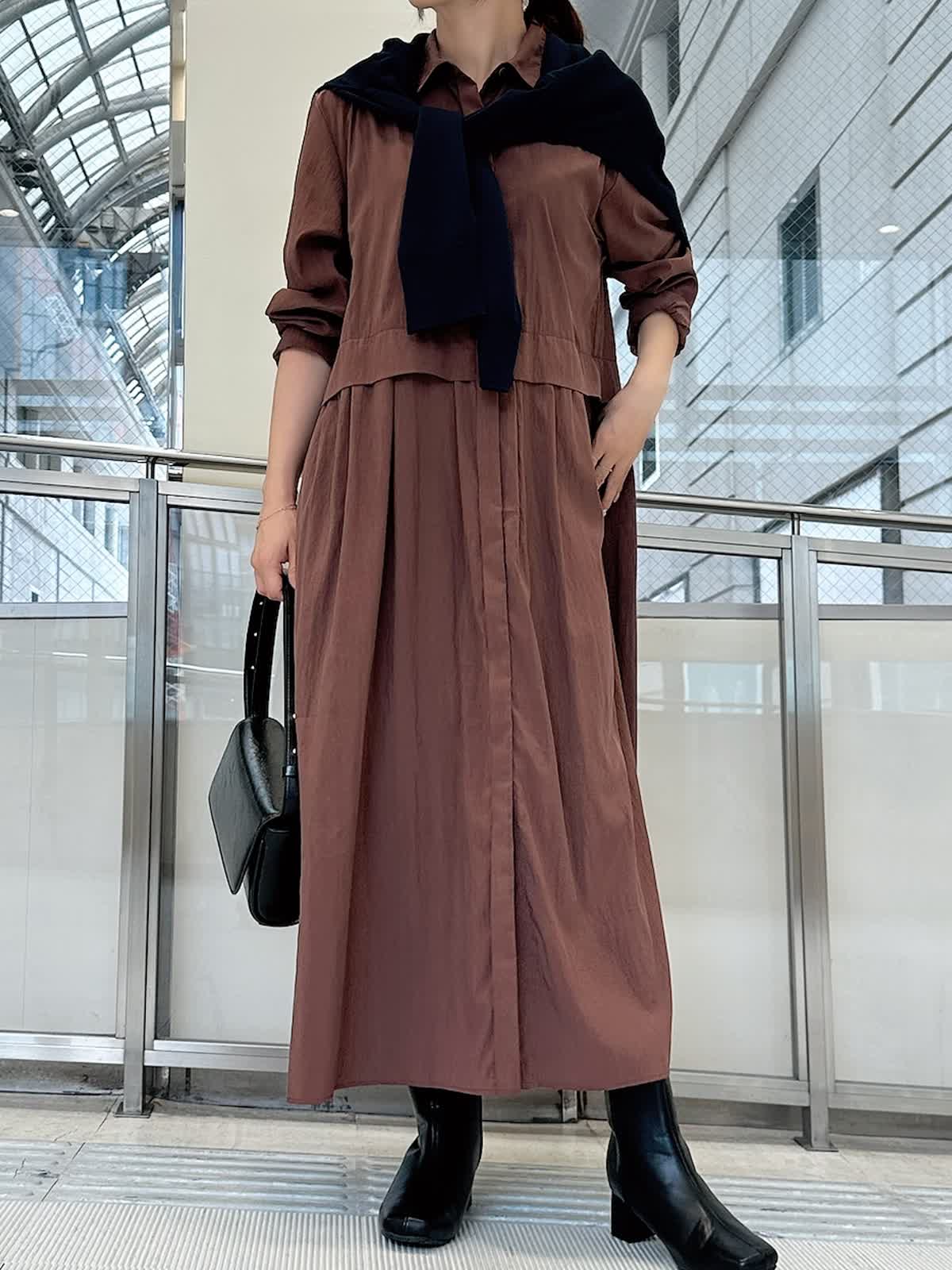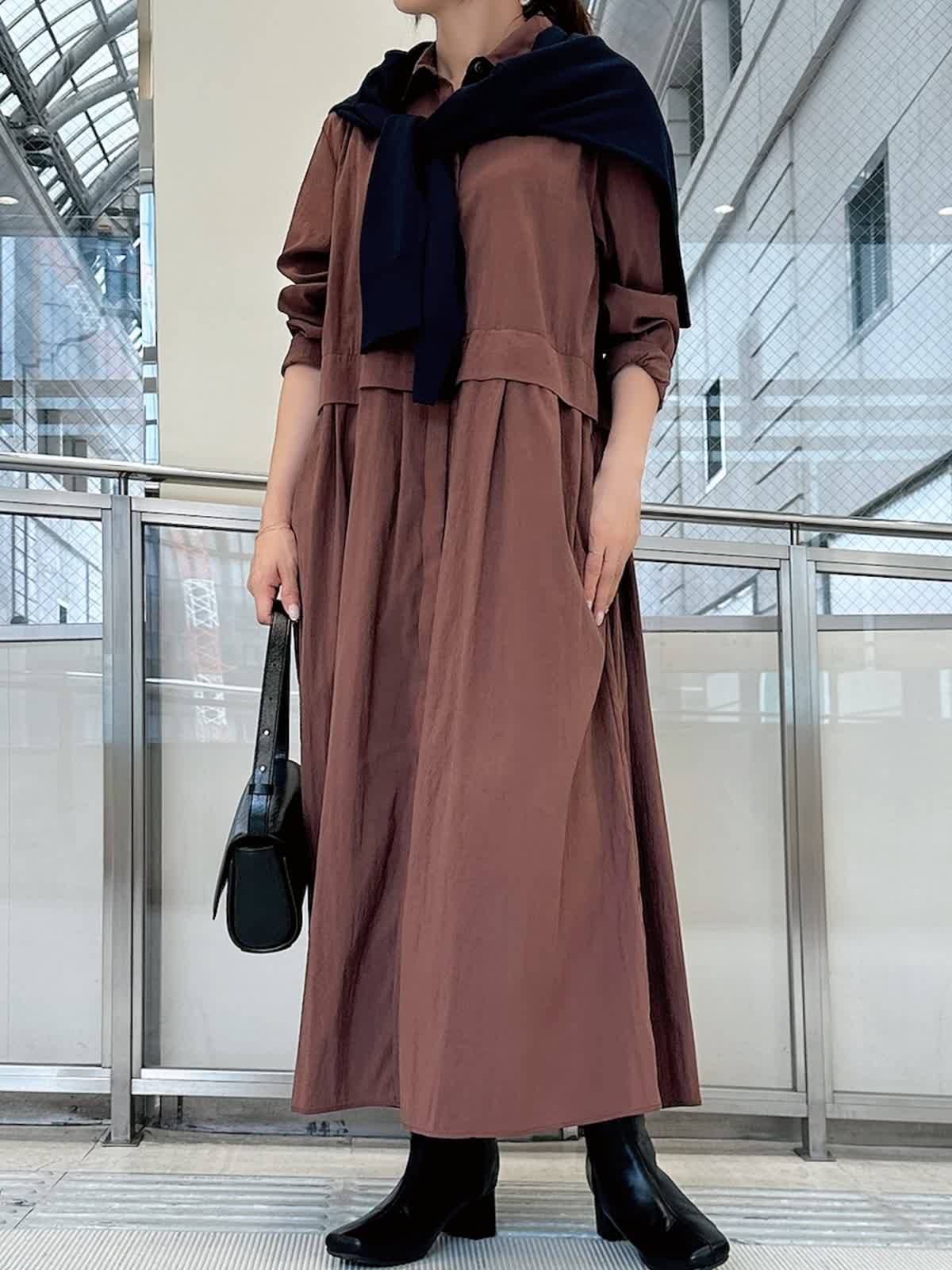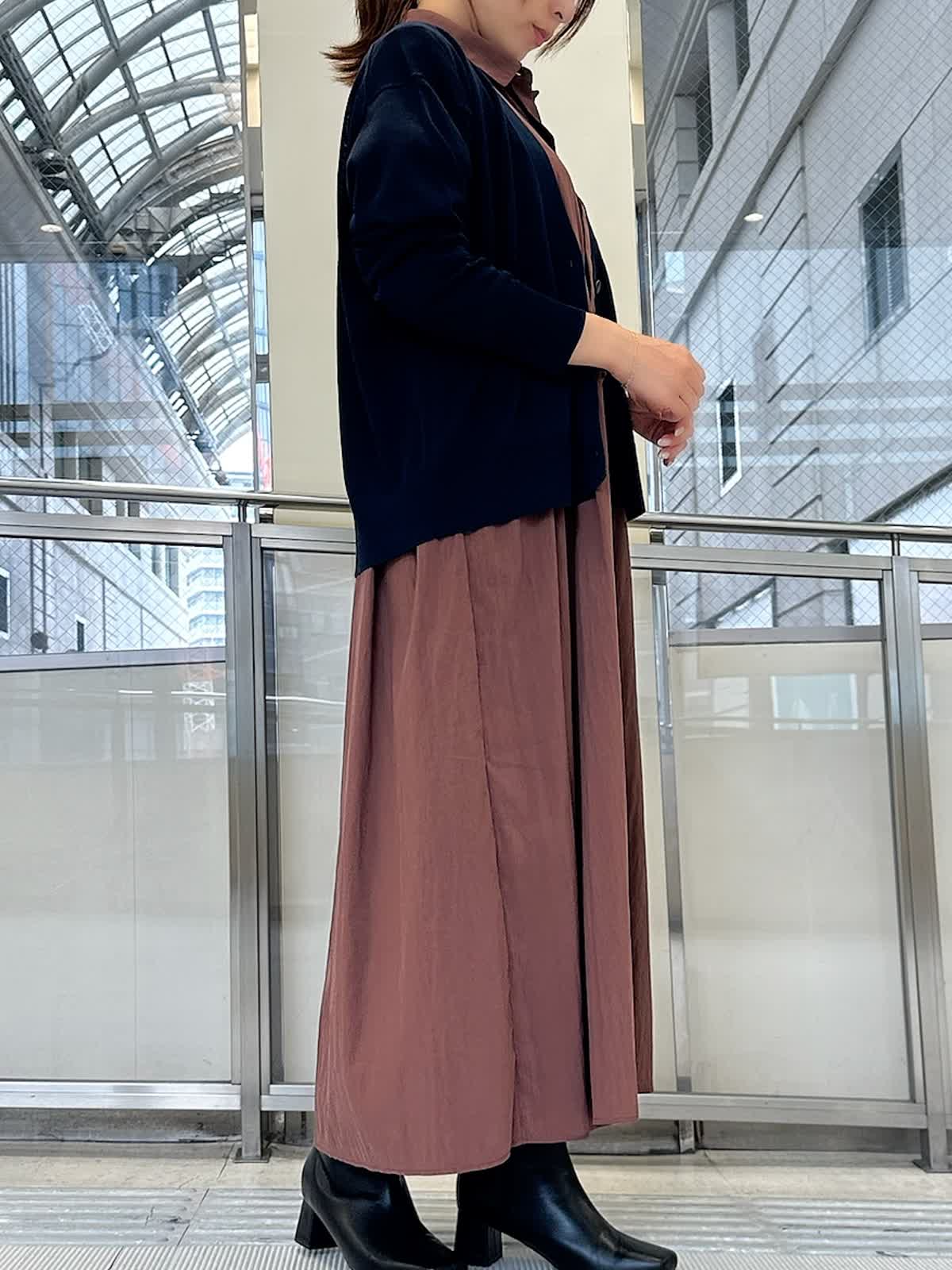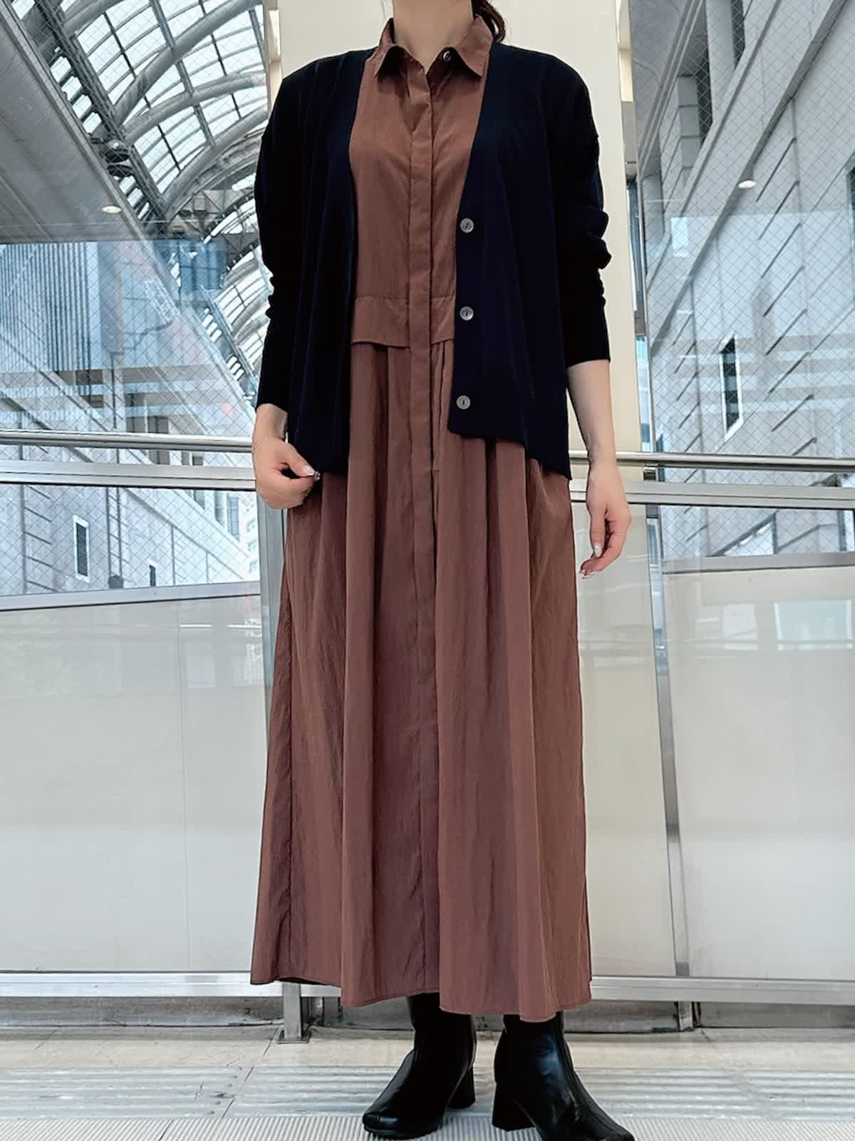 【着用サイズ/カラー】 ワンピース:フリー/ カーディガン:フリー/ネイビー 時短で着回し力と映えを同時に叶えてくれるワンピースは体のラインを拾わずすとんと落ちるシルエットで、ポケットがついている、シワになりにくい、手洗いができるなど実用性も◎ 一枚で着るのはもちろん、薄手のタートルネックやパンツを重ねて着るのもおすすめです。