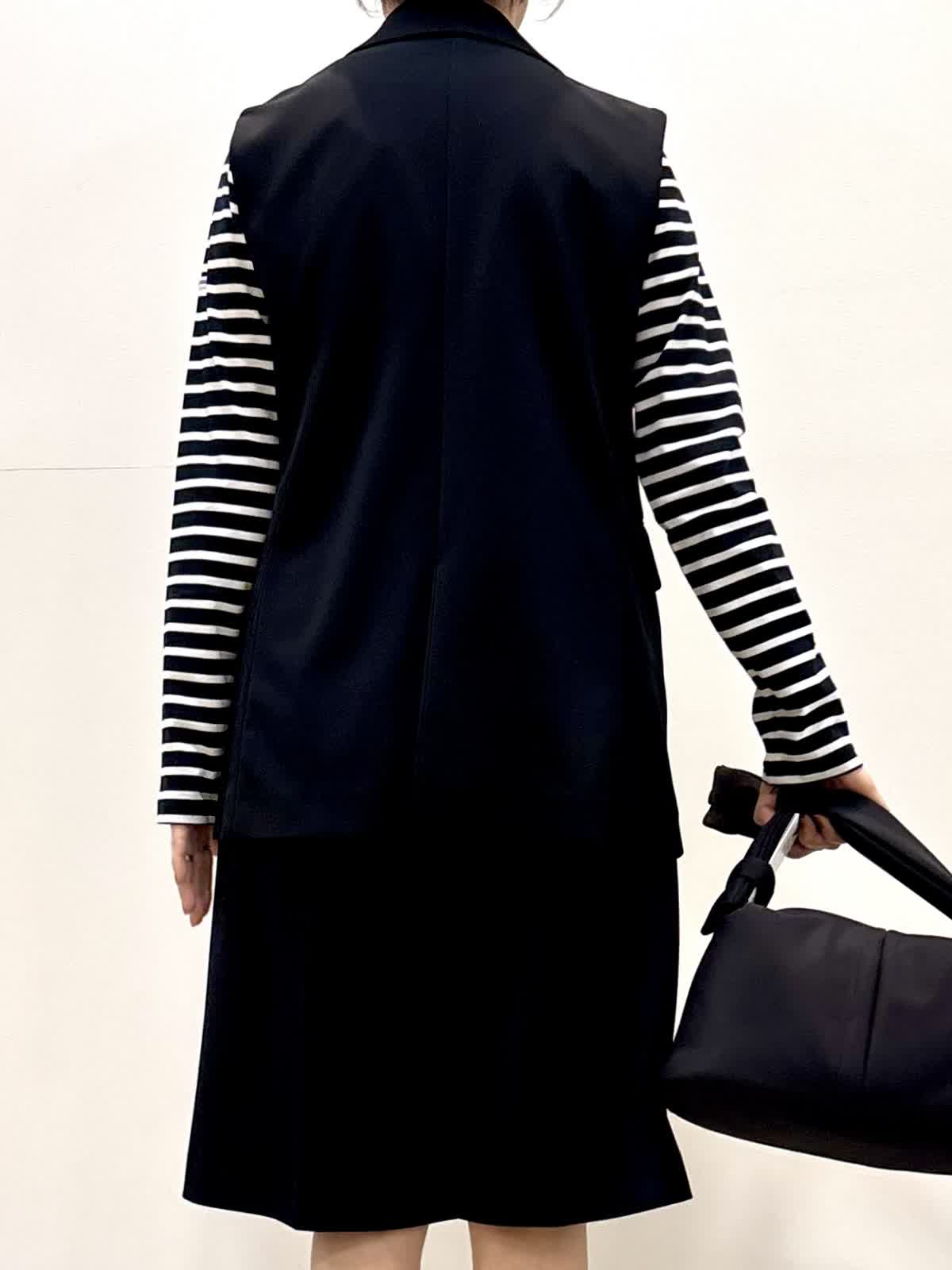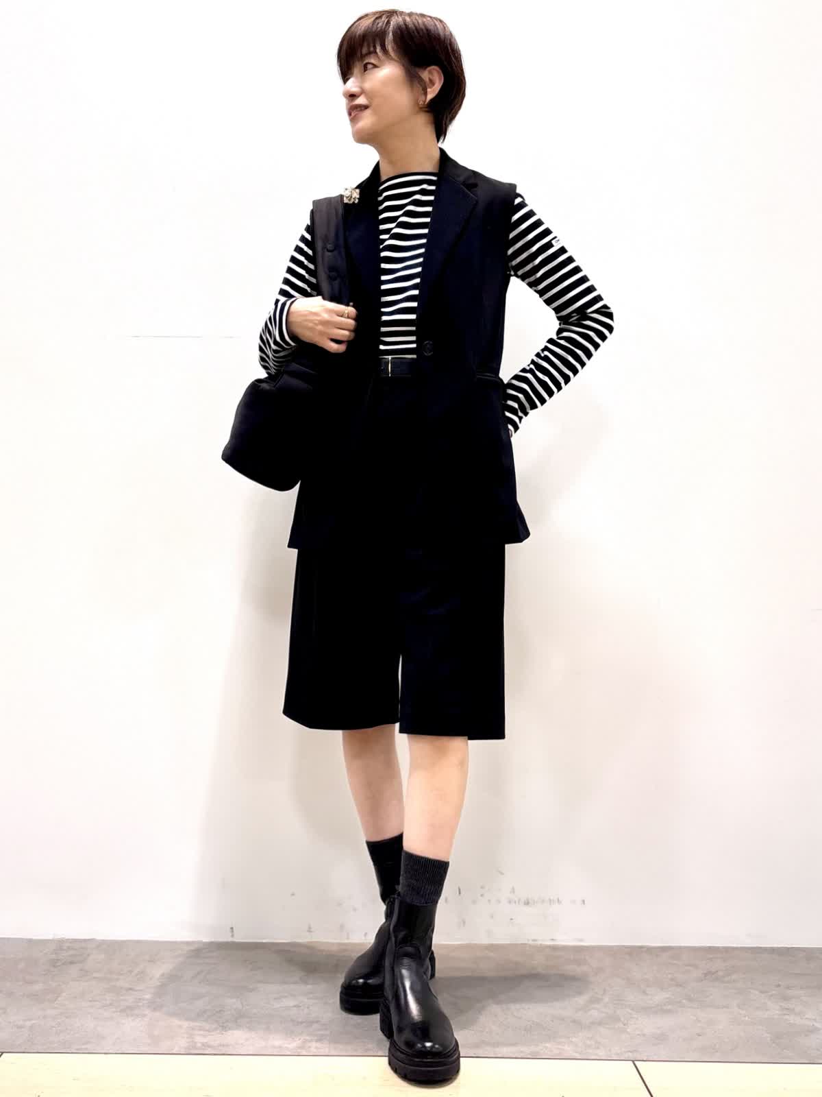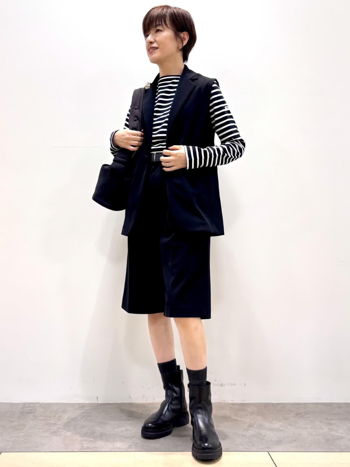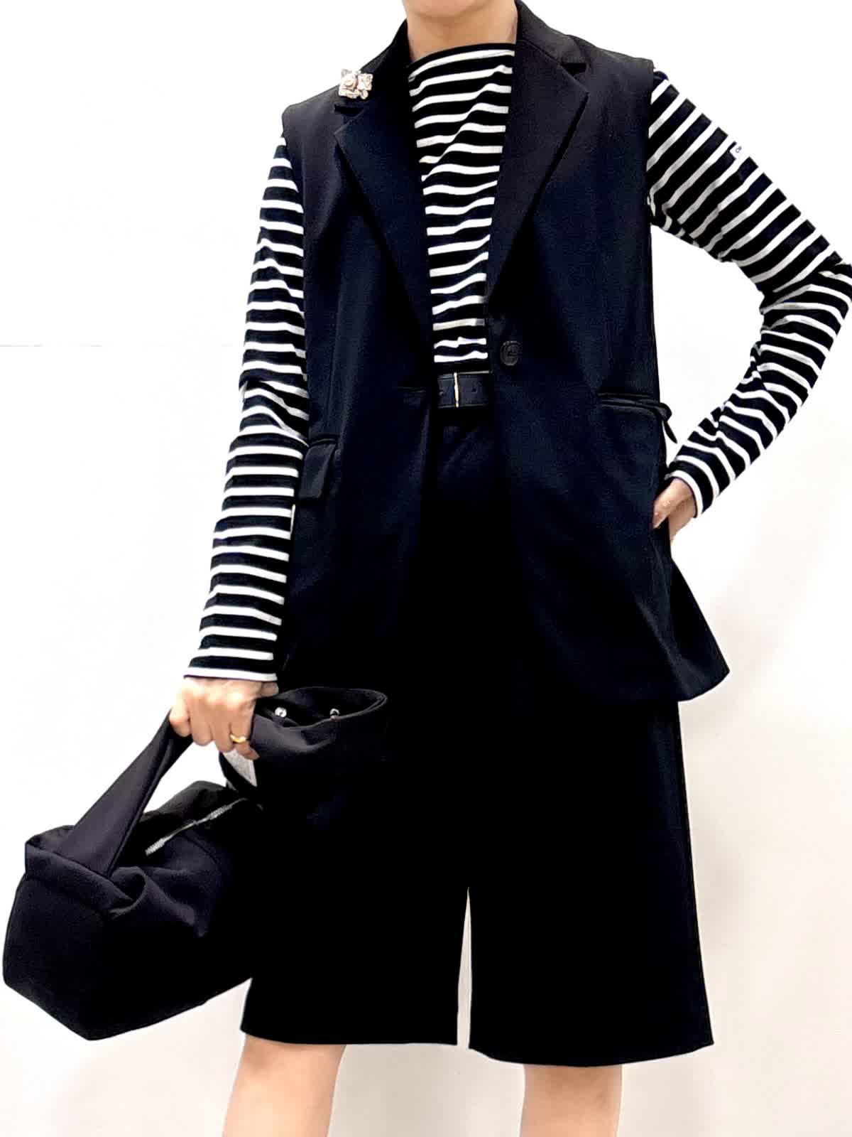 [着用サイズ]ジレ:9号 カットソー:9号 パンツ:9号 [着用カラー]ジレ:ブラック カットソー:ブラック パンツ:ブラック 季節の変わり目に重宝するジレはインナーで雰囲気が変わります。 薄手のボーダーTシャツはスッキリとしたシルエットで柔らかくジレと合わせるとモードな雰囲気です。 大人ハーフパンツはセンタープレスと膝下の長さが大人の女性でも着やすいです。