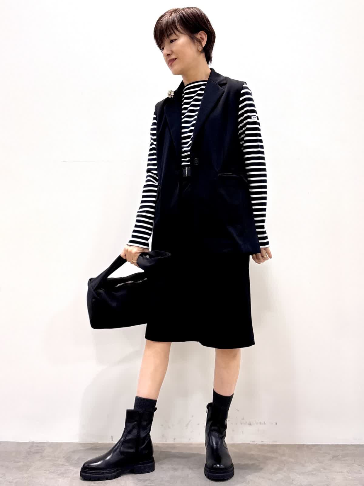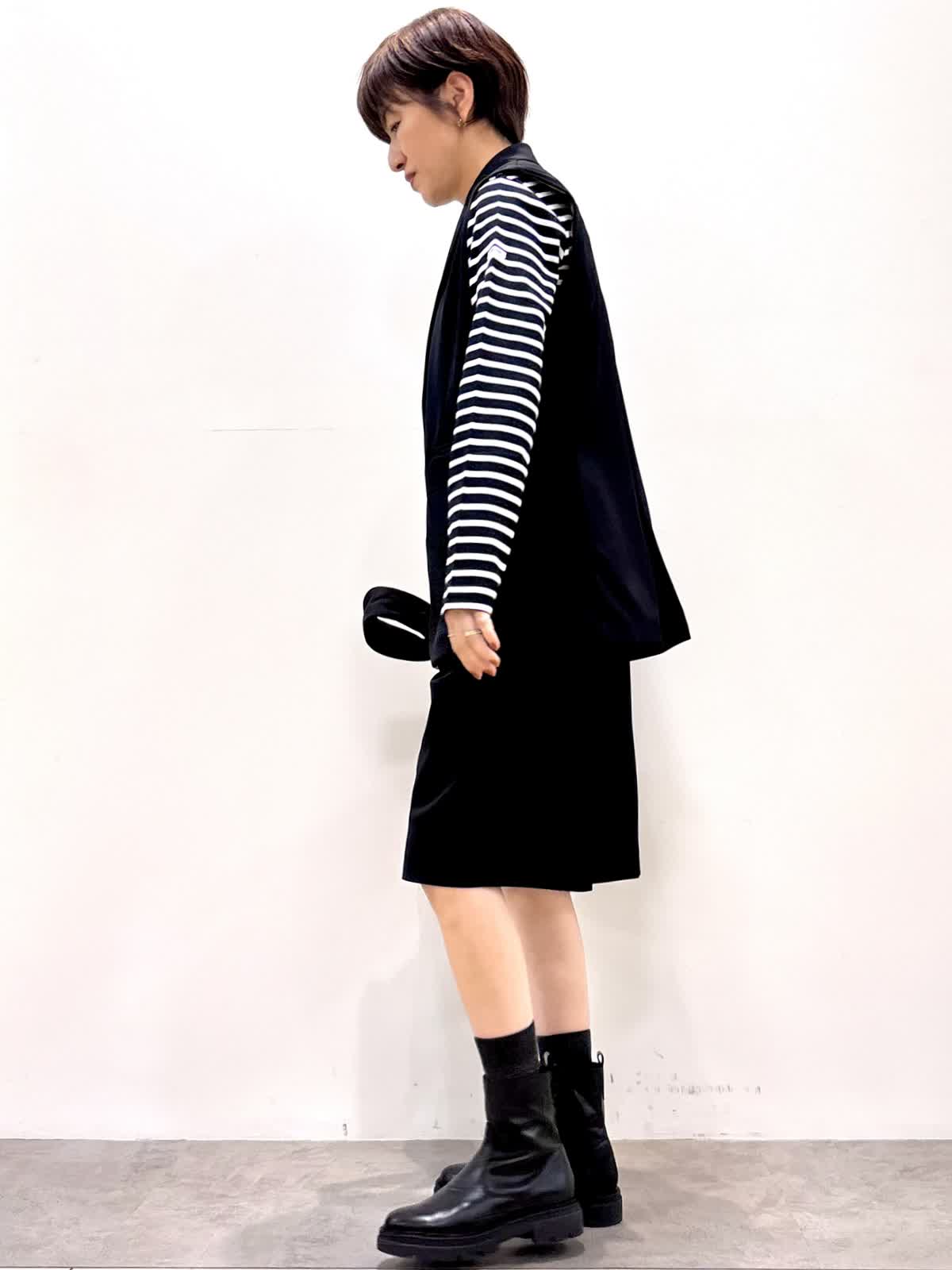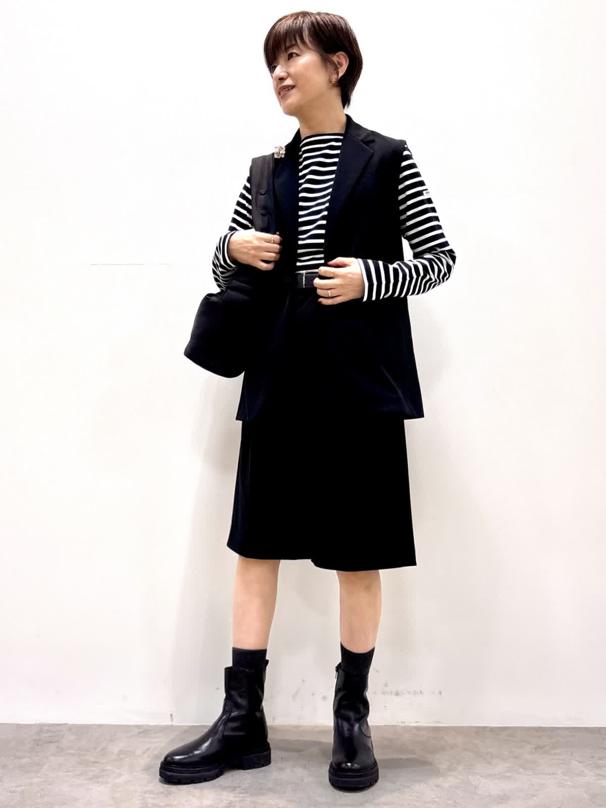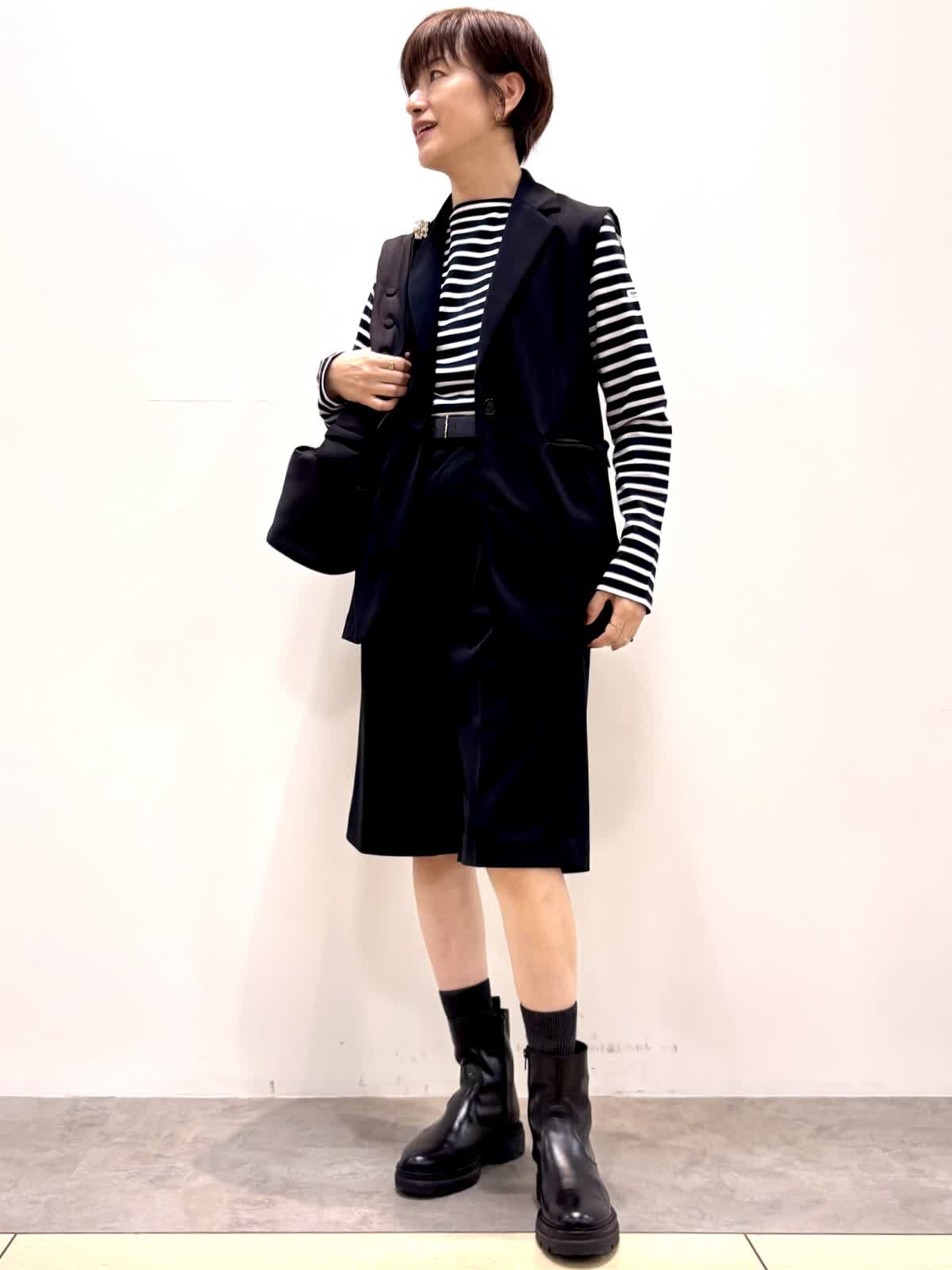 [着用サイズ]ジレ:9号 カットソー:9号 パンツ:9号 [着用カラー]ジレ:ブラック カットソー:ブラック パンツ:ブラック 季節の変わり目に重宝するジレはインナーで雰囲気が変わります。 薄手のボーダーTシャツはスッキリとしたシルエットで柔らかくジレと合わせるとモードな雰囲気です。 大人ハーフパンツはセンタープレスと膝下の長さが大人の女性でも着やすいです。
