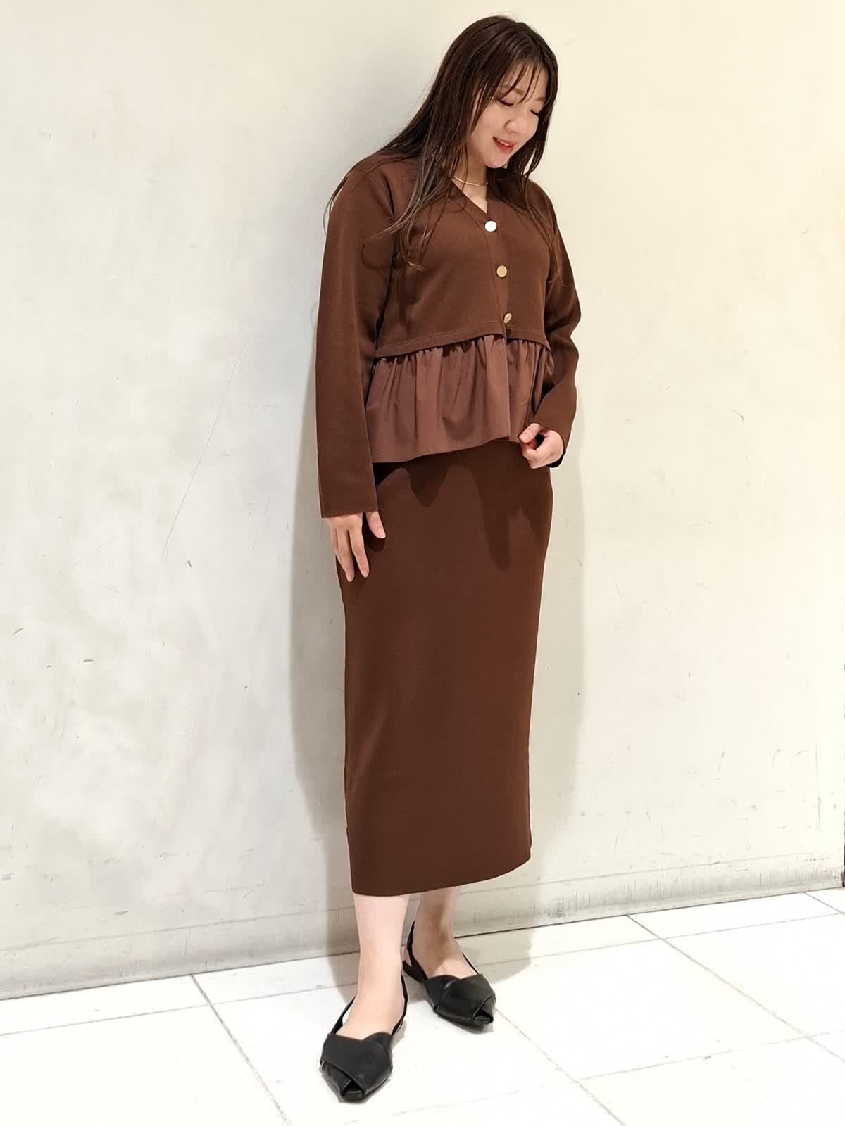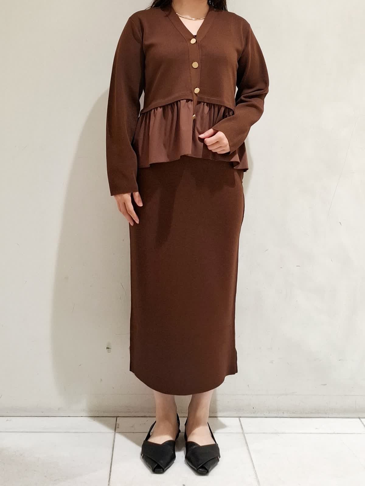 【着用サイズ】カーディガン:フリーサイズ ブラウン スカート:フリーサイズ ブラウン すそが異素材のフリルになったカーディガン。ウエストから少し広がりのあるシルエットが女性らしく、着映えします。同素材のスカートと合わせてワンピース風にも、それぞれ単品としても使いやすいです。ウエストがゴム仕様のため、楽ちんです。