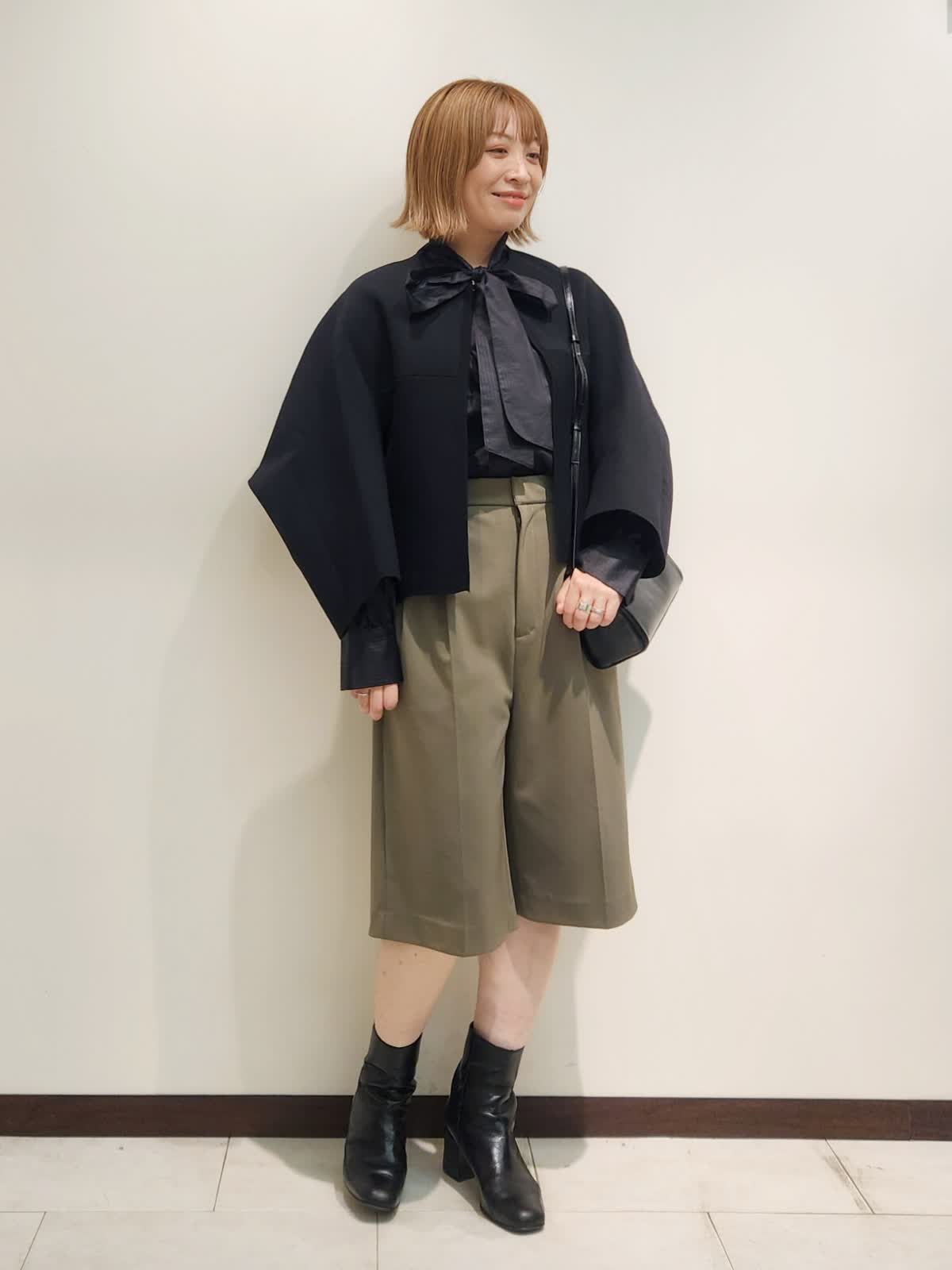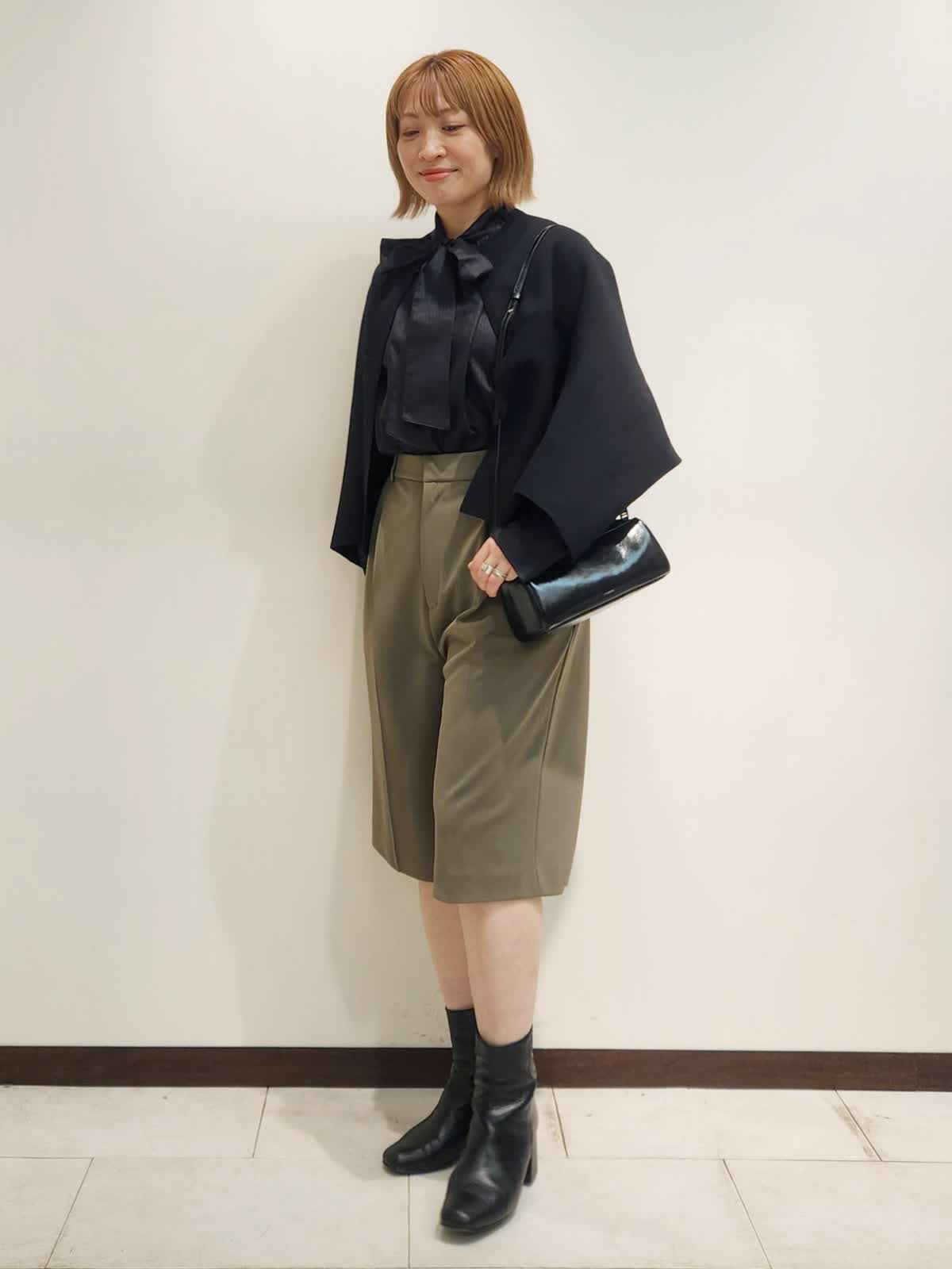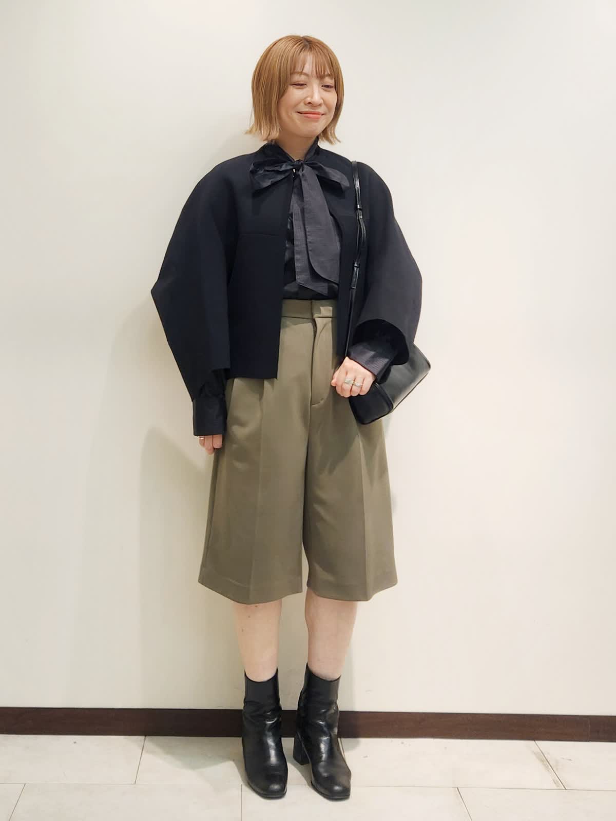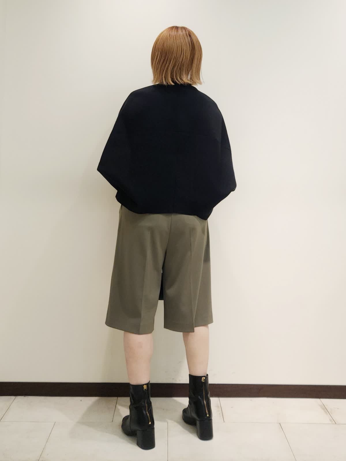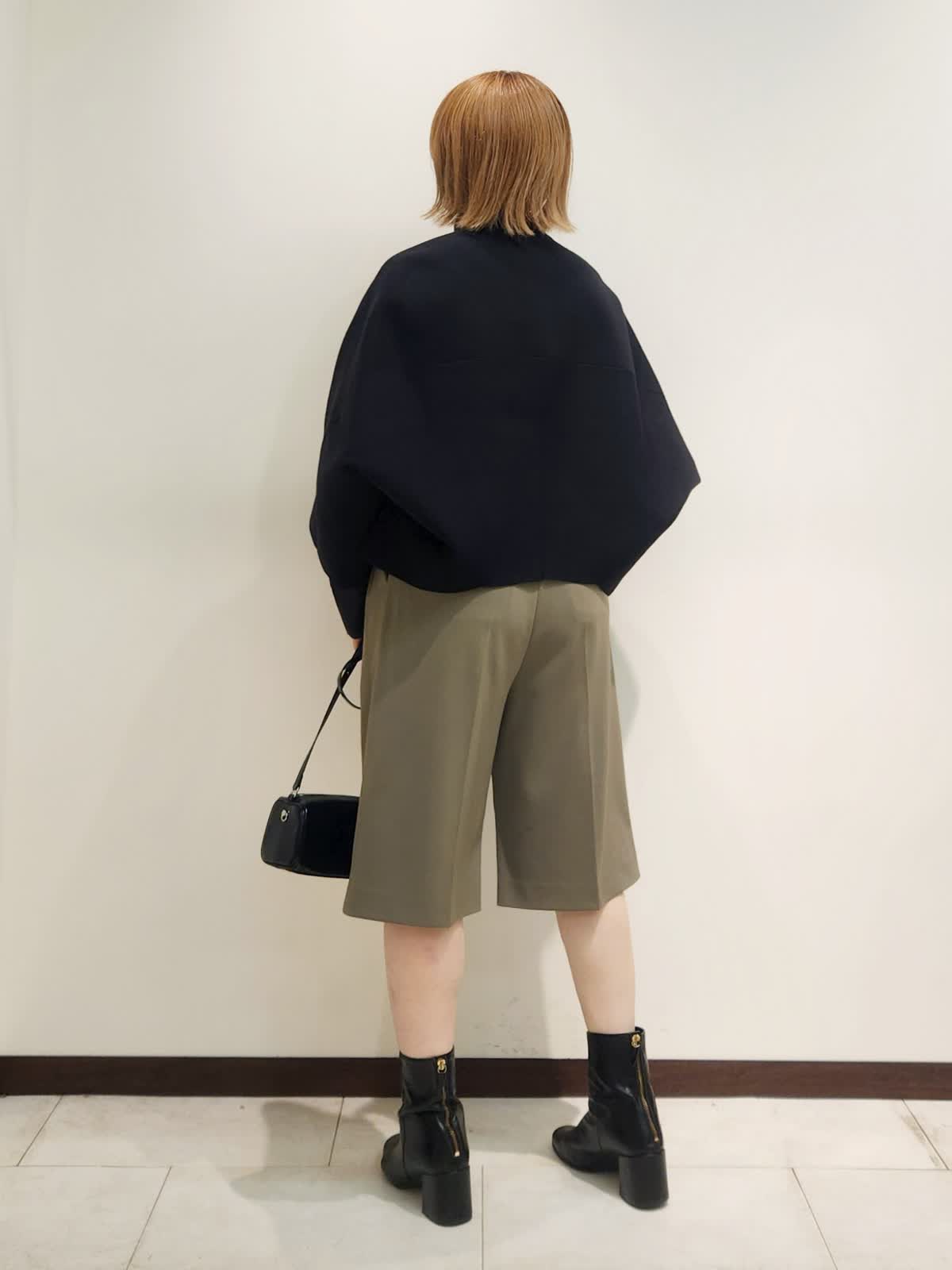 【着用サイズ】全て9号 【着用カラー】ブラウス:ブラック カーディガン:ブラック パンツ:カーキ 大人だから履きたい!!ハーフパンツコーディネート。変化が欲しいパンツLOOKはハーフパンツで決まりです。大人が履くならトップスはブラウスでレディ感をプラスして。羽織にはフォルムが差をつけるミラノリブカーディガンを合わせて。ブーツで季節の変わりめを楽しみましょう!!