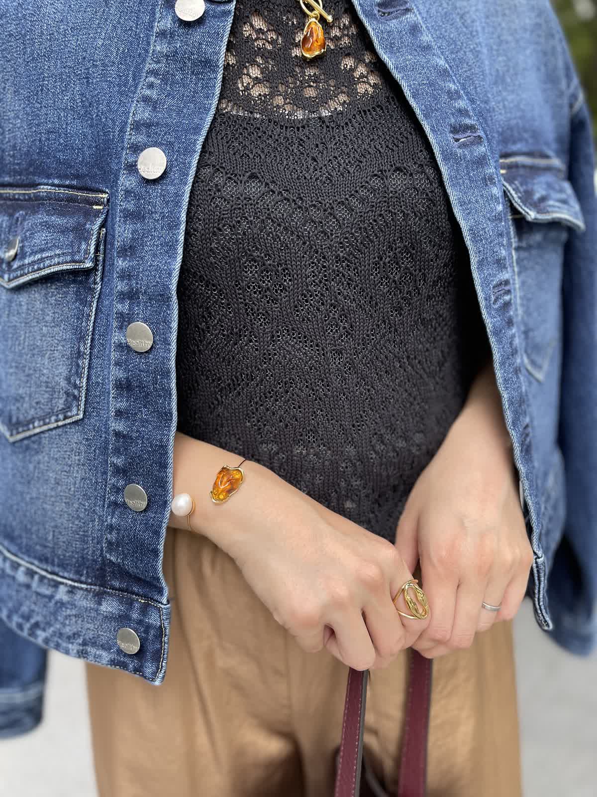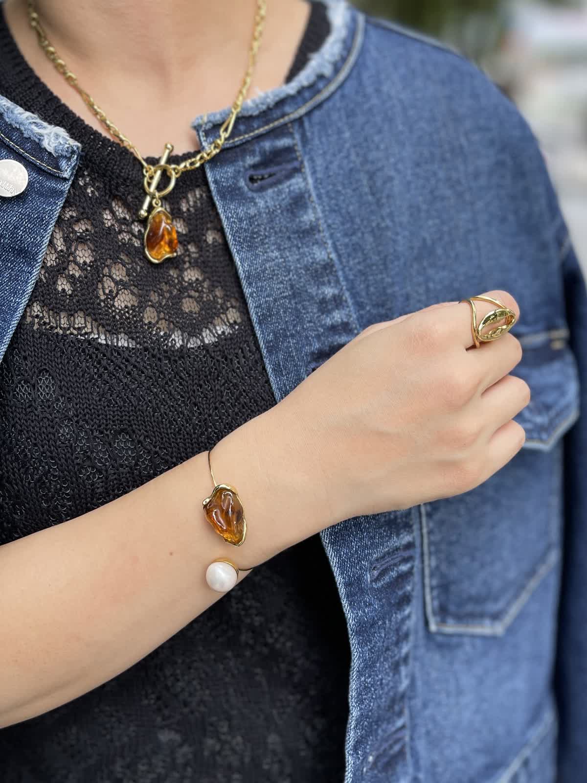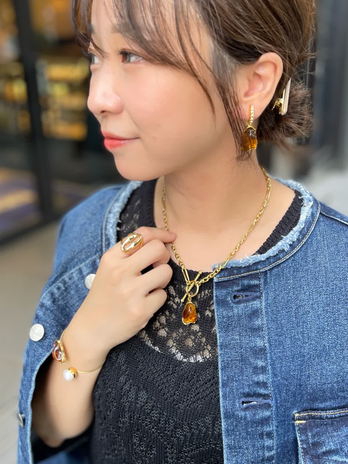 イヤリング?バングル:ゴールド 琥珀のような透け感とブラウンカラーが今年っぽいアイテム。 ブラウンが今の気分!