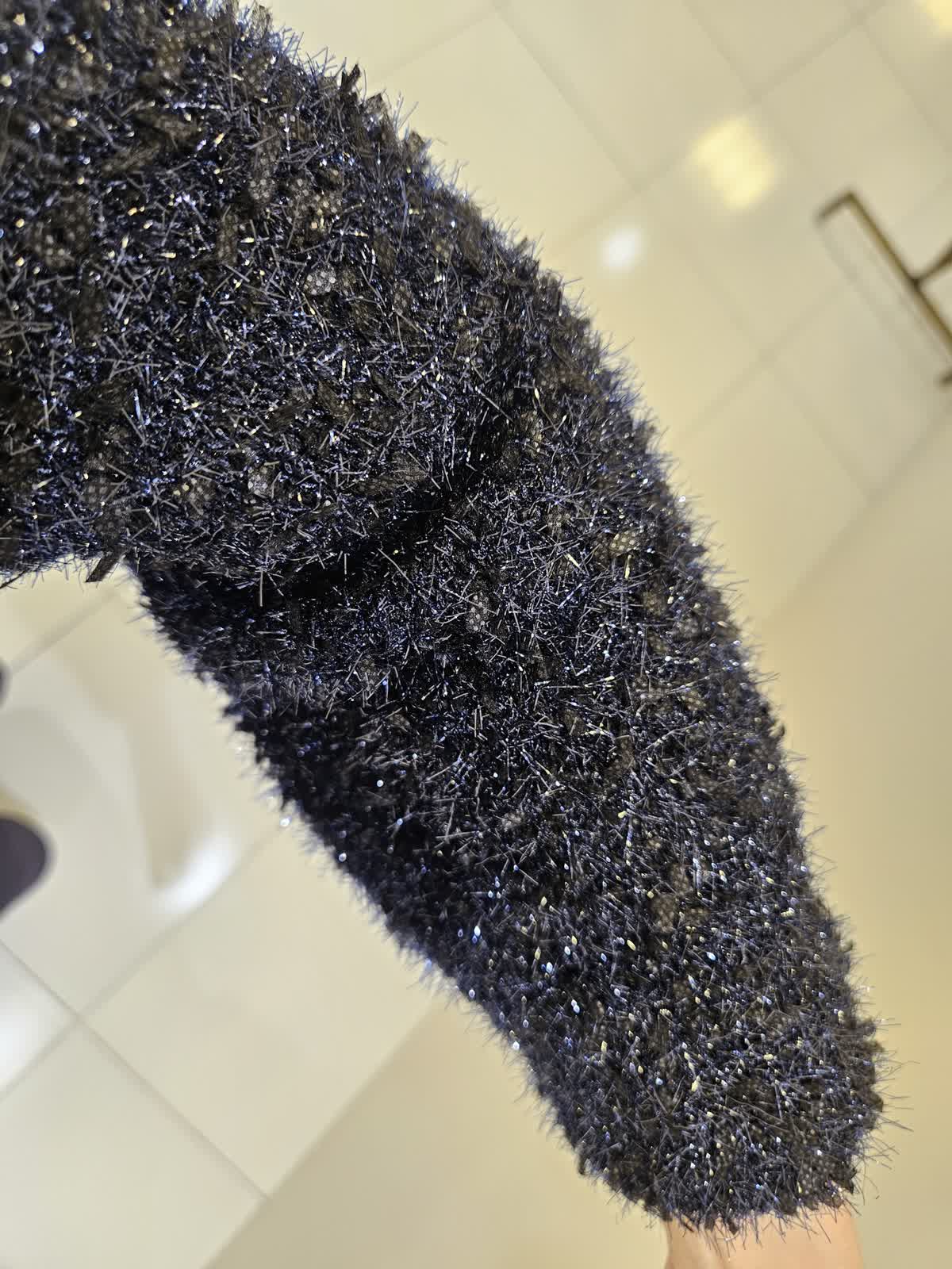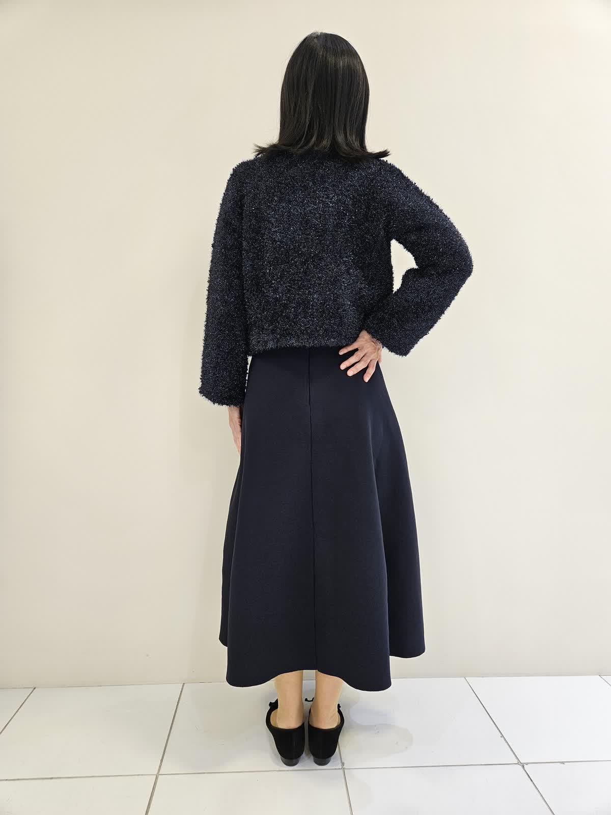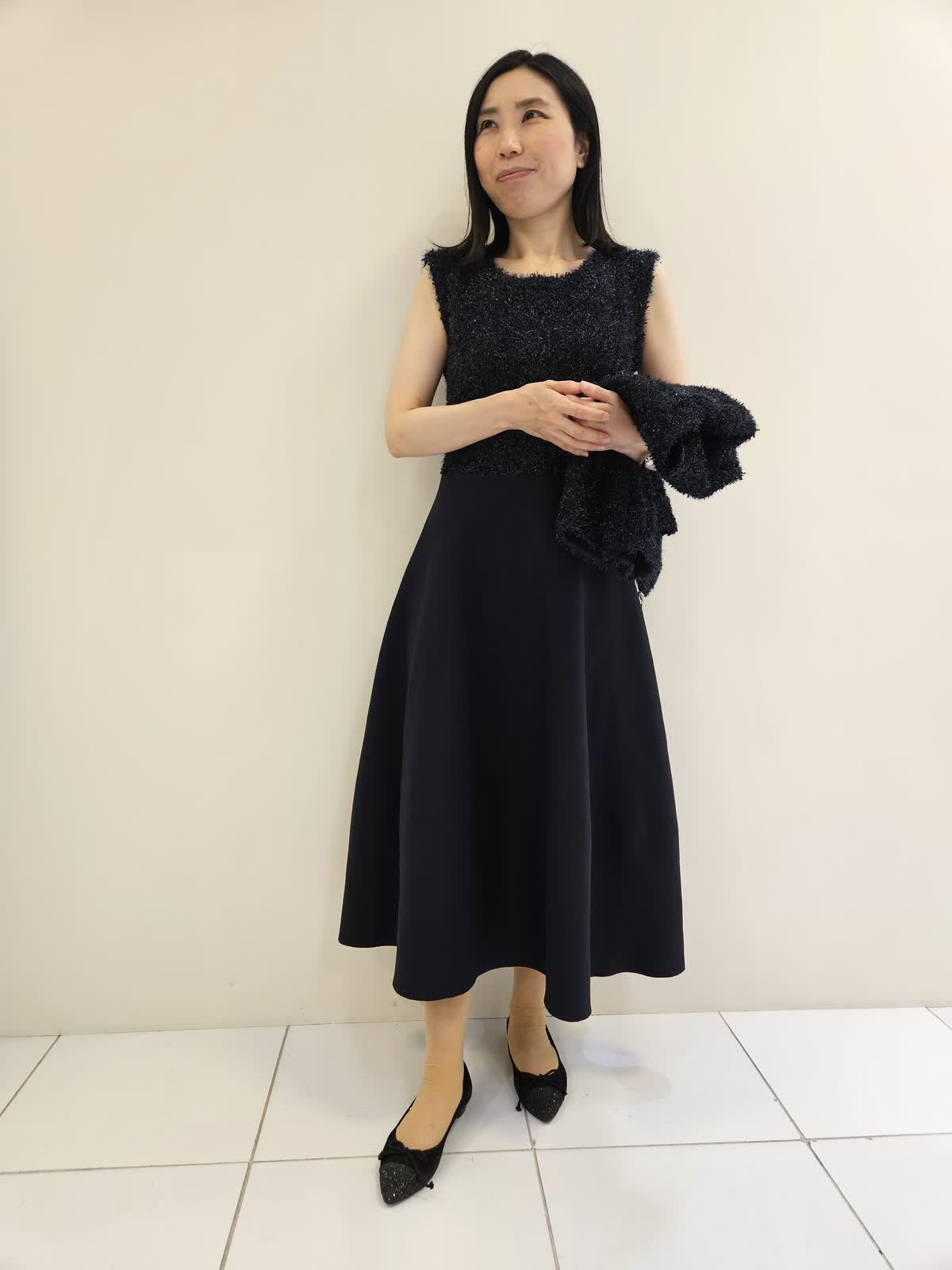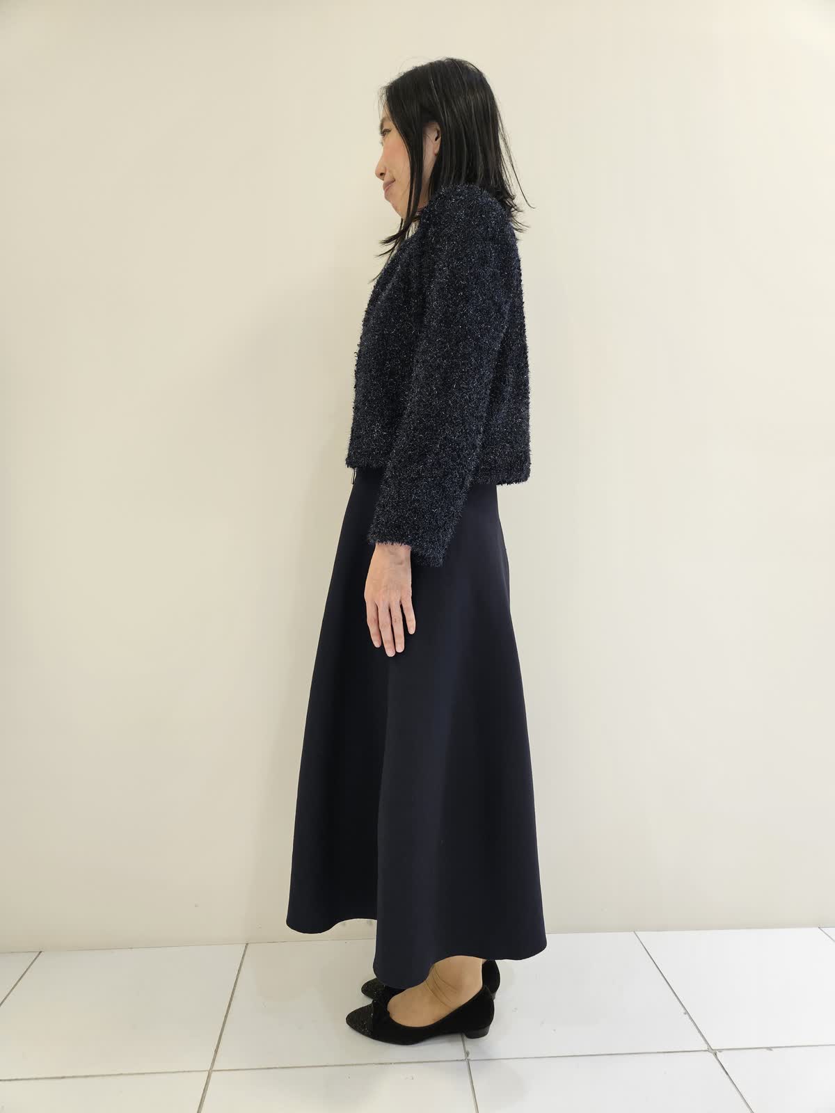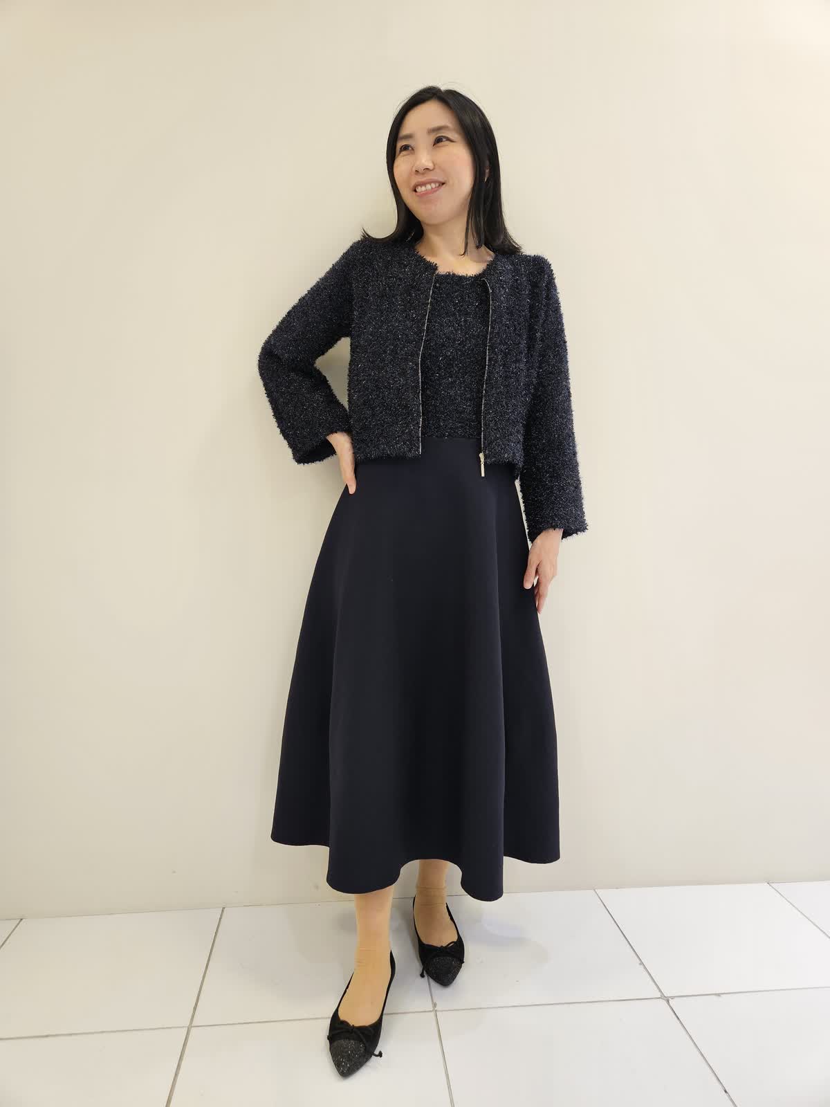 【着用サイズ・カラー】カーディガン:ネイビー9号・ワンピース:ネイビー9号 キラキラリメがポイントのセットアップはワンピースはノースリーブでスカート部分はラメがなく張りがあり動きやすく、ジャケット合わせも◎ カーディガンはジップがゴールドで開けても閉じてもバランスよく着ていただけます。