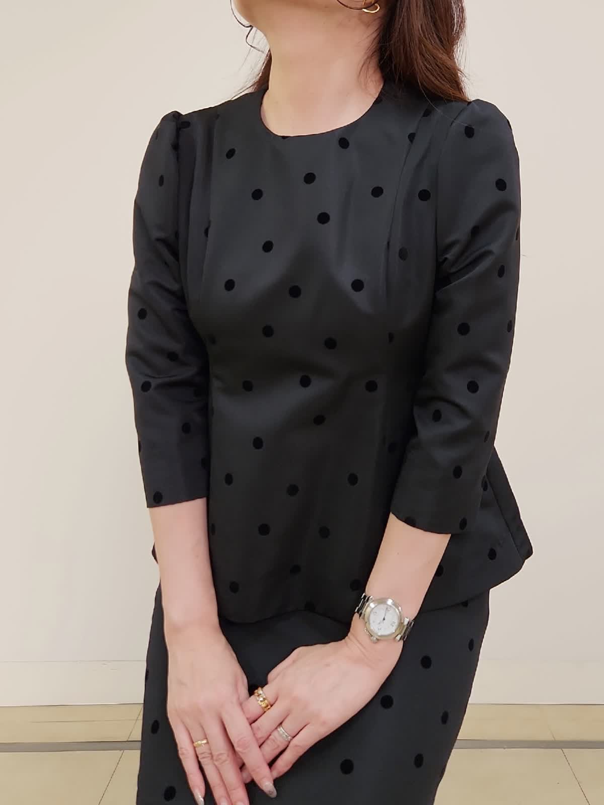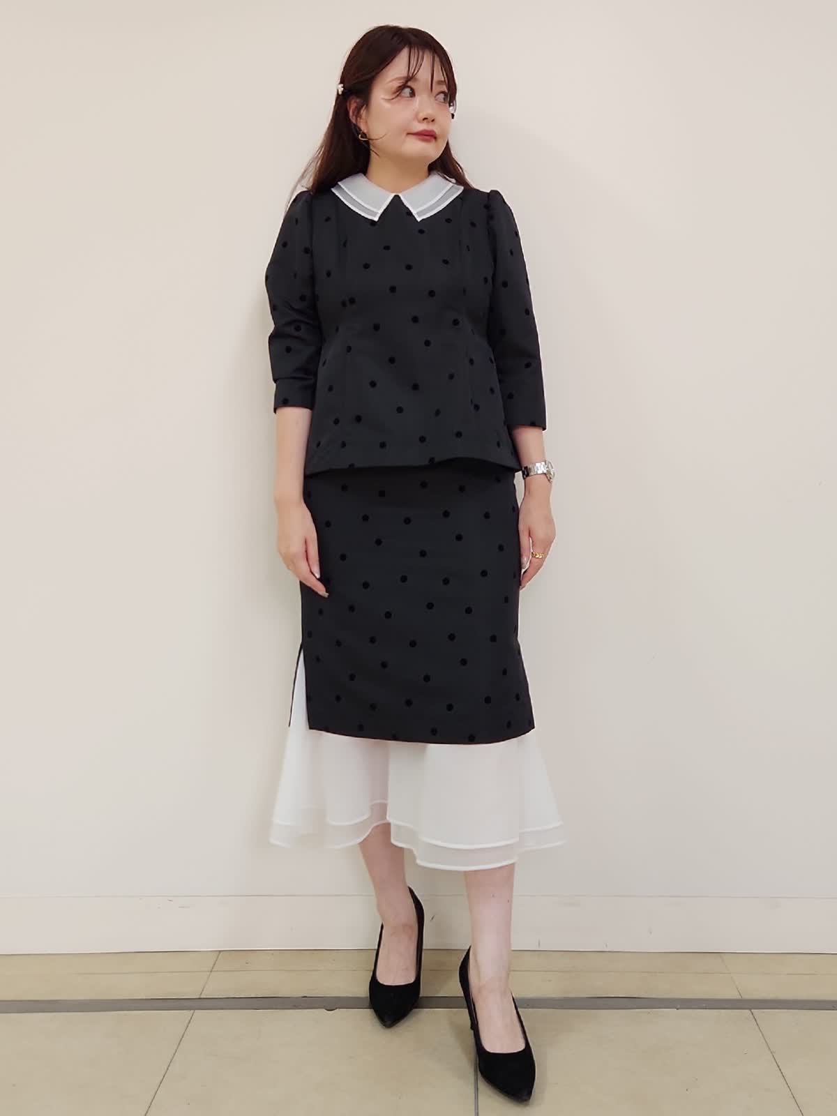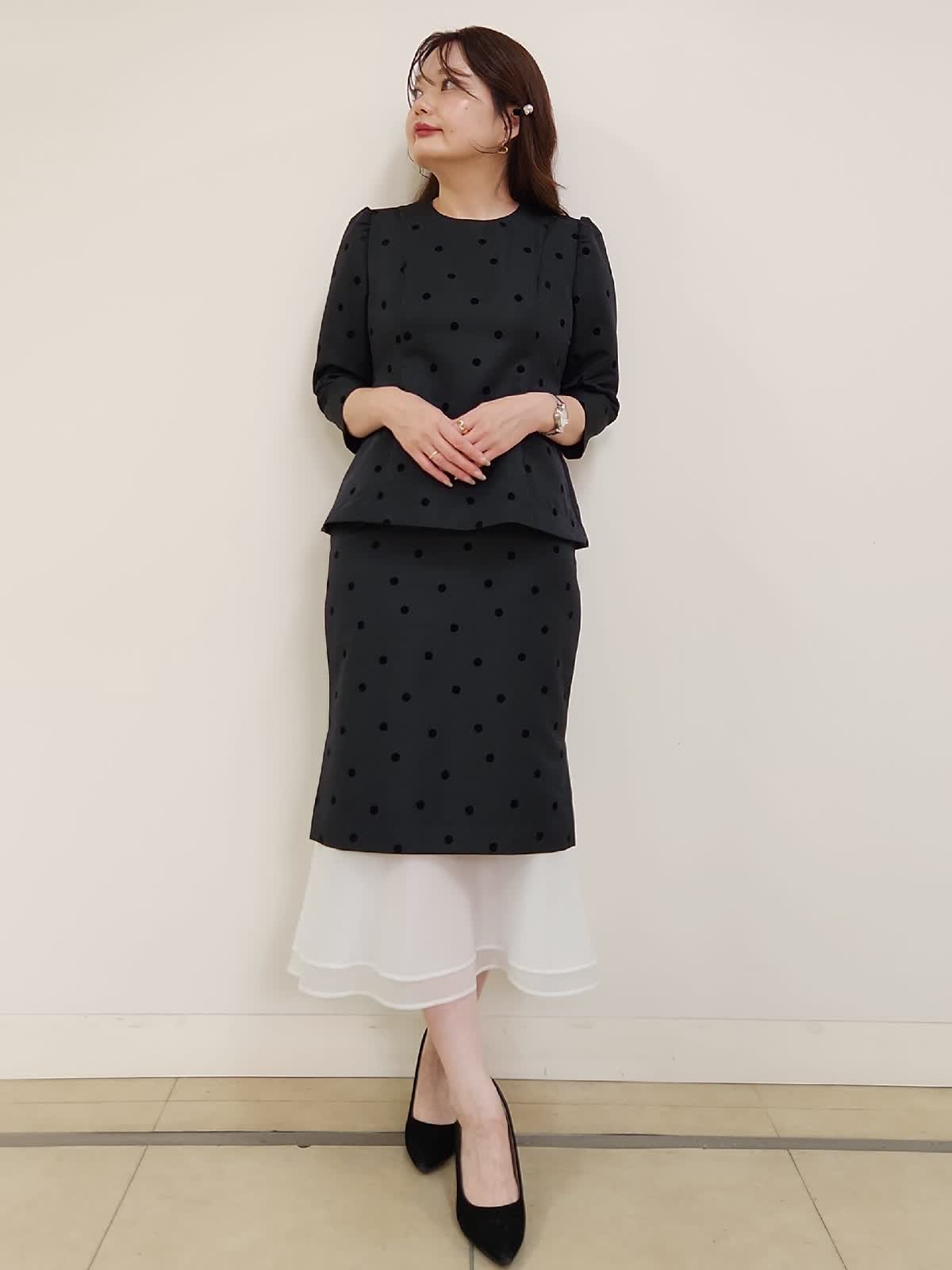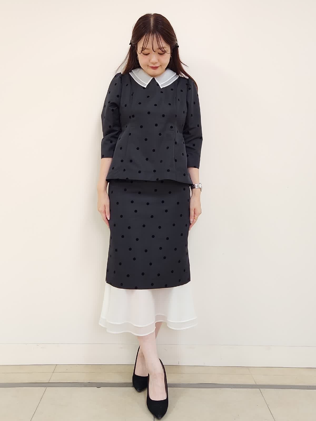 【着用サイズ】ブラウス:9号/ブラック スカート:9号/ブラック 結婚式、お食事会、七五三など様々な行事に着まわせるセットアップ。ドットフロッキーの生地が上品で大人可愛いです。上下共にタイトなお作りで、伸縮性がない生地なので通常サイズより1サイズ大きめがおすすめ。写真では9号着用しておりますが購入の場合は11号を選びます。ブラウスの襟は取り外しができるのでフェミニンとモードとの2パターンで印象も変えられます。