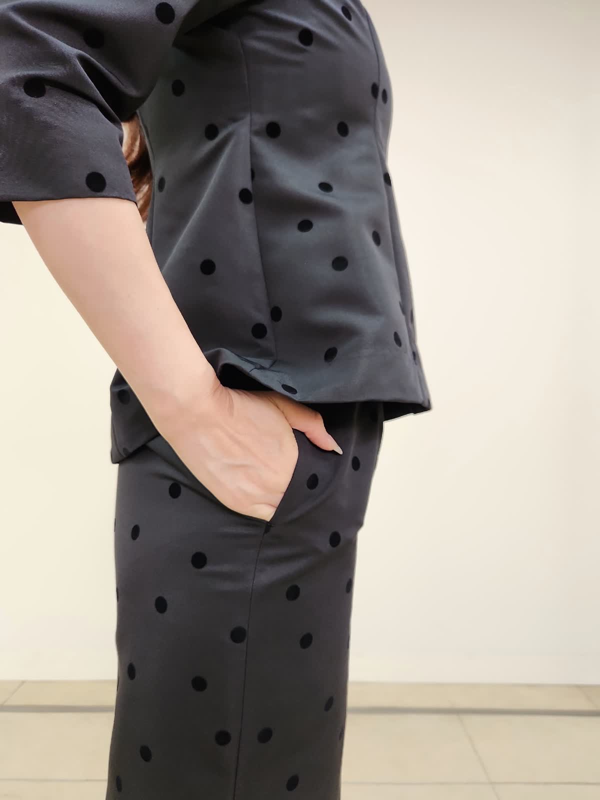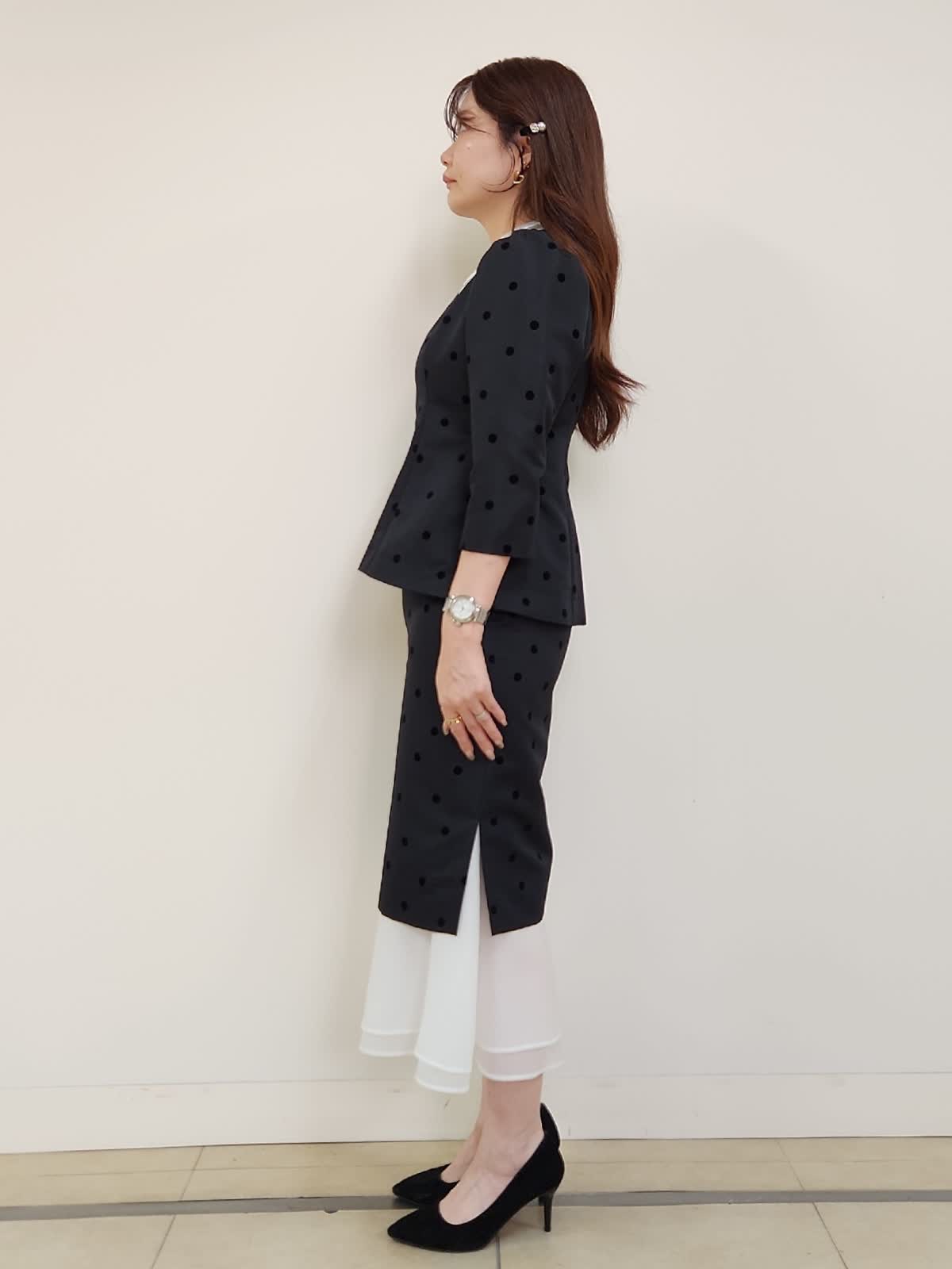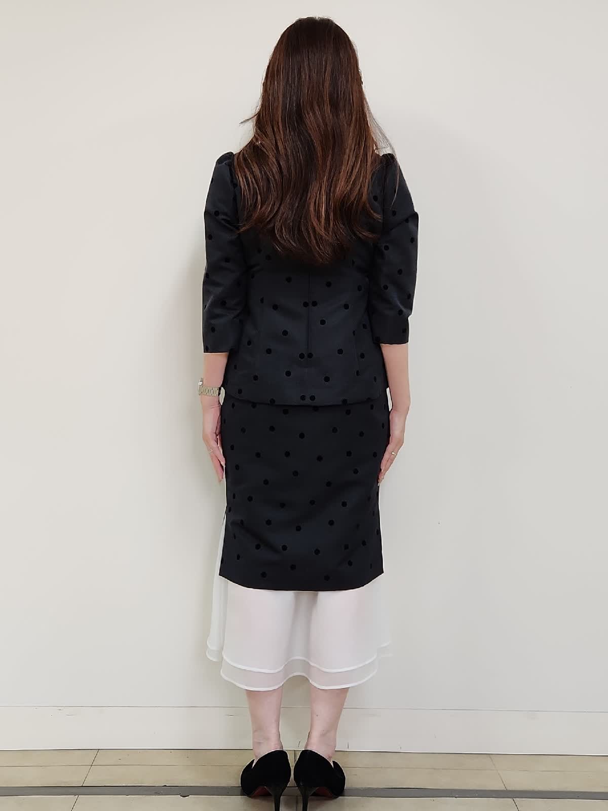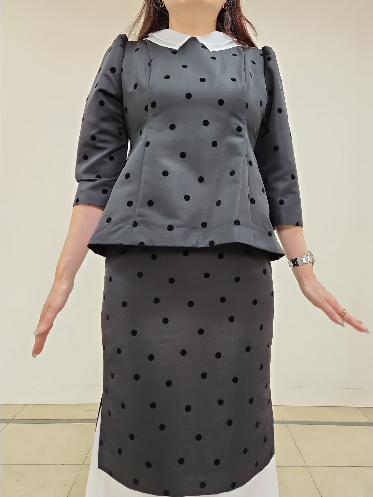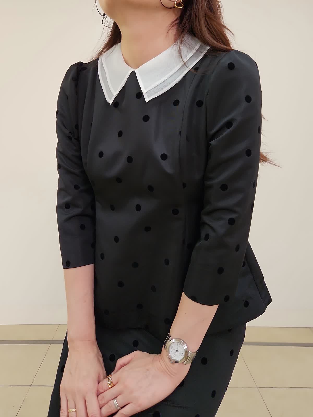 【着用サイズ】ブラウス:9号/ブラック スカート:9号/ブラック 結婚式、お食事会、七五三など様々な行事に着まわせるセットアップ。ドットフロッキーの生地が上品で大人可愛いです。上下共にタイトなお作りで、伸縮性がない生地なので通常サイズより1サイズ大きめがおすすめ。写真では9号着用しておりますが購入の場合は11号を選びます。ブラウスの襟は取り外しができるのでフェミニンとモードとの2パターンで印象も変えられます。