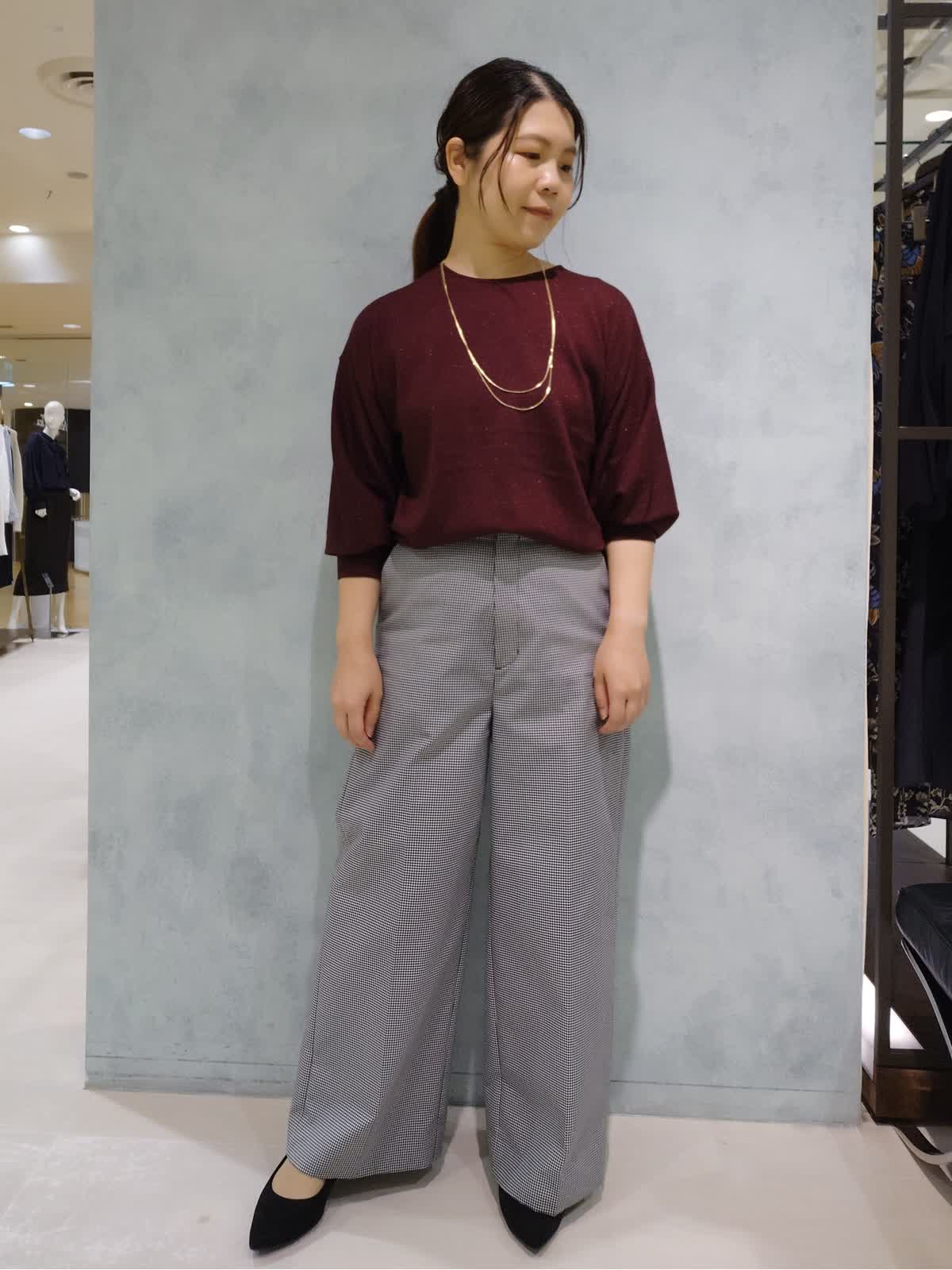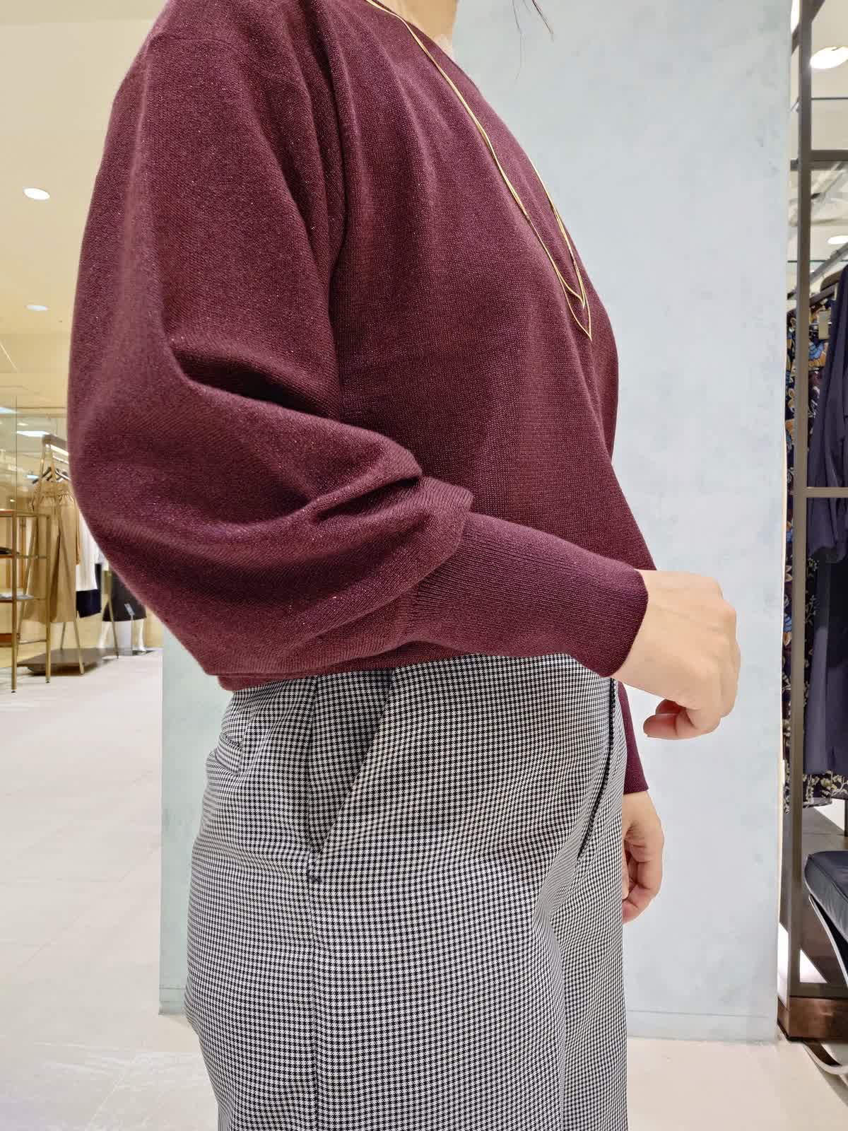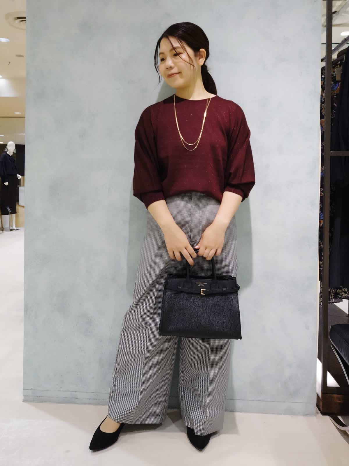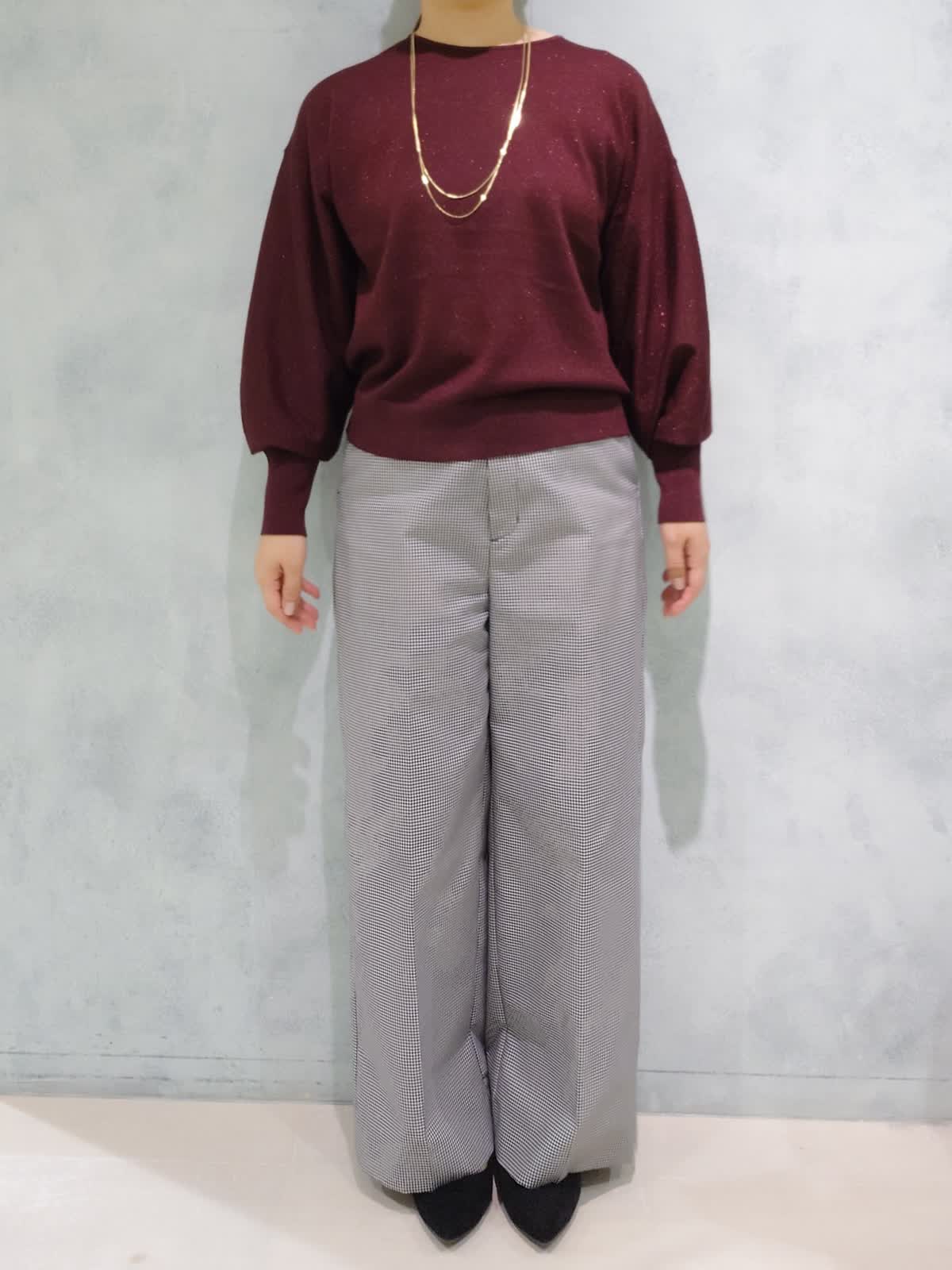 【着用サイズ】ニット:フリー パンツ:7号 【着用カラー】ニット:エンジ パンツ:グレンチェック 秋の通勤スタイル 上品なラメをミックスしたカラーで華やかさと落ち着きを両立した1枚で着映えるニット。肌触りが柔らかくラメのチクチク感がないので着心地も良いです。