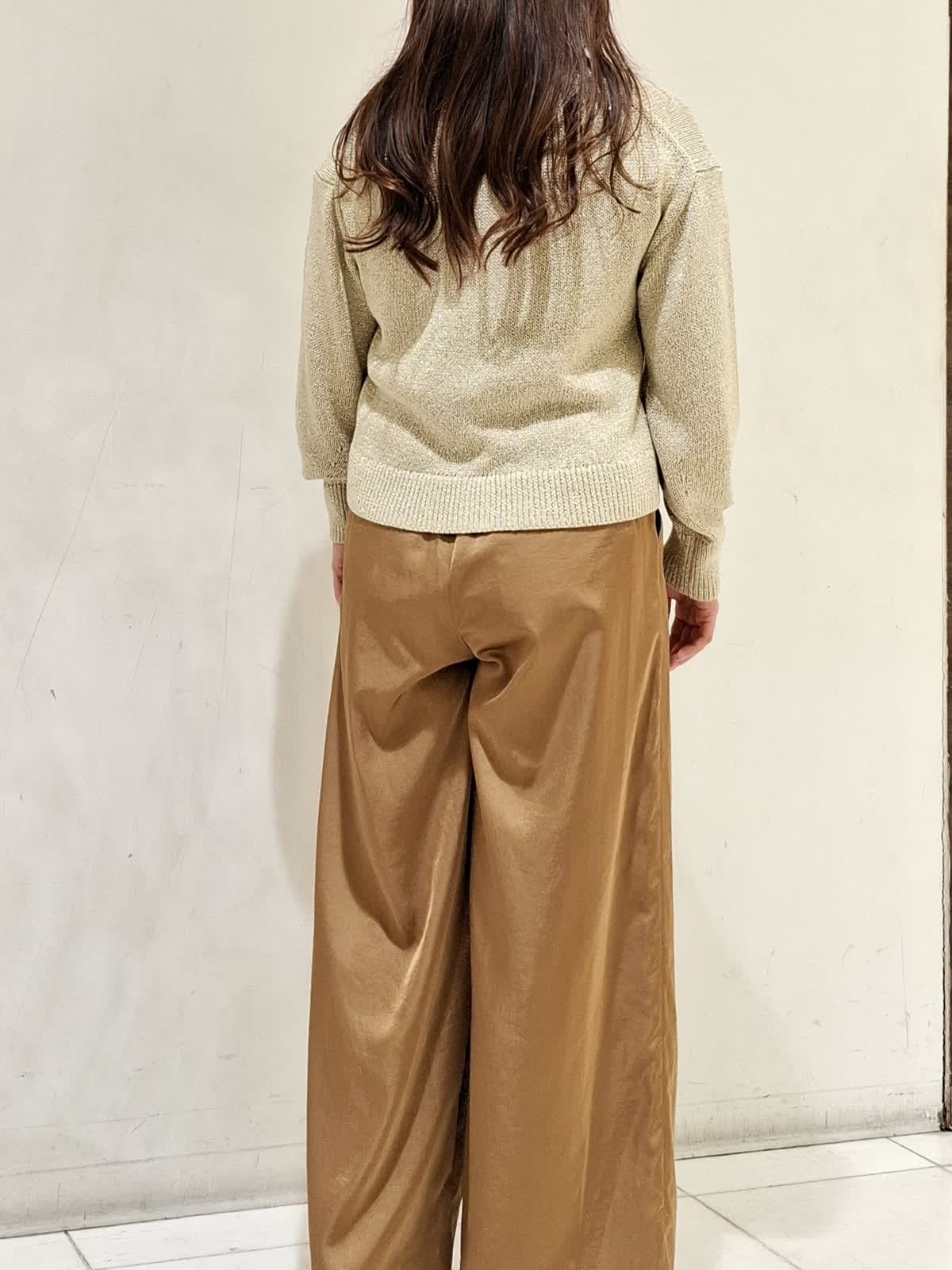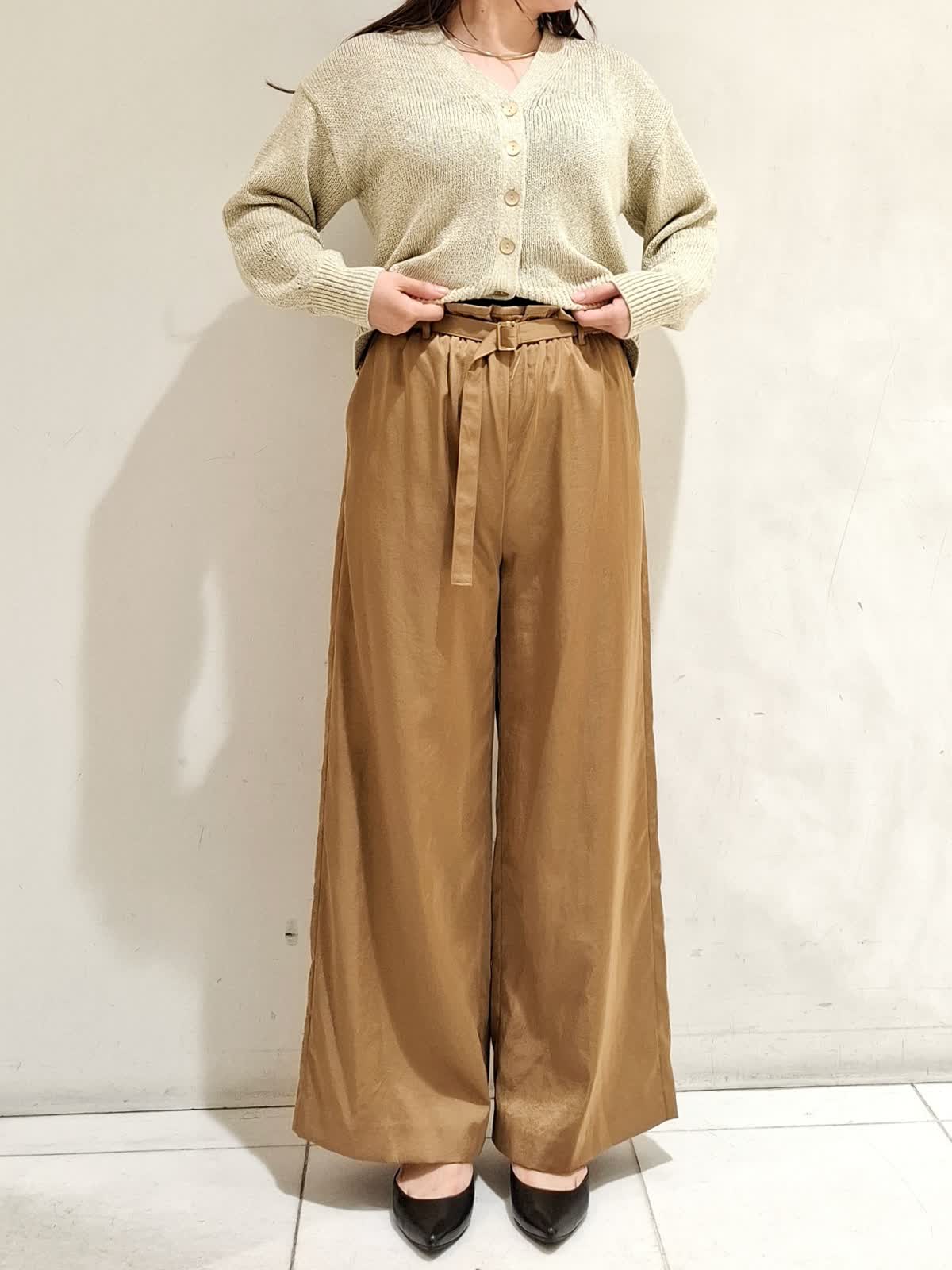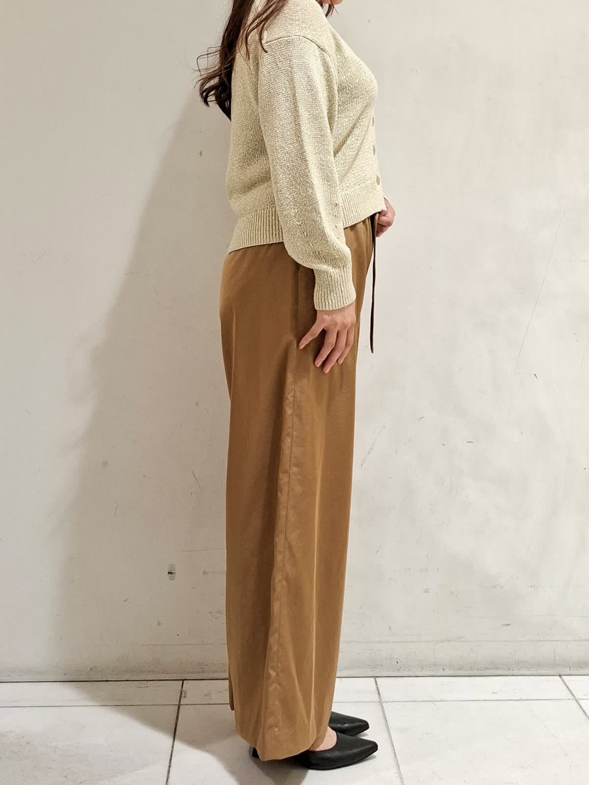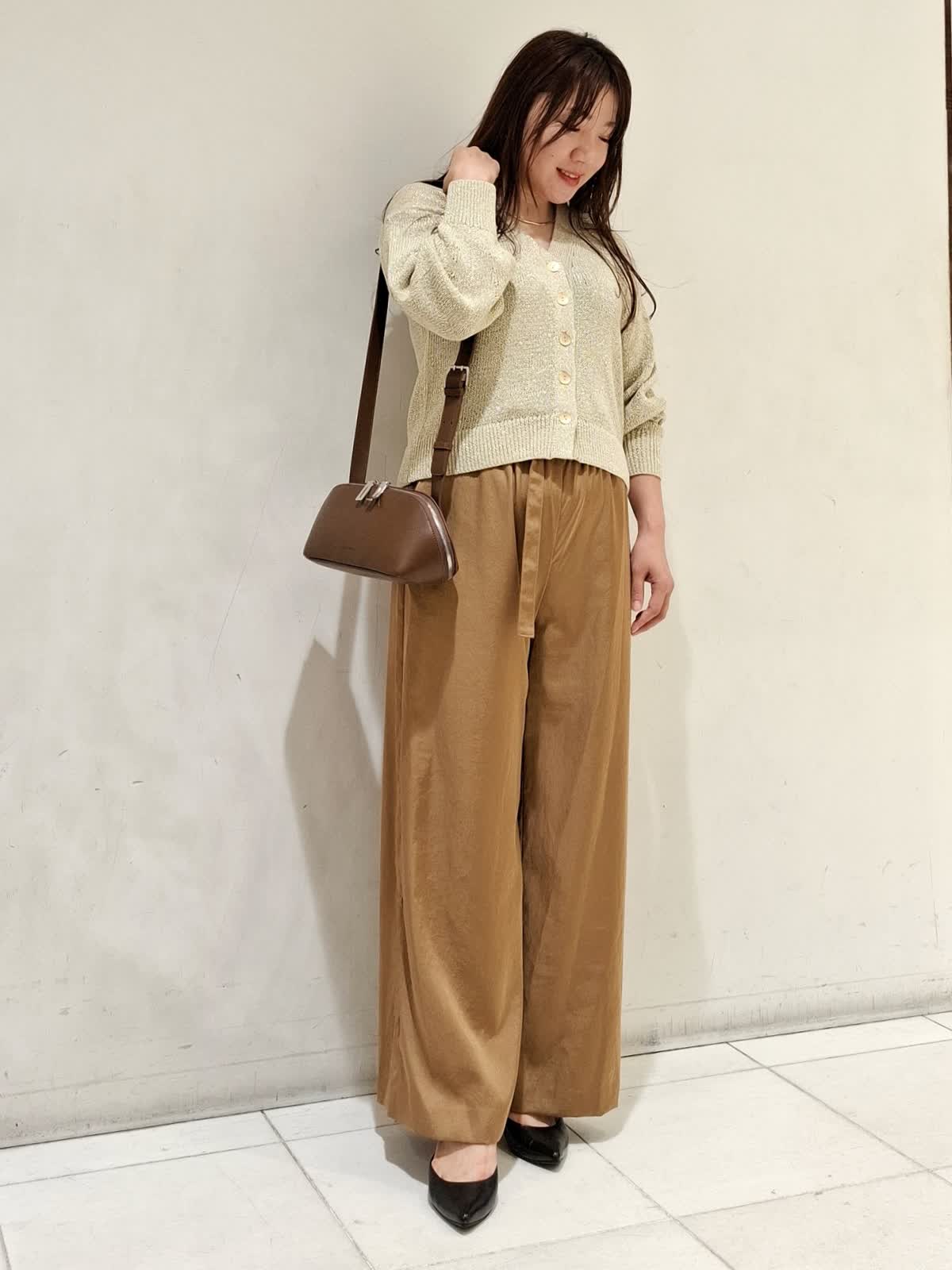 【着用サイズ】カーディガン:フリーサイズ アイボリー パンツ:9号サイズ モカチャ バック:フリーサイズ ブラウン ざっくりとした編み地のラメ入りカーディガン。ほどよくゆったりとしたシルエットとメタルボタンで、羽織るだけで華やかな印象になります。 パンツは、光沢感のあるサテン素材。脚のラインをひろわないワイドシルエットがキレイです。ウエストゴム仕様で、楽に着用していただけます。