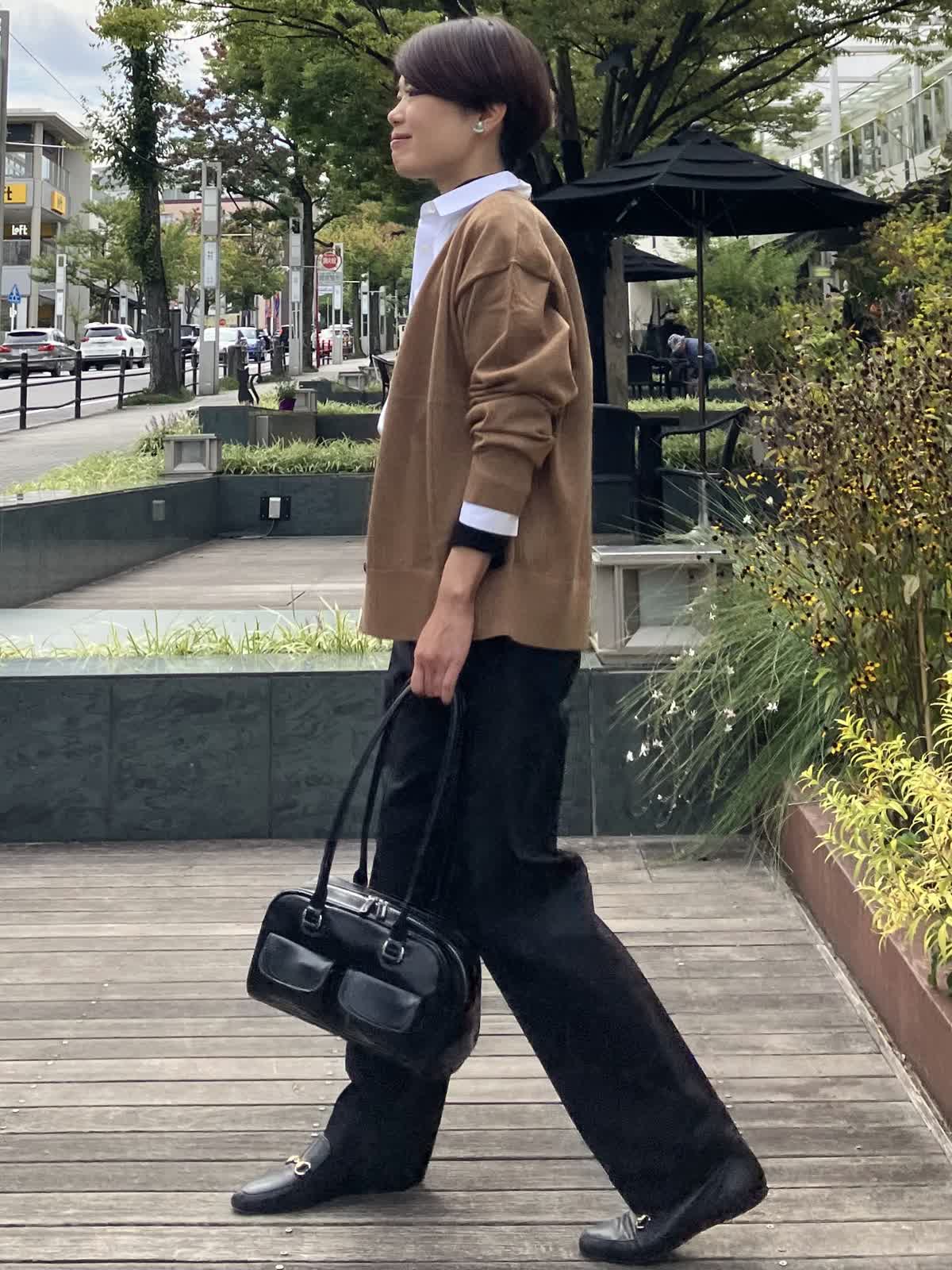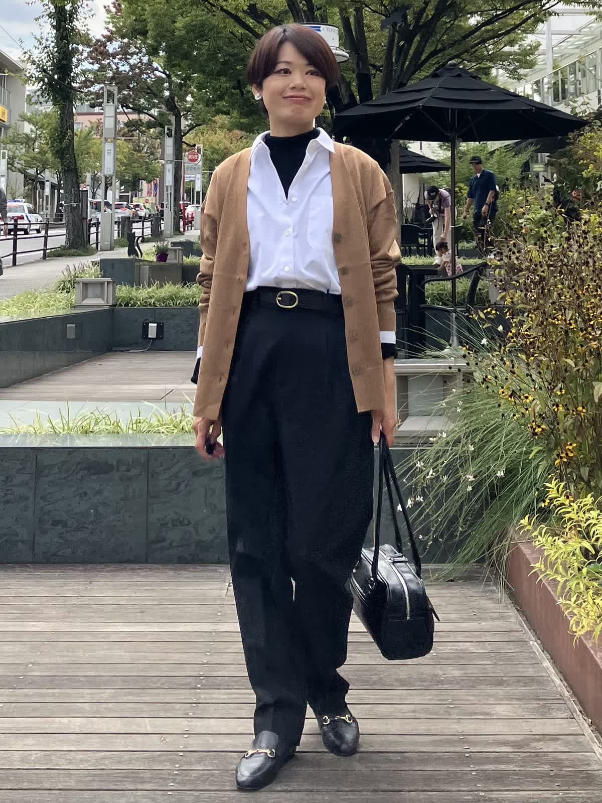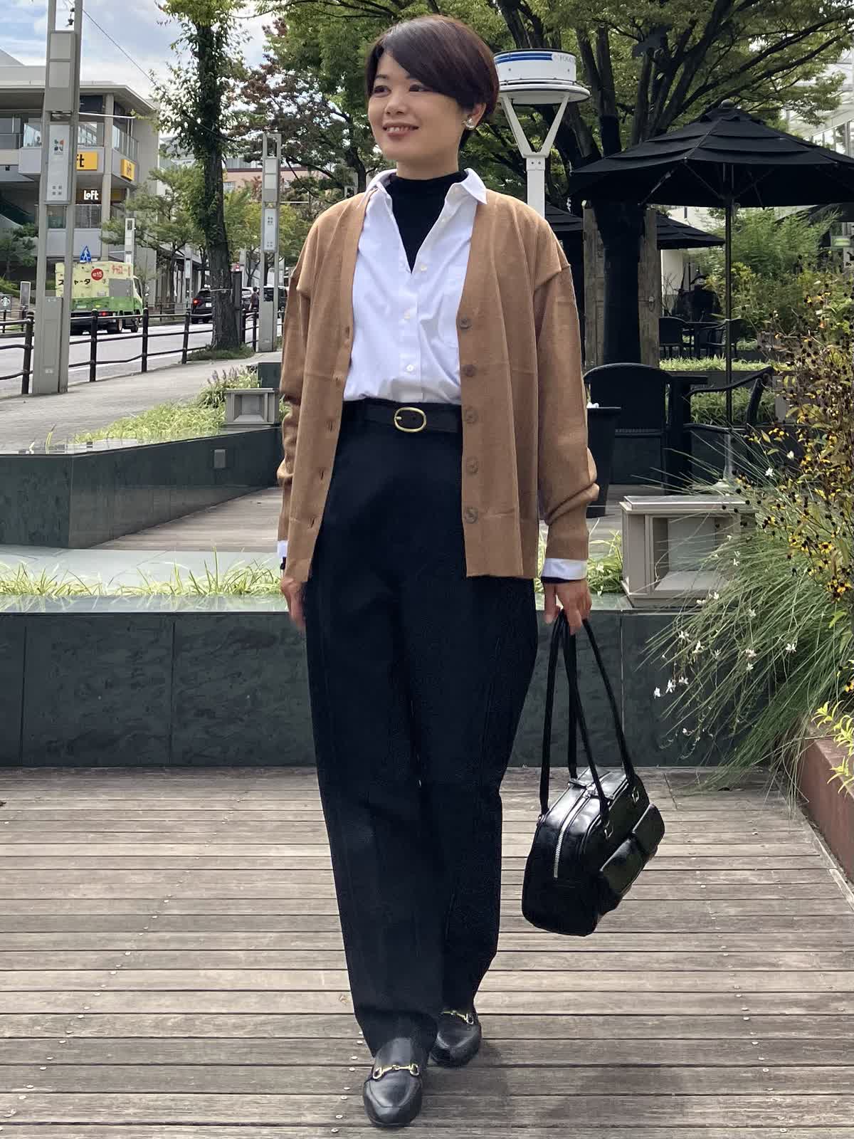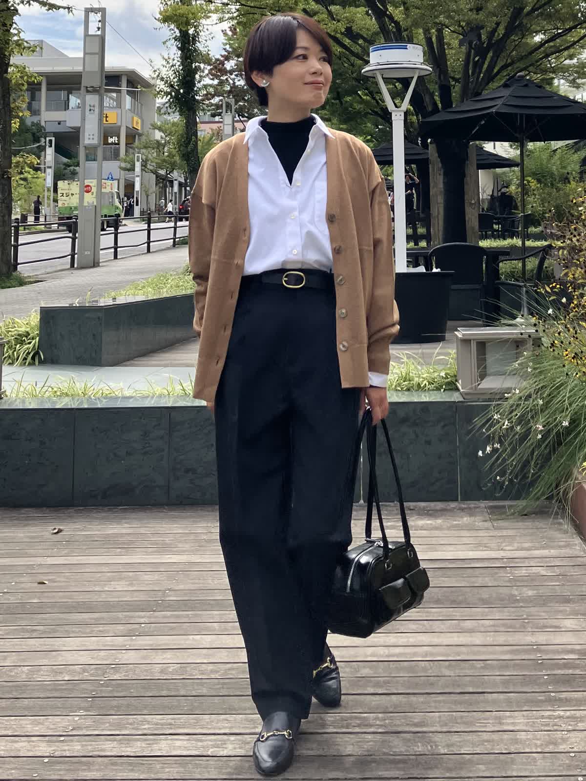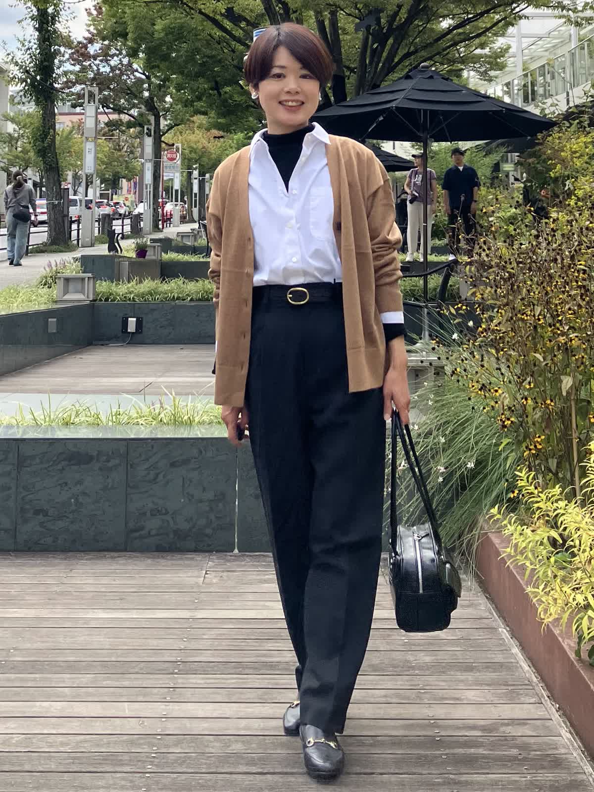 【着用サイズ/カラー】 カーディガン:フリー/キンチャ ブラウス:9号/オフホワイト カットソー:9号/ブラック パンツ:7号/ブラック 秋の風が心地よくなってきましたね。 気温調整に大活躍のラメカーディガンをプラスして 『しごでき』通勤スタイル