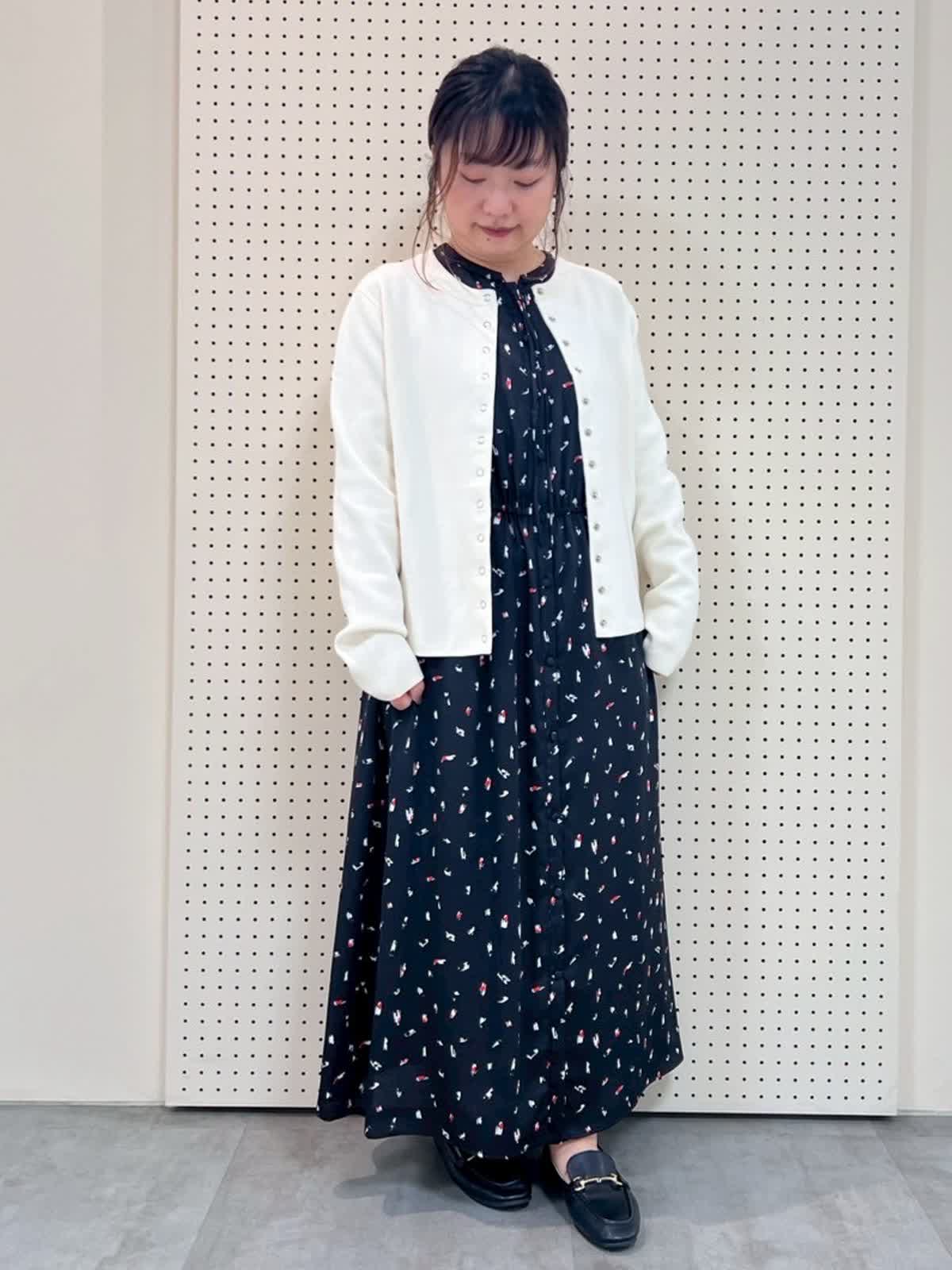 【着用サイズ/カラー】カーディガン:フリー/オフホワイト ワンピース:フリー/ブラック 秋のお出かけコーディネート。ワンピースは背が低い方でもお直し無しで着られます。涼しくなってきたのでカーディガンを羽織っても素敵です。羽織るものを変えれば、今の時期から長く着られます