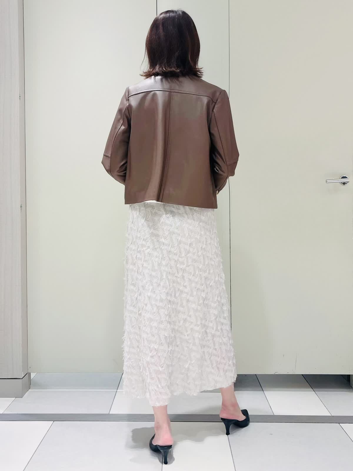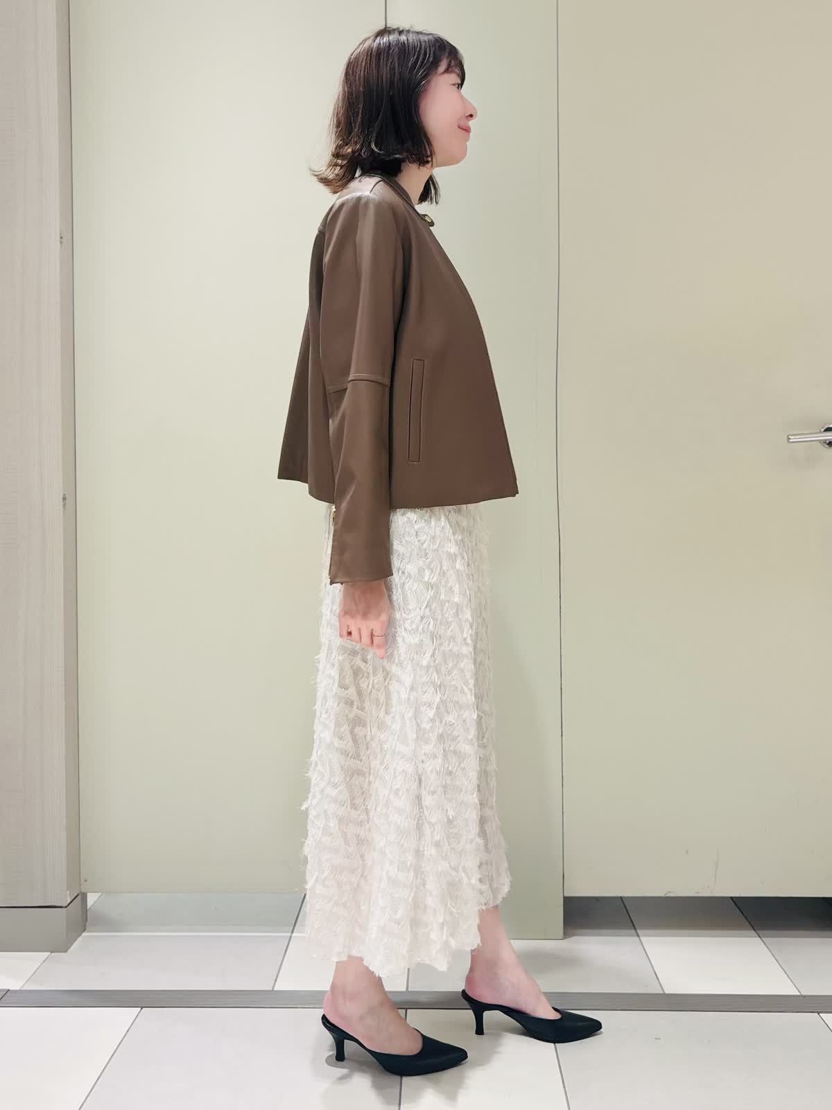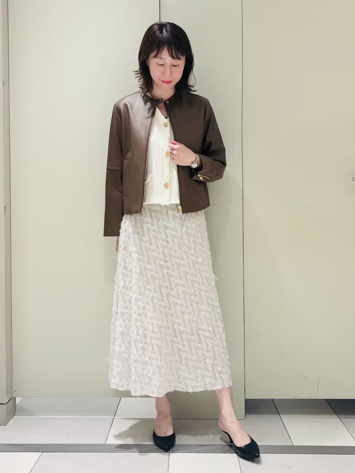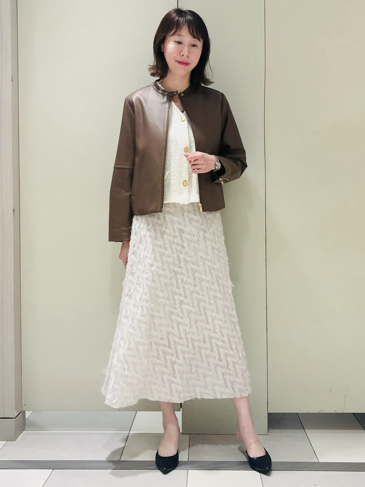【着用サイズ/カラー】ジャケット:9号/ブラウン ニット:9号/ホワイト スカート:9号/グレー キャミソール:9号/スミクロ 秋らしいレザーにツイードジレとフェザースカートを合わせたメリハリのコーディネートです。 お仕事からお出かけまで対応できるスタイルです。