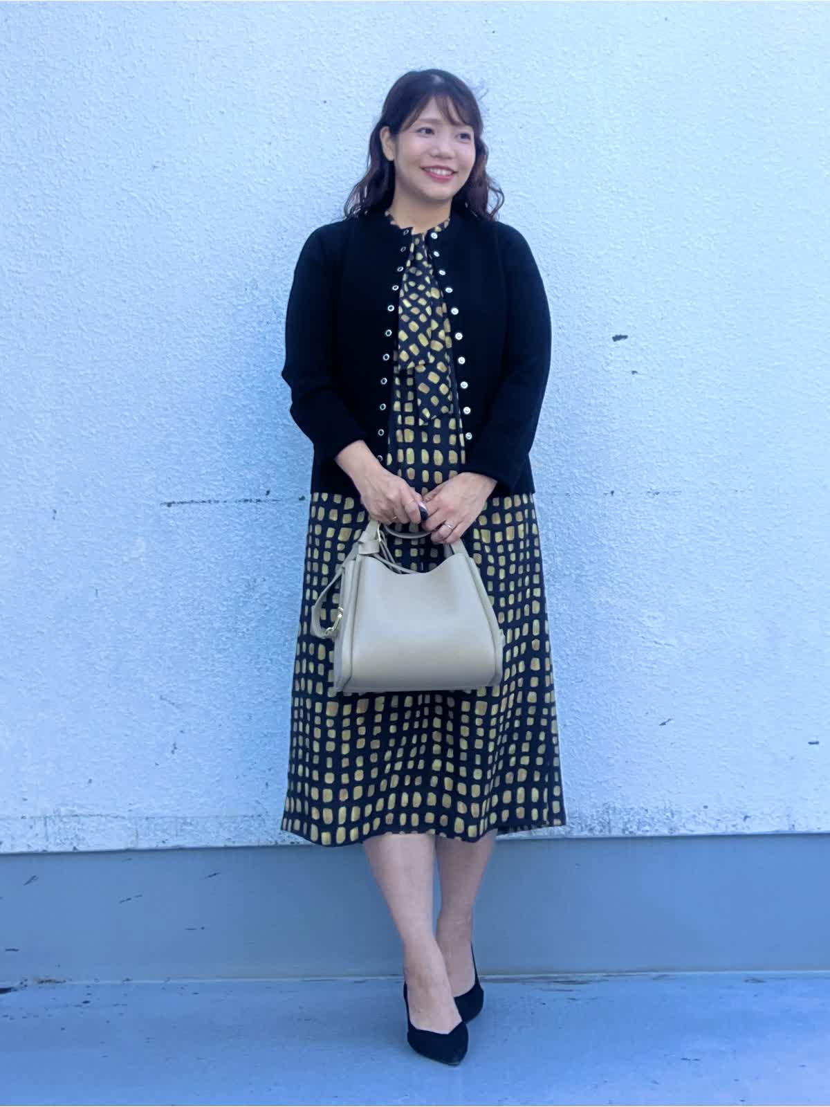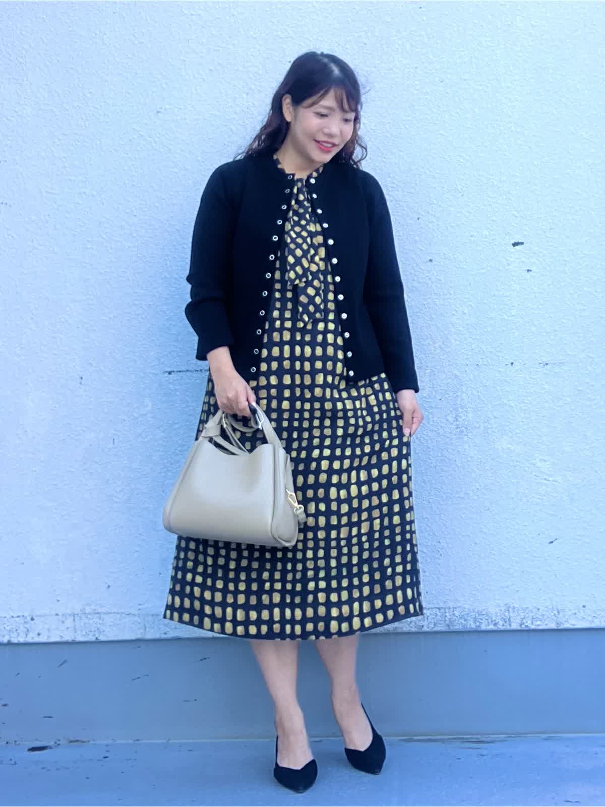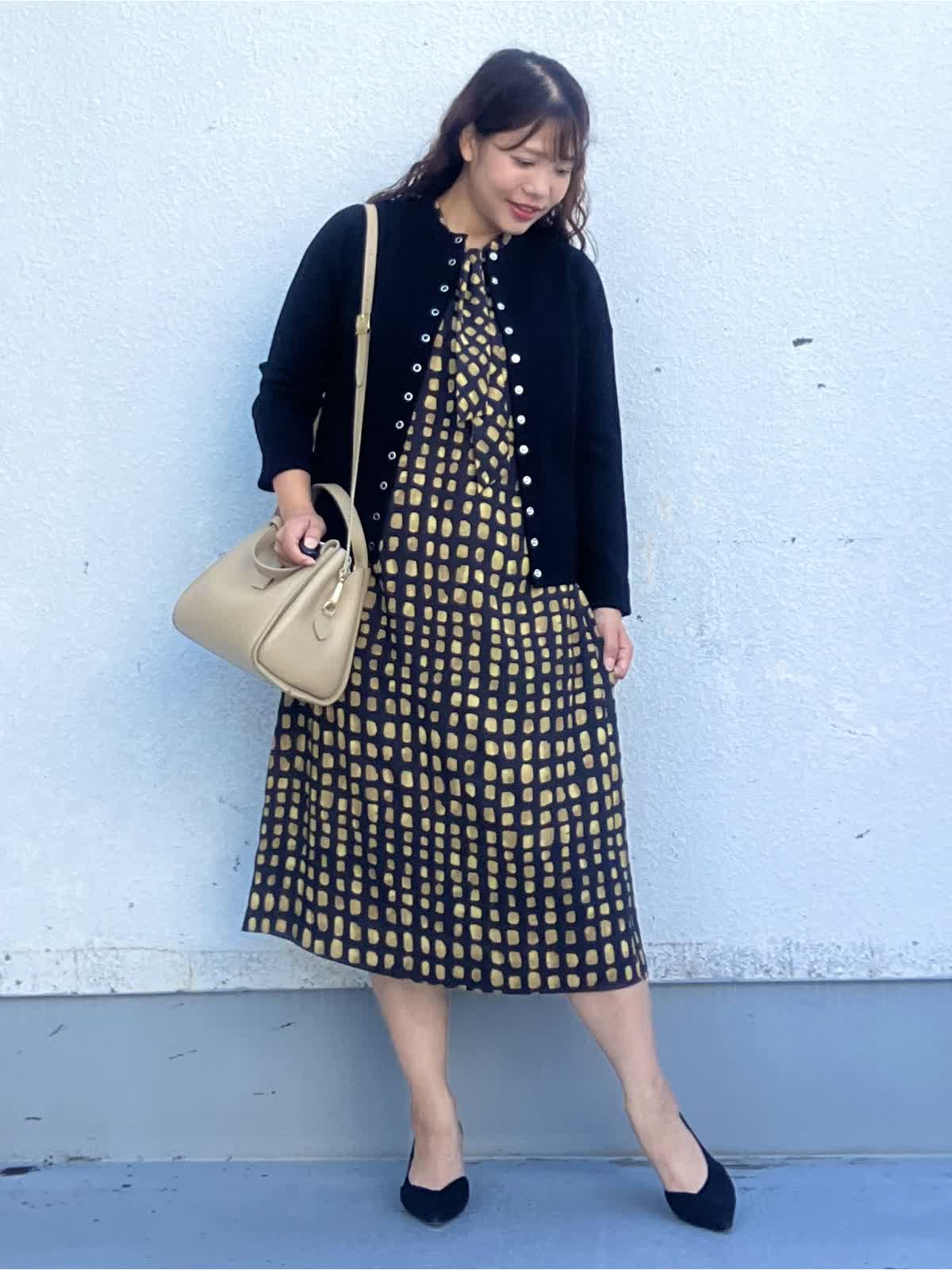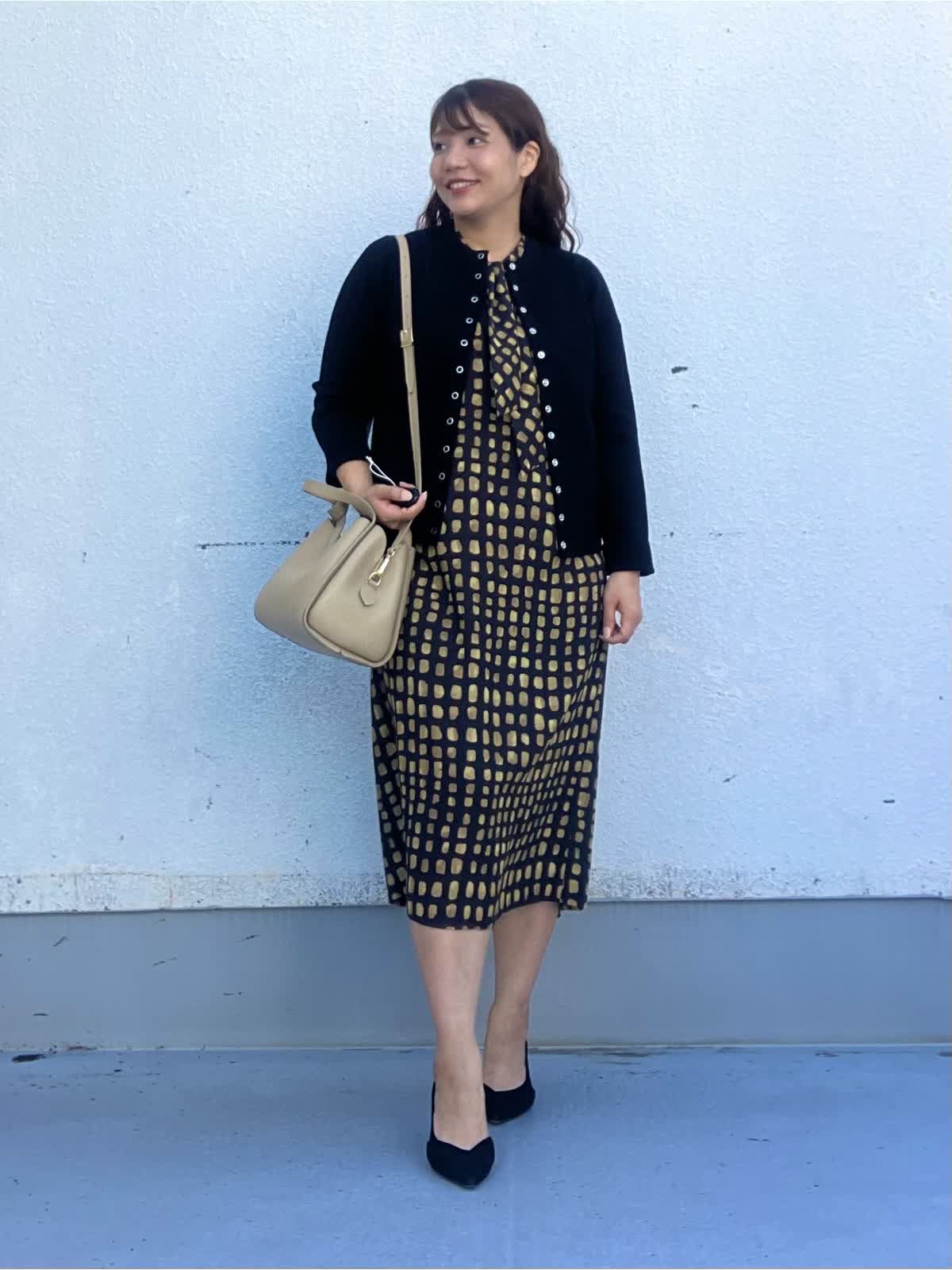【着用アイテム:カラー/サイズ】 カーディガン:ブラック/フリー ワンピース:ブラック/9号 大柄ですが落ち着いたカラーのプリントワンピースはドライタッチな素材でサラッとしたシワになりにくいとても着心地の良いワンピースです。 カーディガンに黒を合わせてシックなコーディネートにしました。