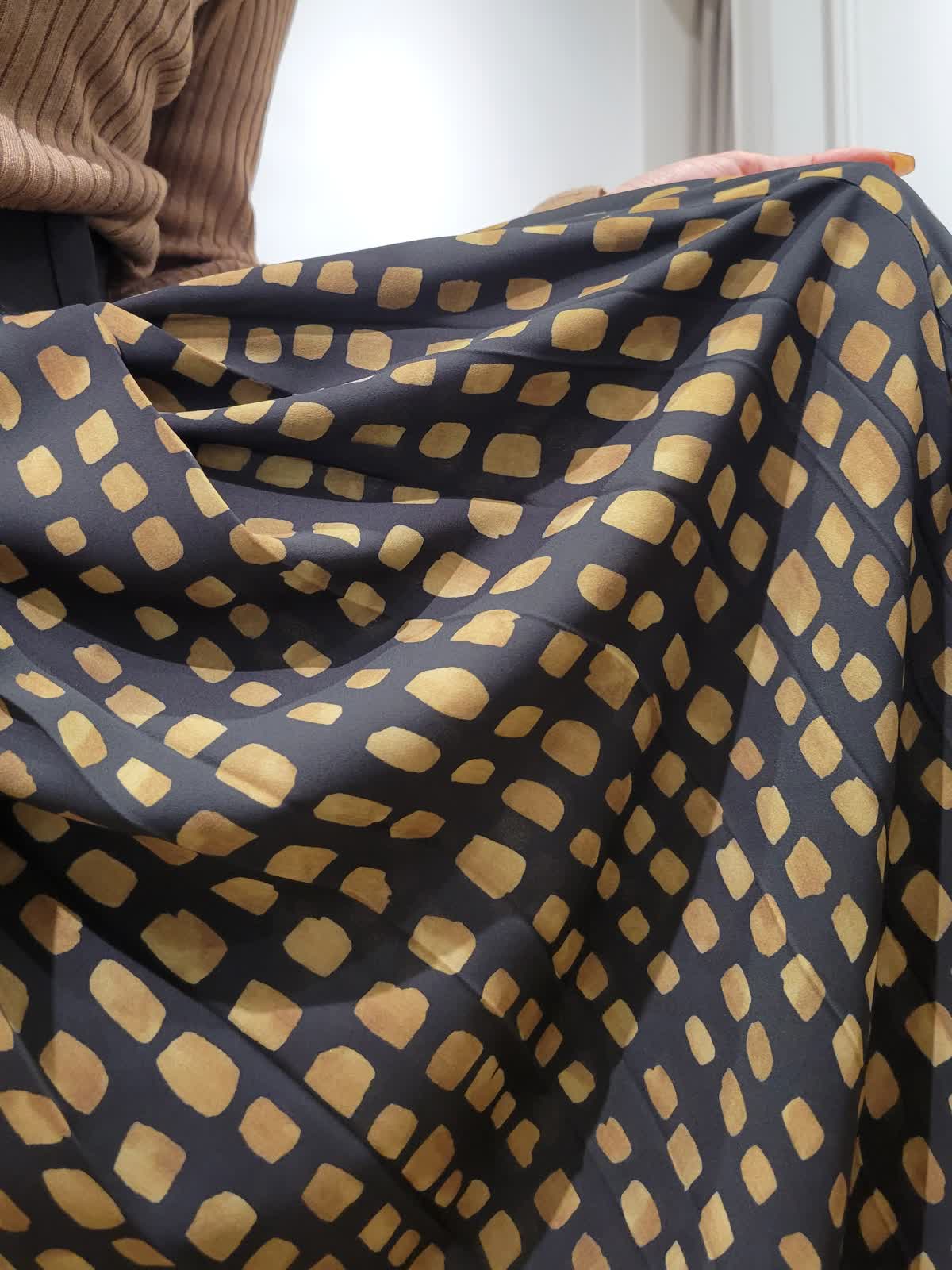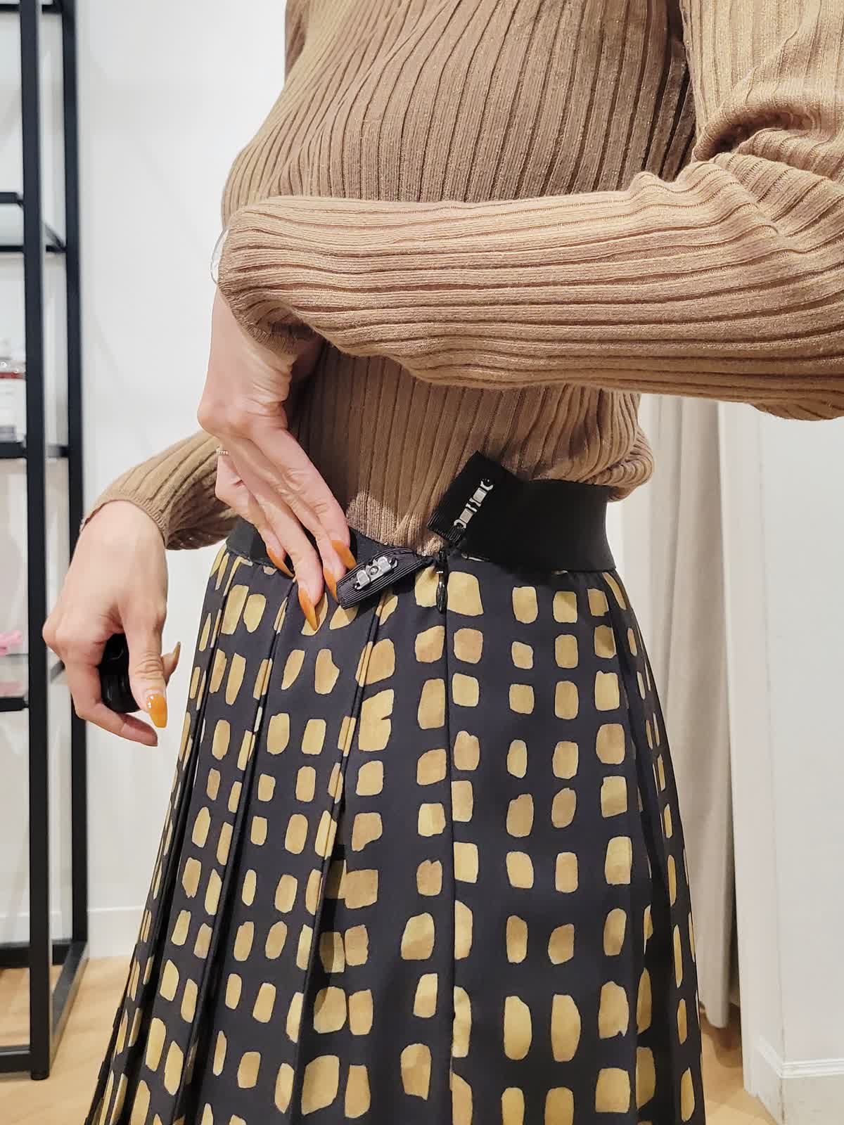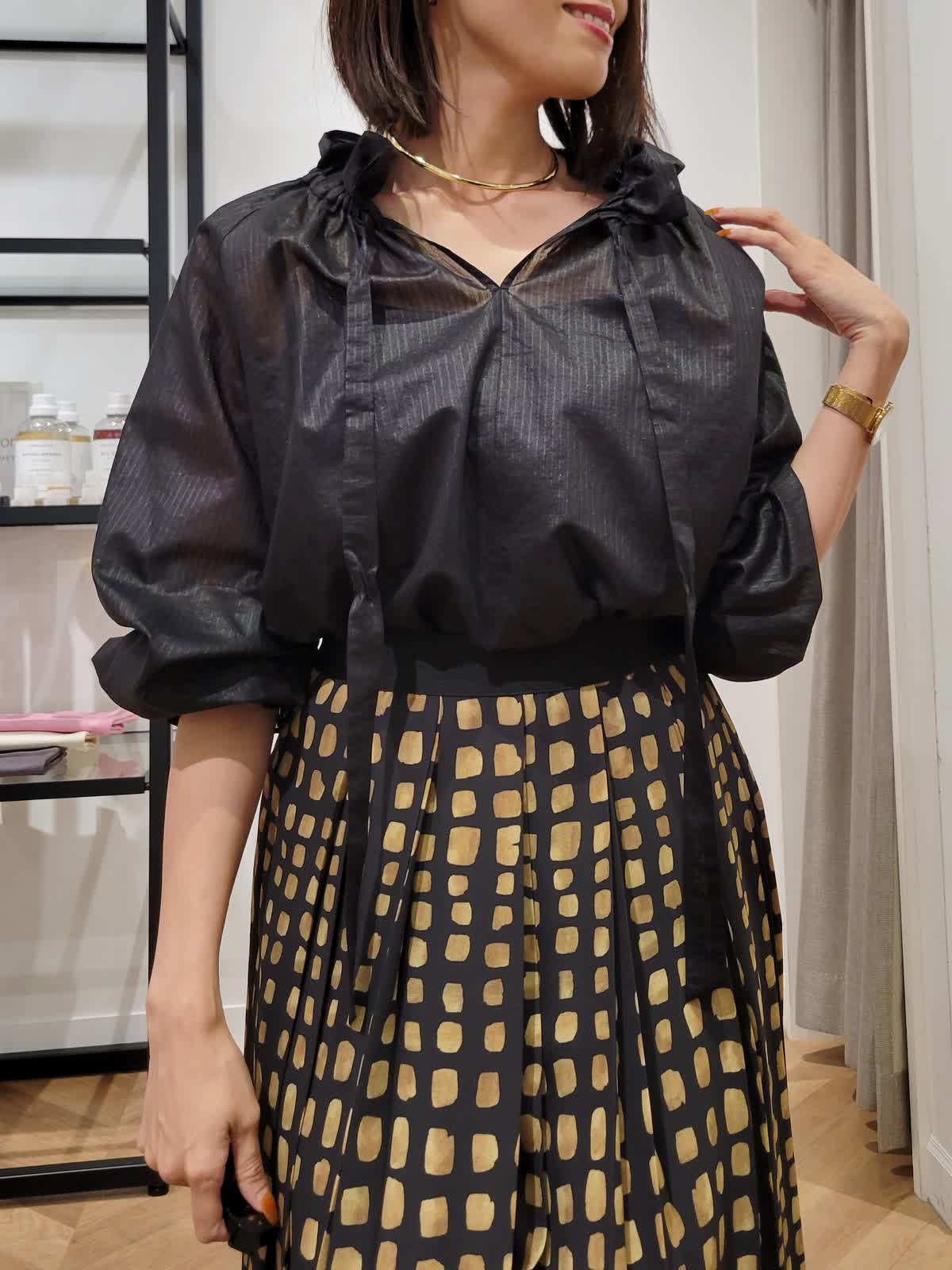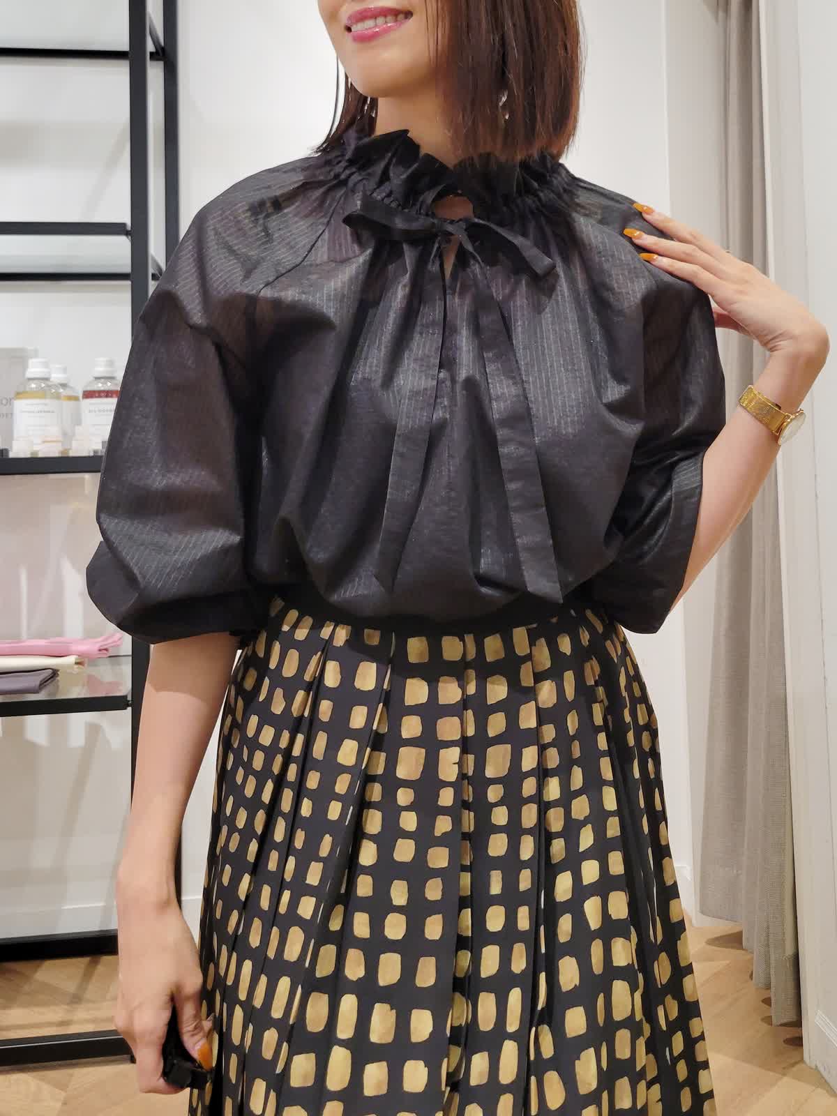 【着用サイズ】ブラウス:ブラック:9号 スカート:ブラック:7号 ニット:モカチャ:9号 華やか秋スタイル。 シアー感のあるブラウスはさりげないストライプ柄。首もとのフリルデザインも素敵でリボンをくくったりデコルテを上品に見せたりとお好みの着方に。デフォルメチェック柄のスカートと合わせてみました。プリーツデザインでスッキリと落ち感のあるシルエットに。ウエストが総ゴムなので美しく楽にお使いいただけます。お素材的にもシーズンレスなのもありがたい。(ペチコート付き)
