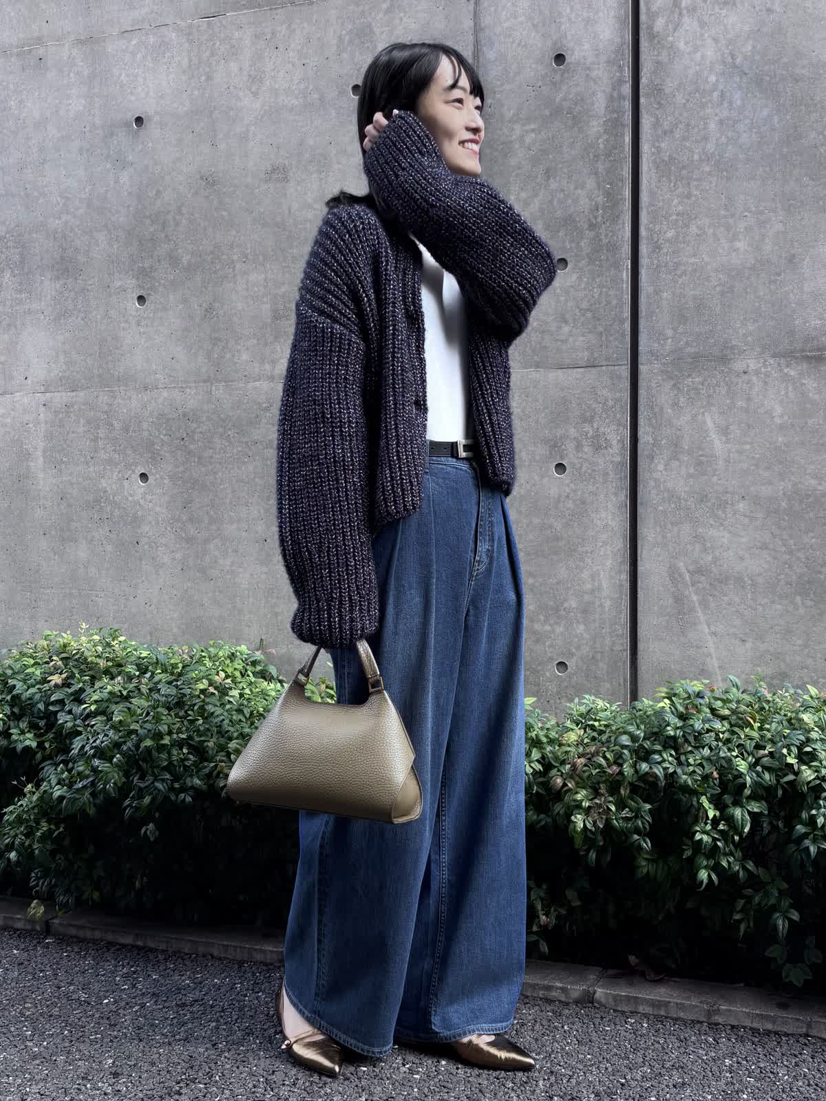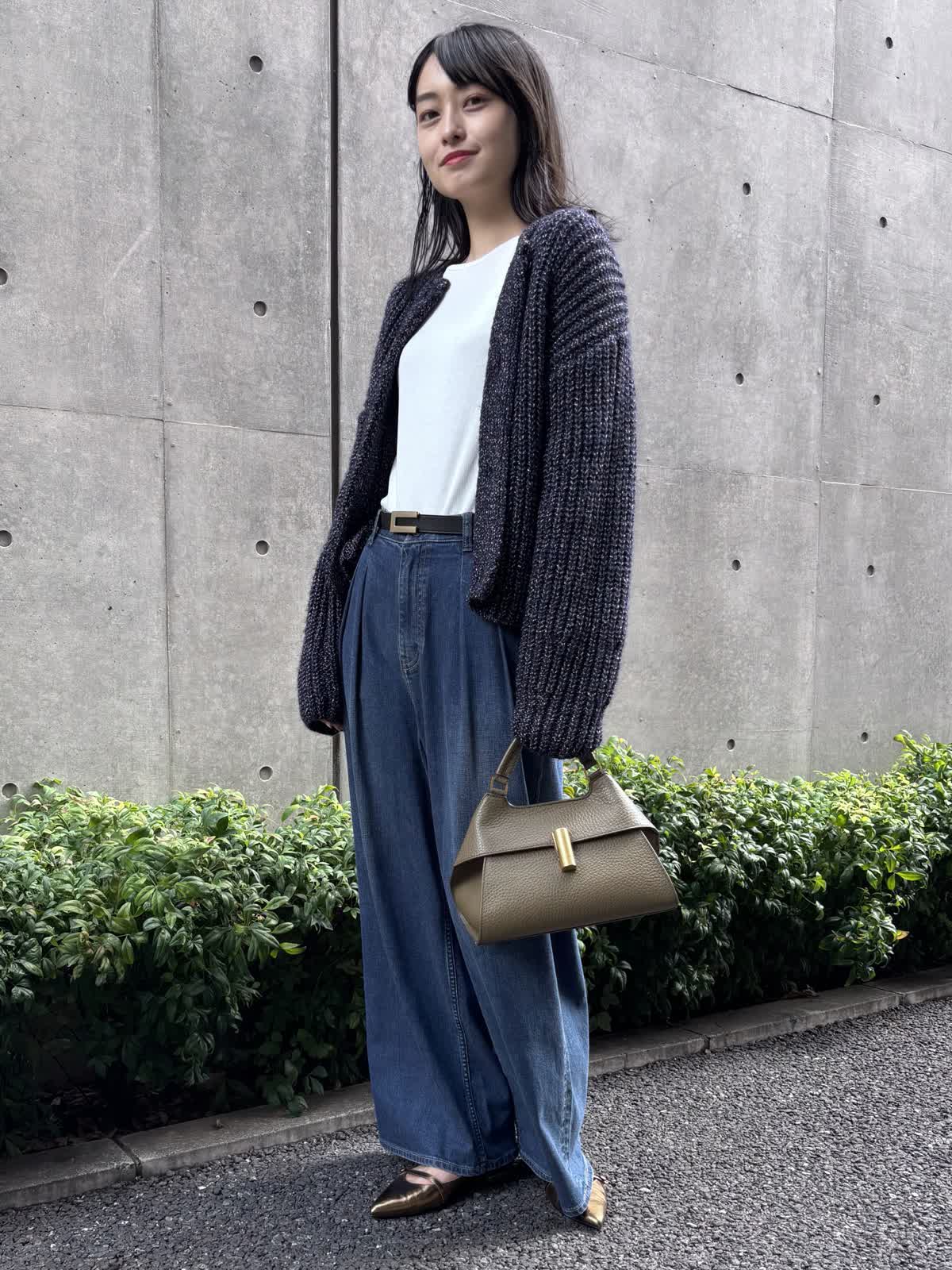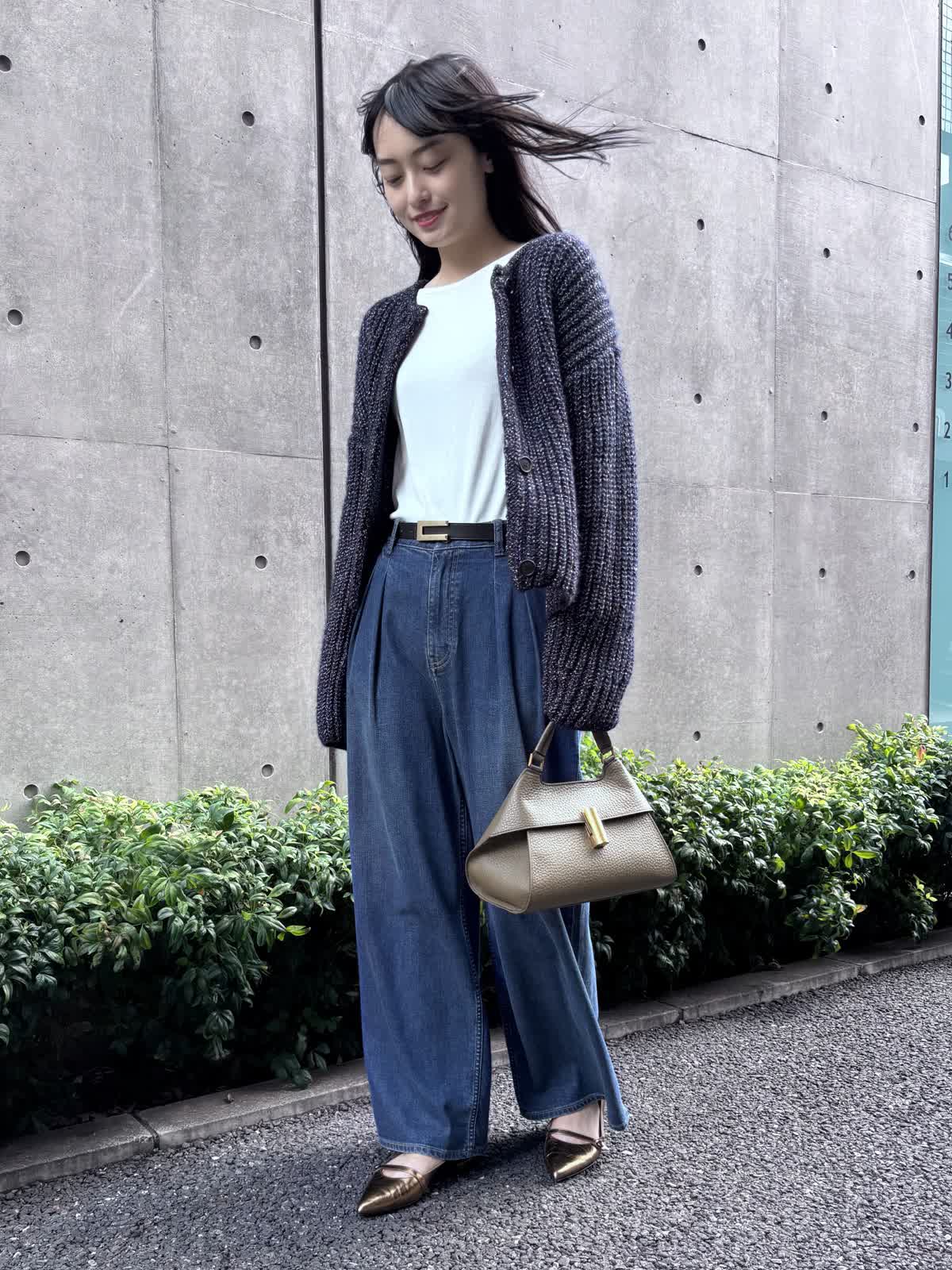 【着用カラー】カーディガン:ネイビー、パンツ:インディゴ、カットソー:オフホワイト 【着用サイズ】カーディガン:9号、パンツ:9号、カットソー:9号 コーディネートのテーマは休日のお出かけコーデです。カーディガンは少し厚手の素材で、少し寒くなる時期まで、これ1つでお出かけすることができます。程よく入っているラメがコーディネートのアクセントになってくれるのも嬉しいポイント。長めの袖と少し短めの丈感が今っぽく、オシャレにみせてくれます。パンツはHealthy DENIMのINED別注デニムで、カジュアルながらも上品なコーディネートを意識してみました。インナーにはシアー感のあるカットソーをチョイス。心地よい涼しさの今の季節にピッタリのコーディネートです。