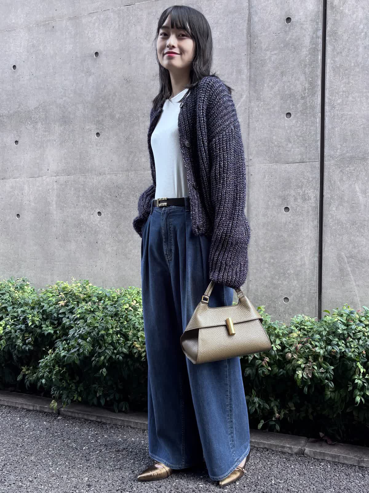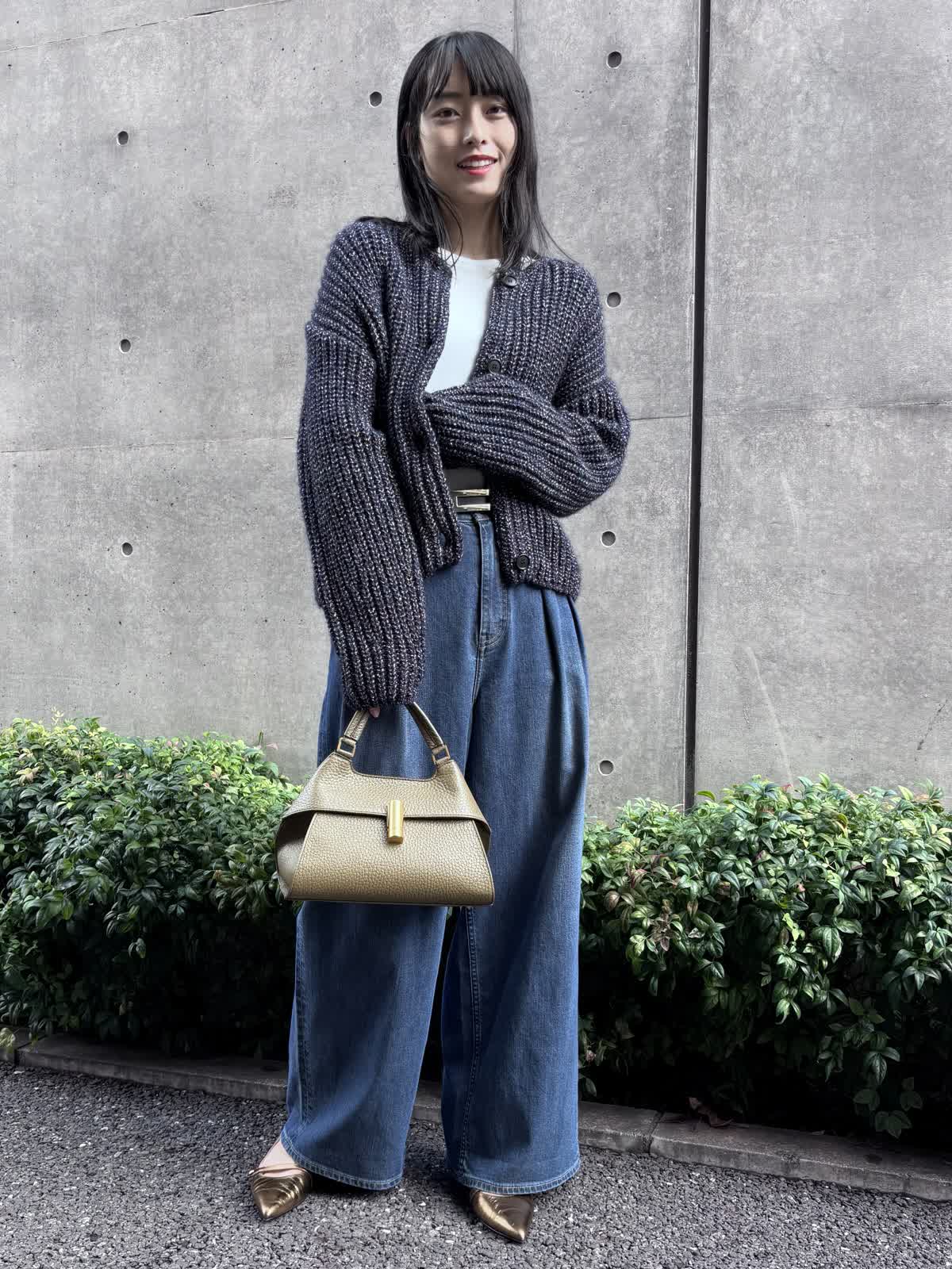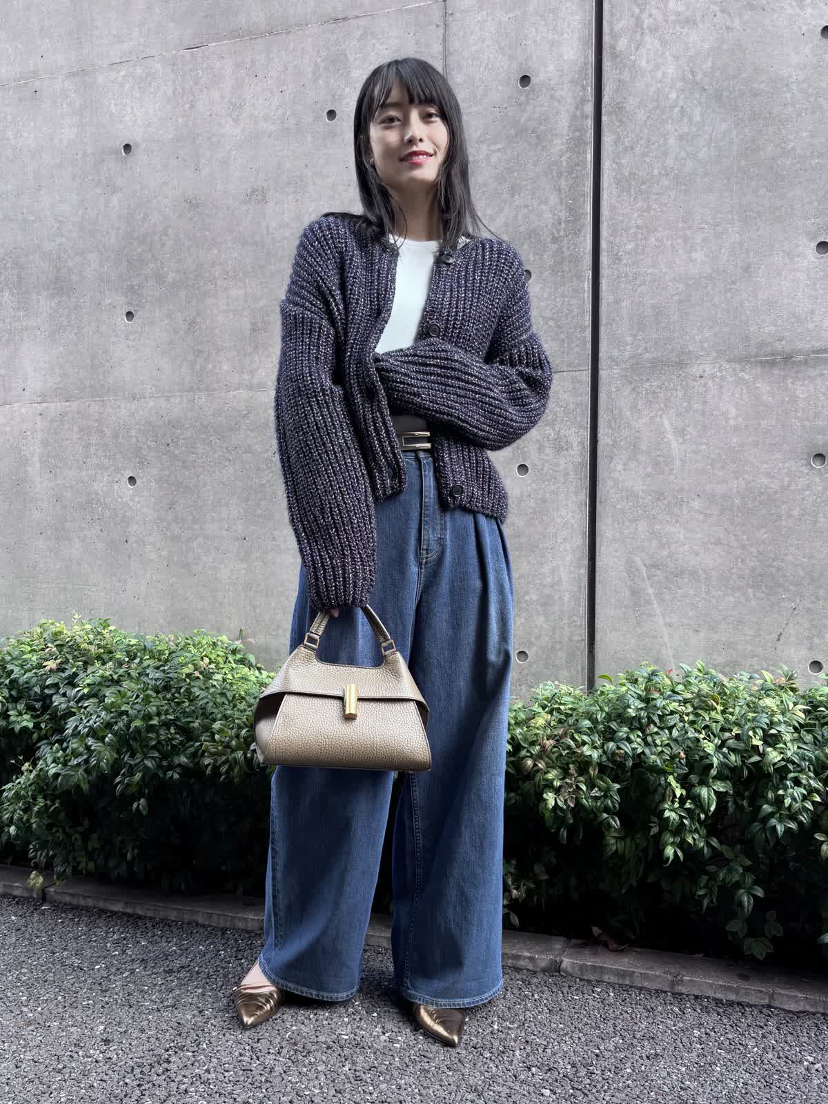 【着用カラー】カーディガン:ネイビー、パンツ:インディゴ、カットソー:オフホワイト 【着用サイズ】カーディガン:9号、パンツ:9号、カットソー:9号 コーディネートのテーマは休日のお出かけコーデです。カーディガンは少し厚手の素材で、少し寒くなる時期まで、これ1つでお出かけすることができます。程よく入っているラメがコーディネートのアクセントになってくれるのも嬉しいポイント。長めの袖と少し短めの丈感が今っぽく、オシャレにみせてくれます。パンツはHealthy DENIMのINED別注デニムで、カジュアルながらも上品なコーディネートを意識してみました。インナーにはシアー感のあるカットソーをチョイス。心地よい涼しさの今の季節にピッタリのコーディネートです。