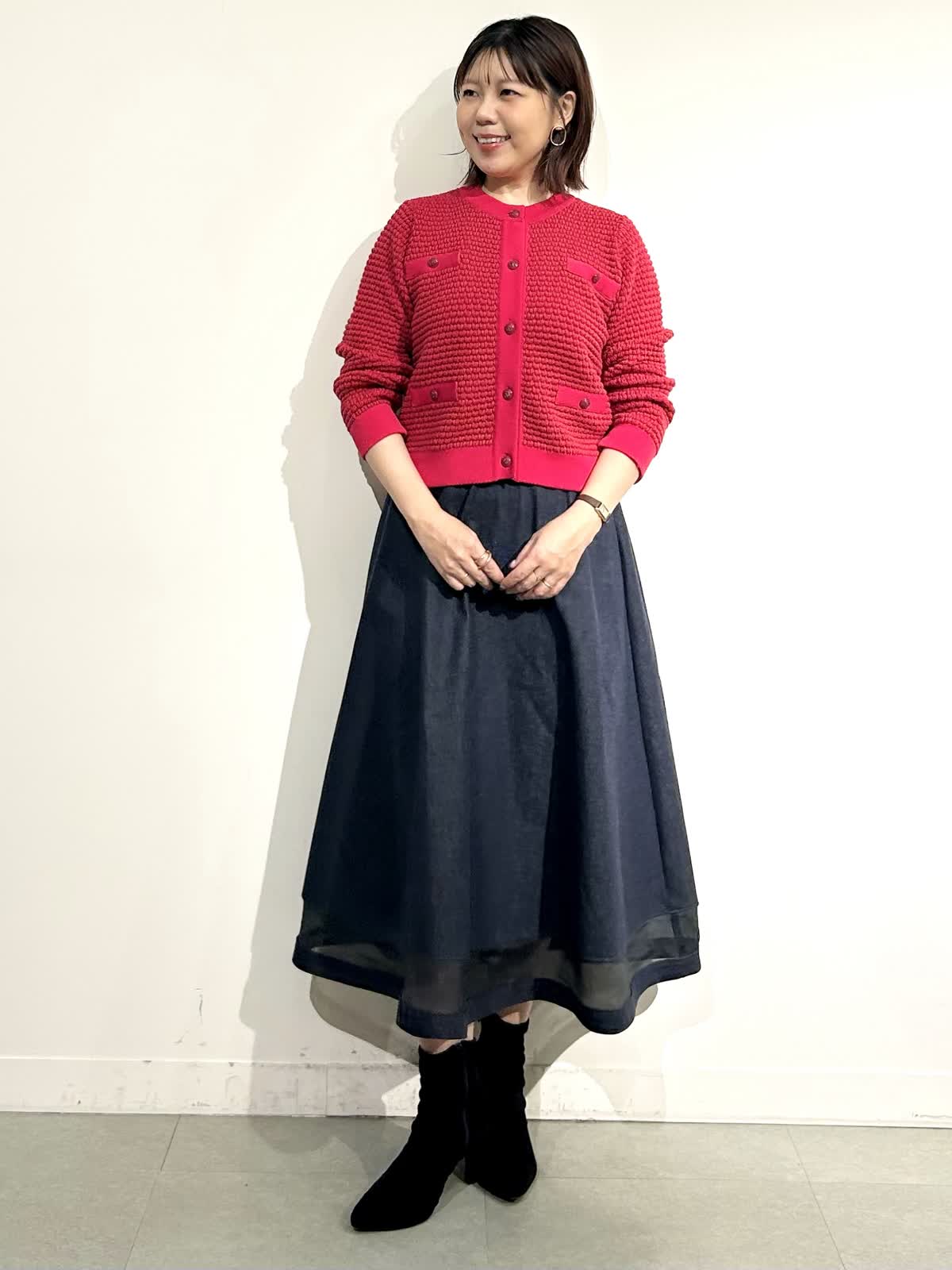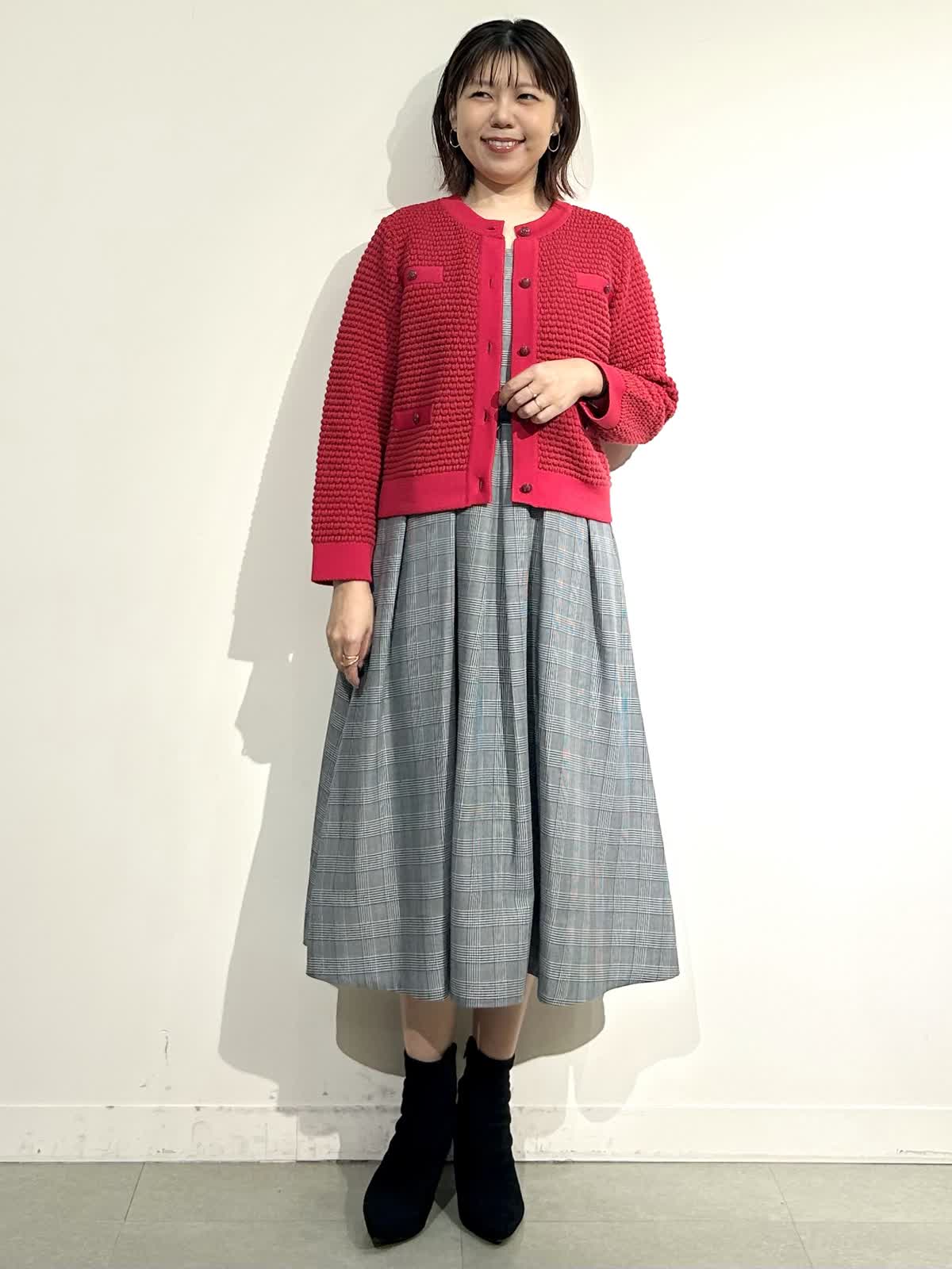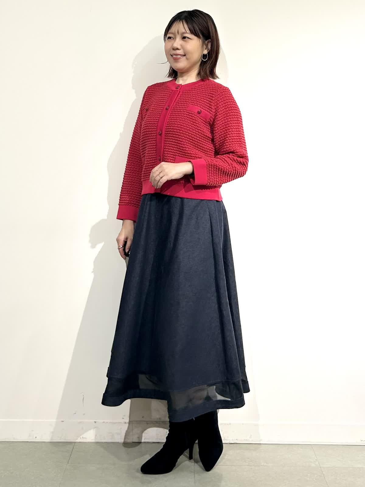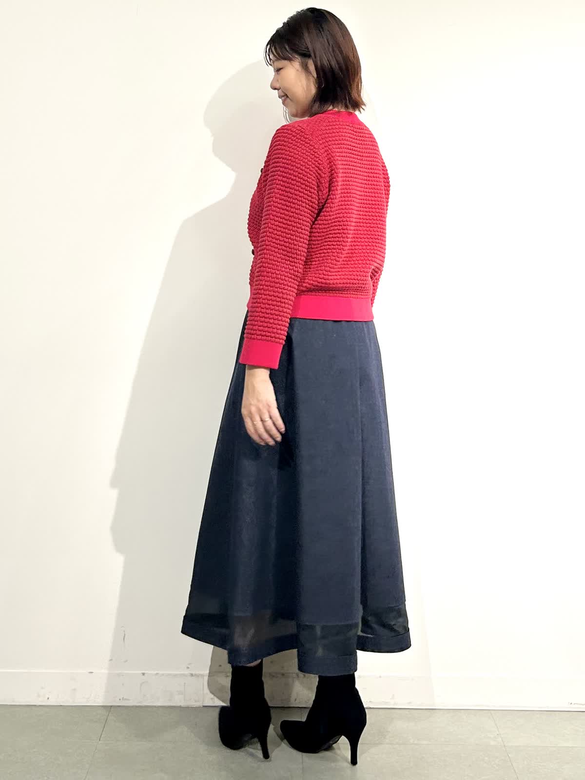 【着用カラー】ニットジャケット:レッド スカート:インディゴ ワンピ: グレンチェク