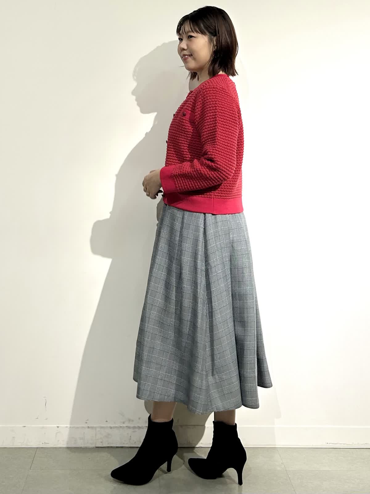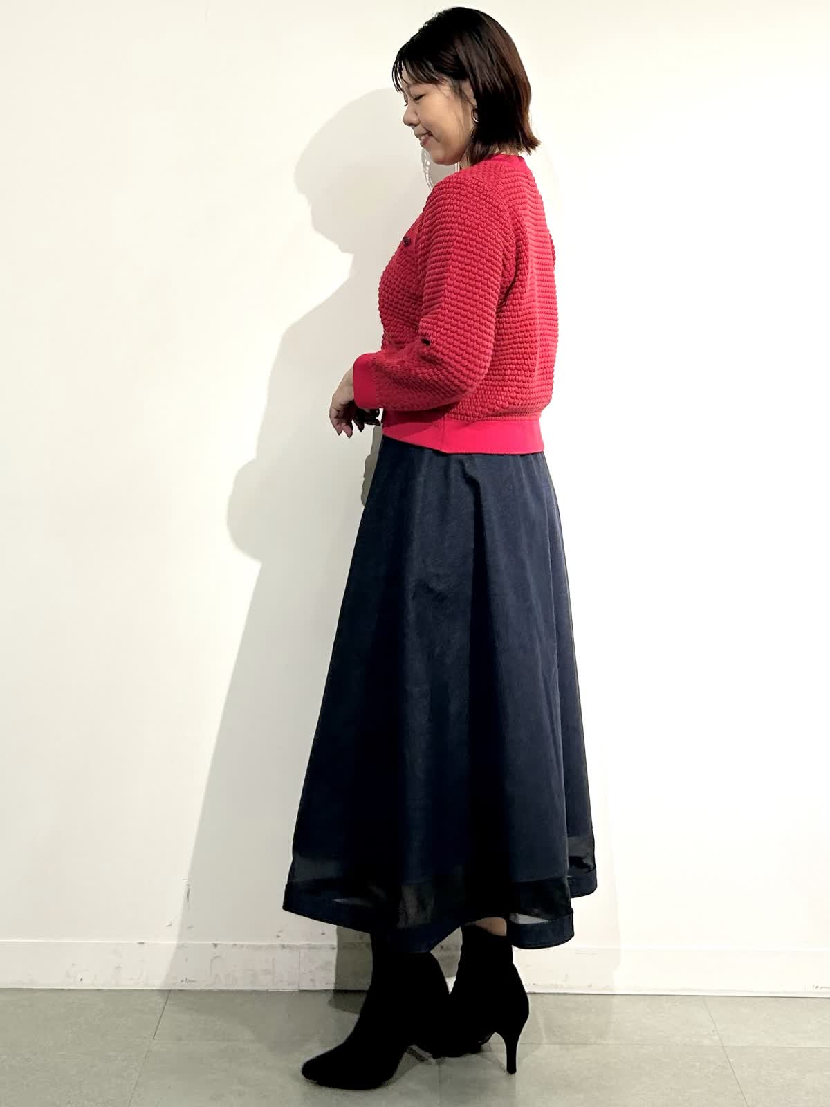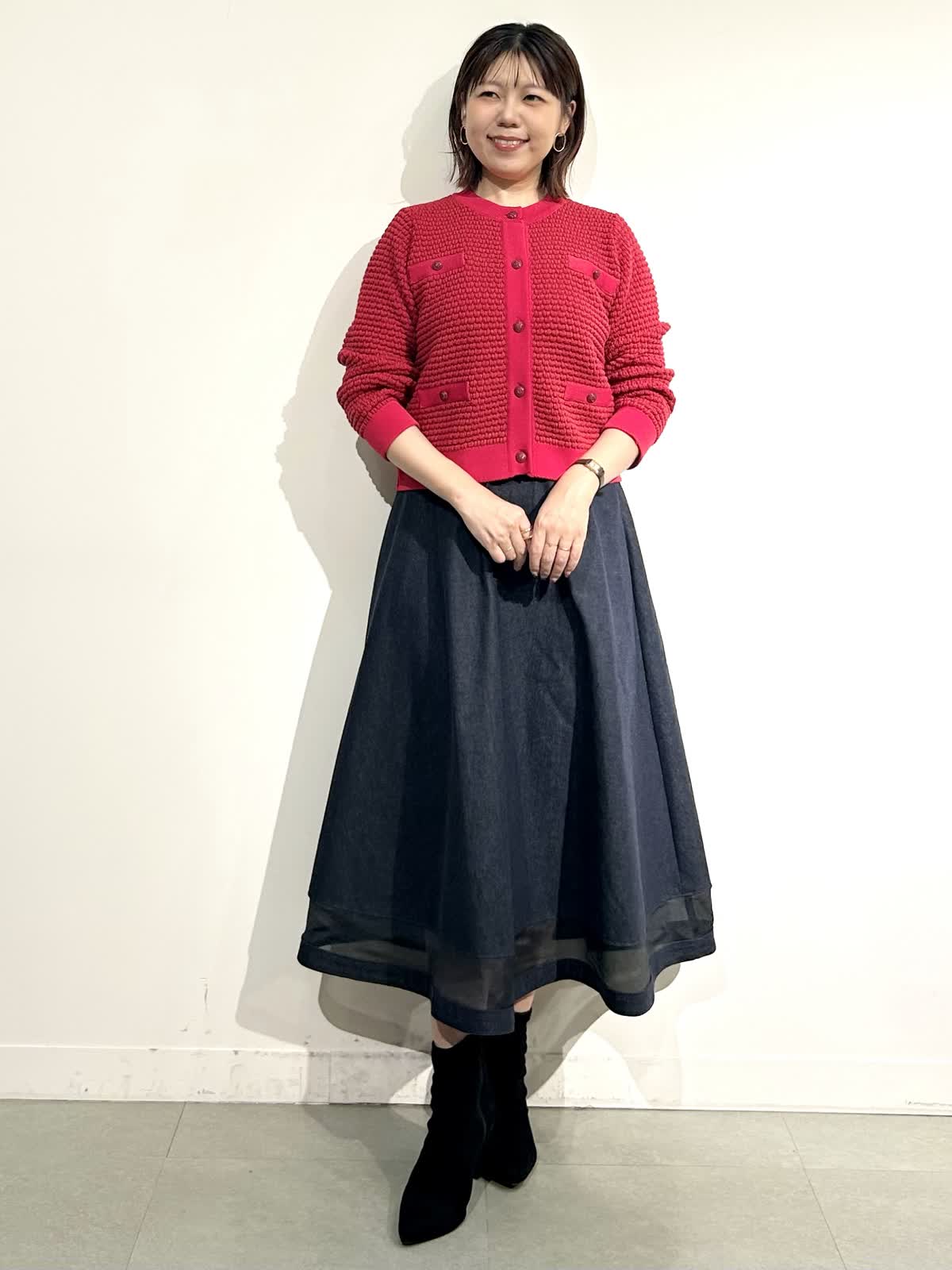 【着用カラー】ニットジャケット:レッド スカート:インディゴ ワンピ: グレンチェク